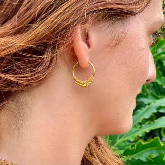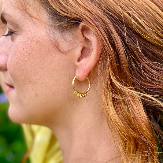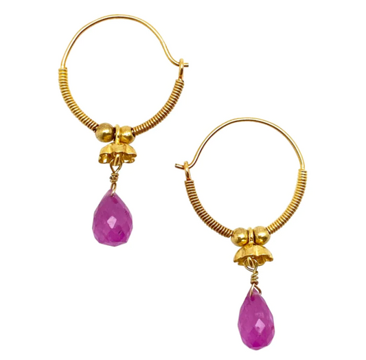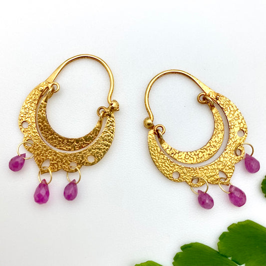 Hand-Hammered Golden Droplet Hoops with Rubies