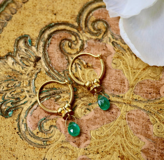 Golden Droplet Hoops with Emerald, Baby (15MM)