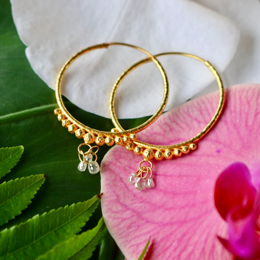 Hand-Hammered Golden Droplet Hoops with Light Diamonds