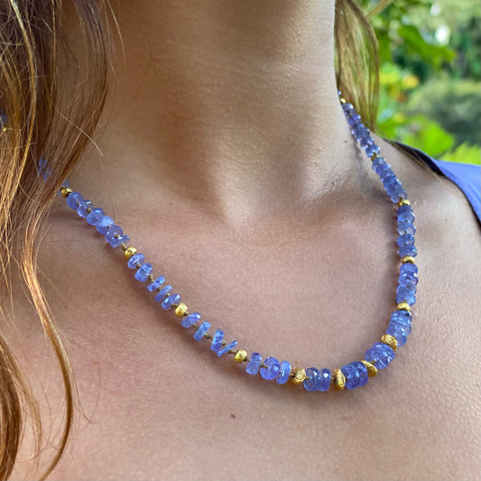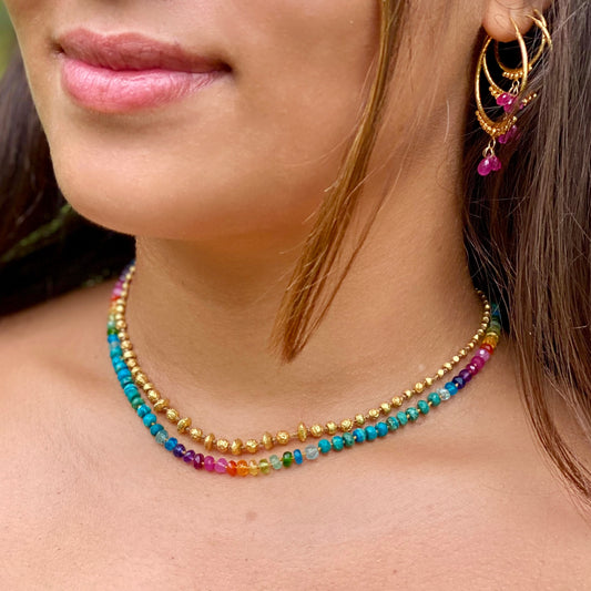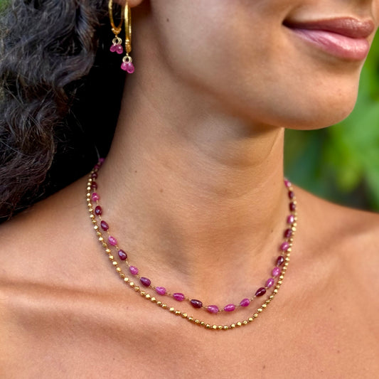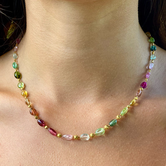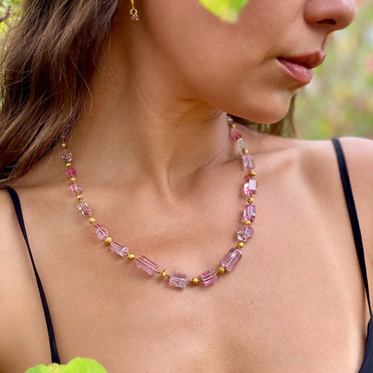 Blue Green Tourmaline Cylinders with Pink Tourmaline & Gold Beads