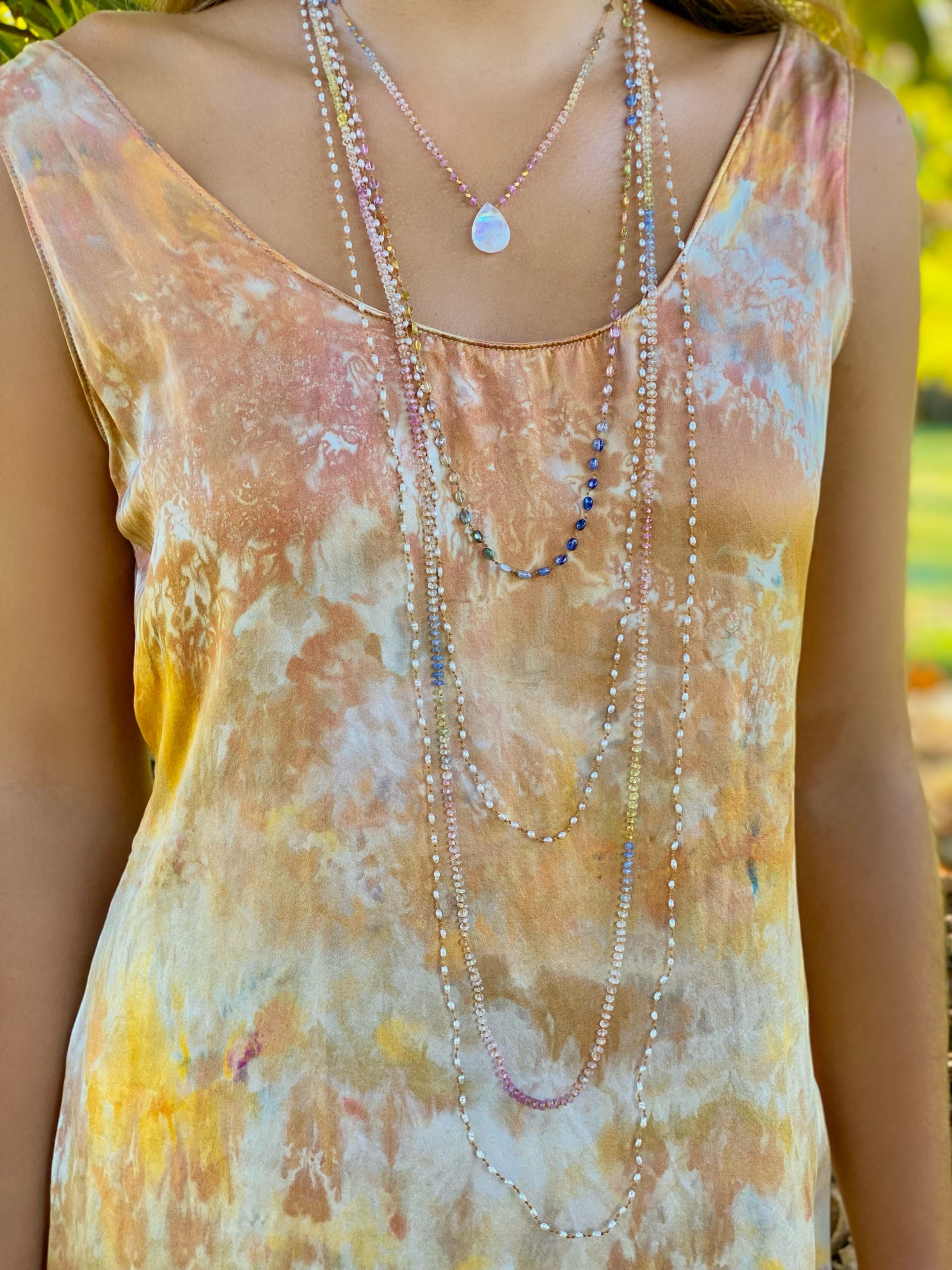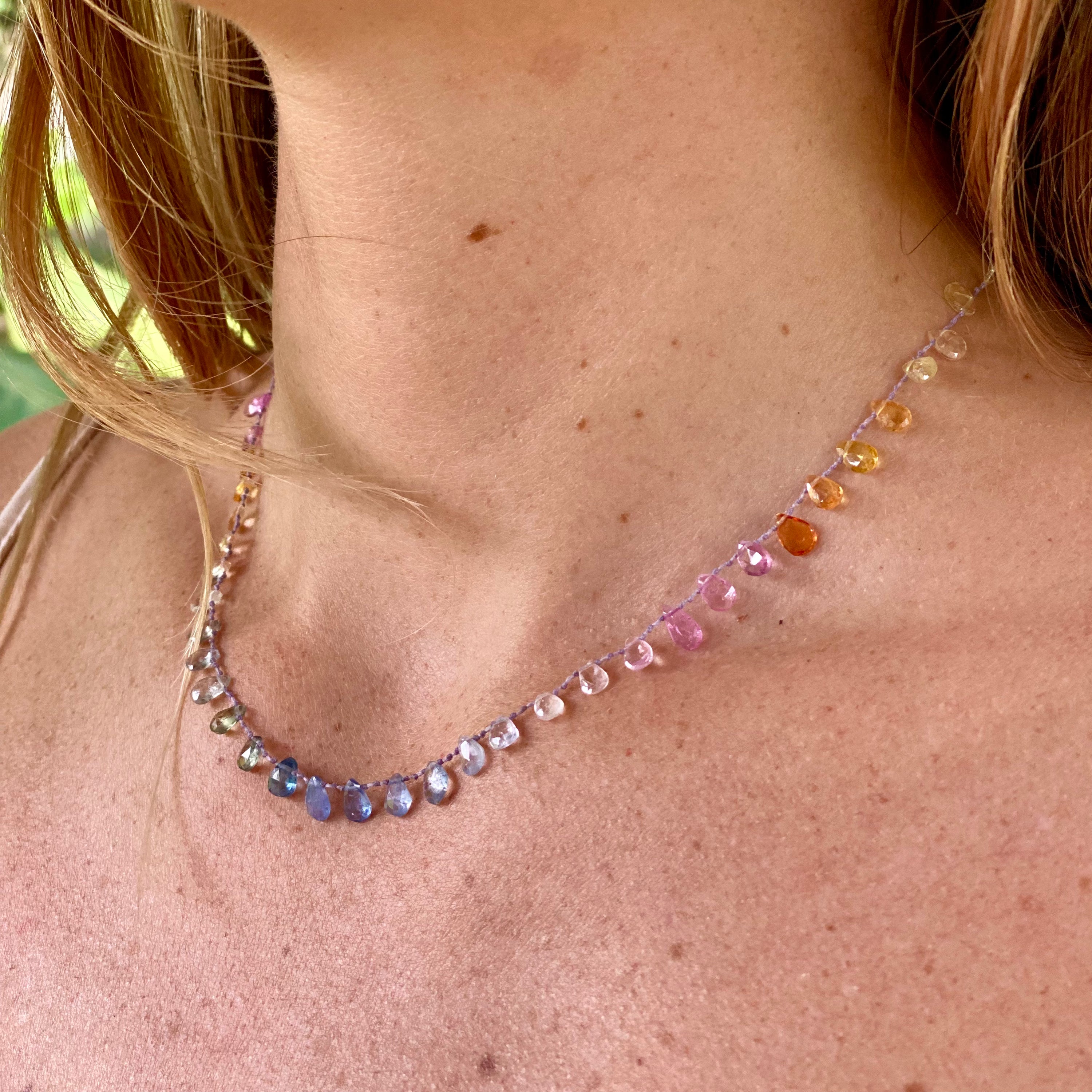 Our pastel sapphires layer beautifully with other pastel sapphires in the LANI collection. Additionally they stack well with diamonds in our HOKU collection or with other pastel pieces from our ALOHI, MALA, AND LEI collections. We particularly enjoy their delicate colors aside the tiny pearl or golden zircon lei.
