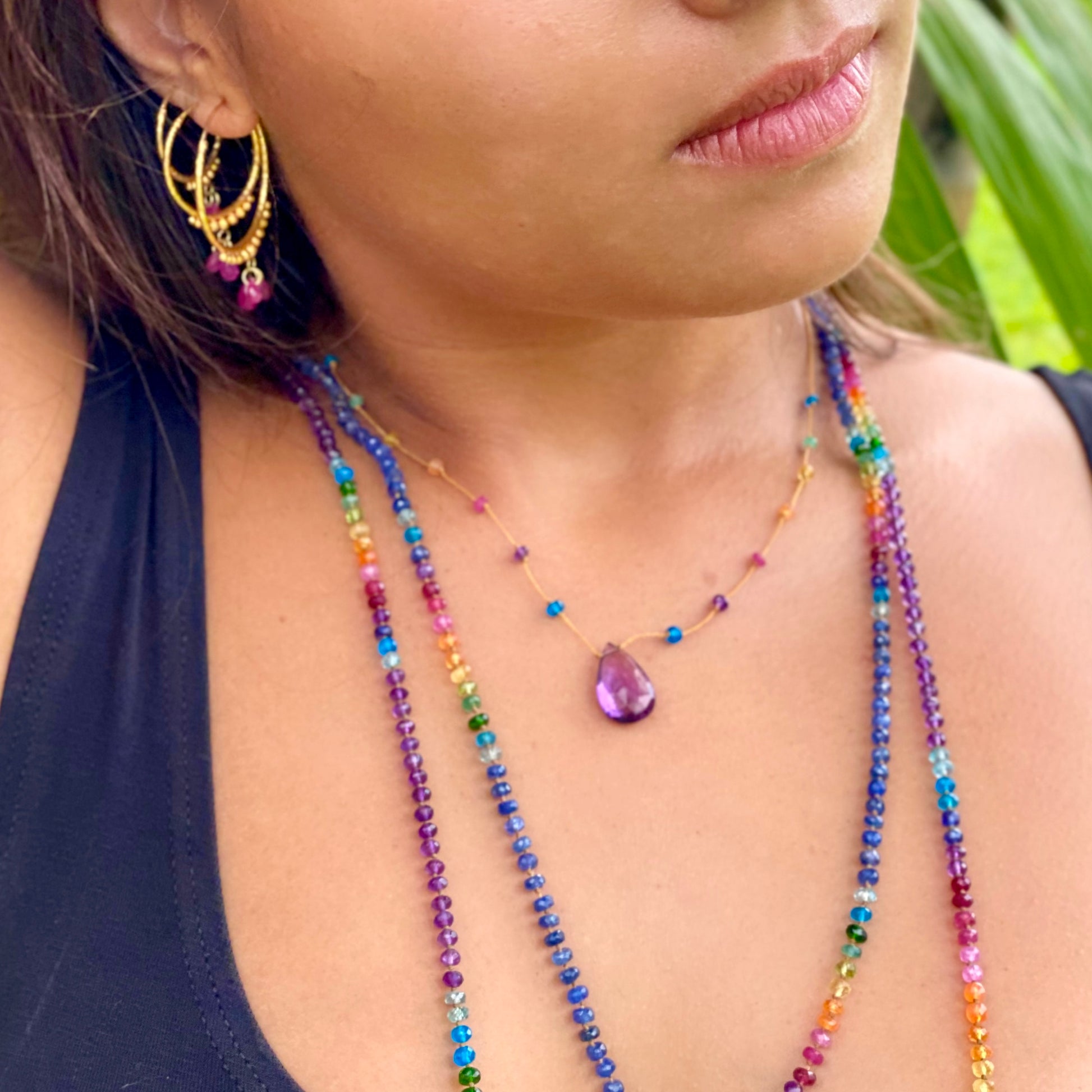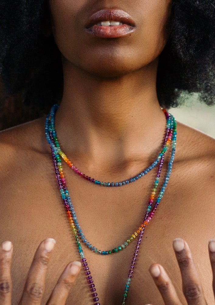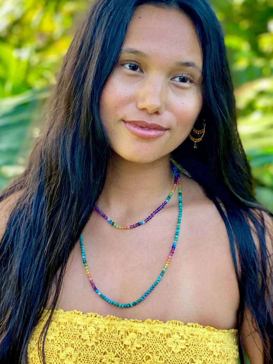 You can layer Rainbow Leis with with both our Alohi or Rainbow Drop collections. They are also a lovely compliment to our Rainbow Mana pieces and can be worn to bring forth dynamic color contrast or chosen mineral emphasis.