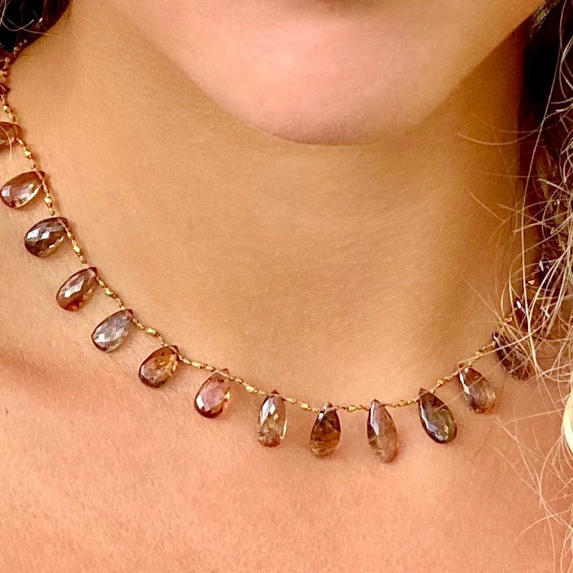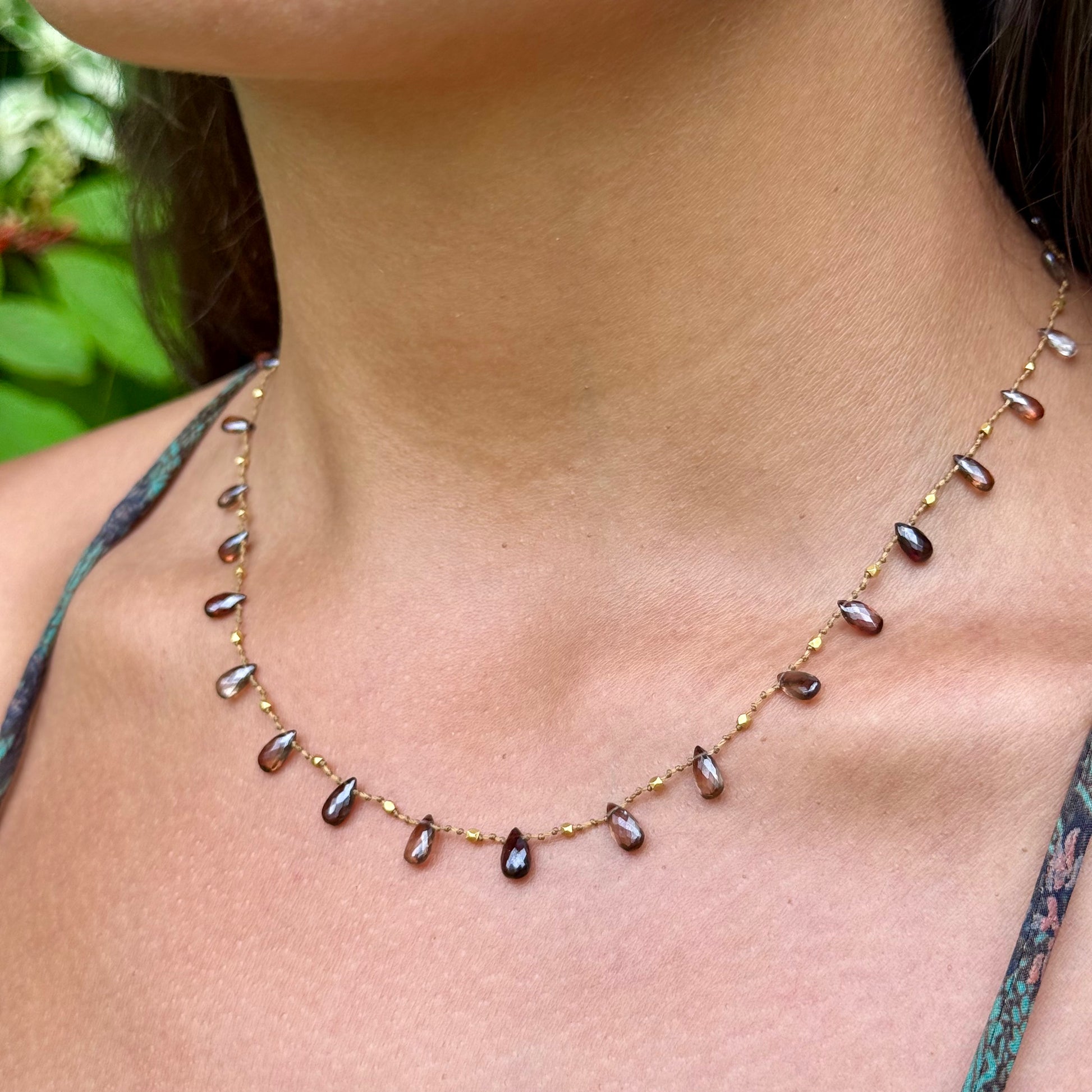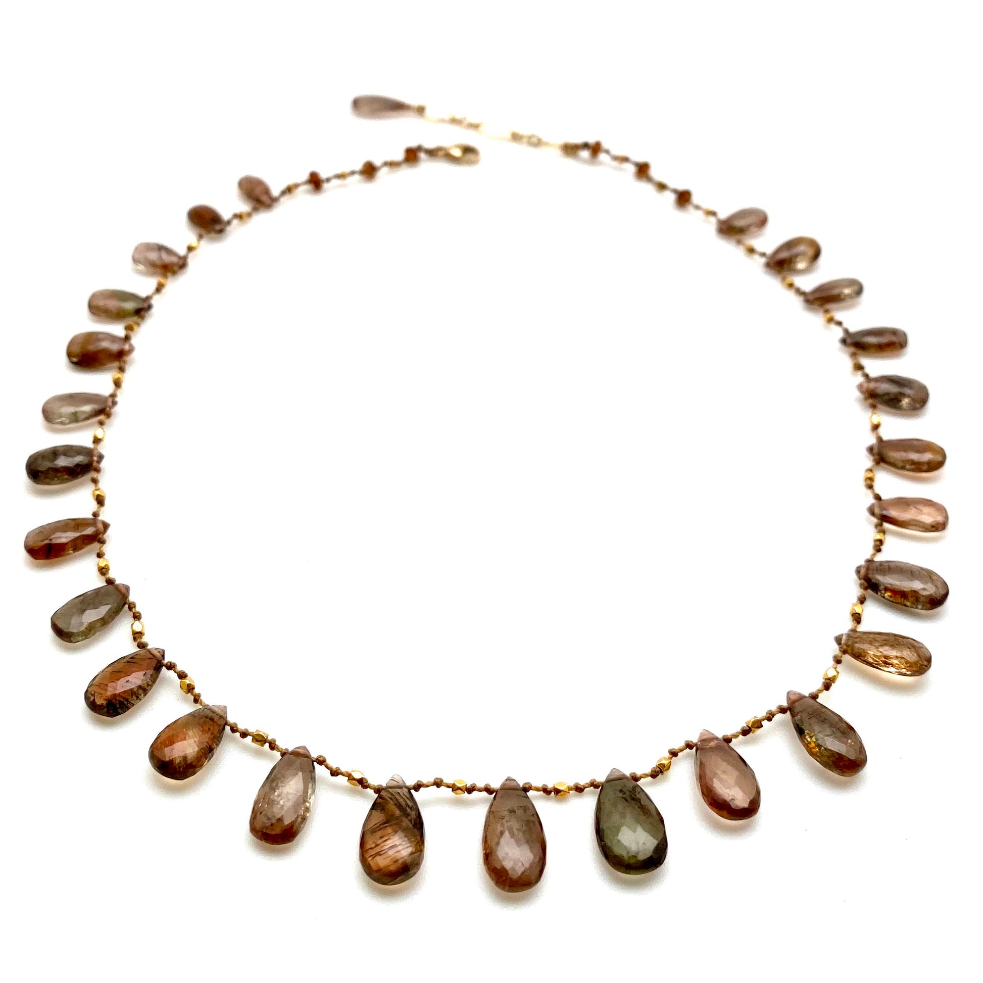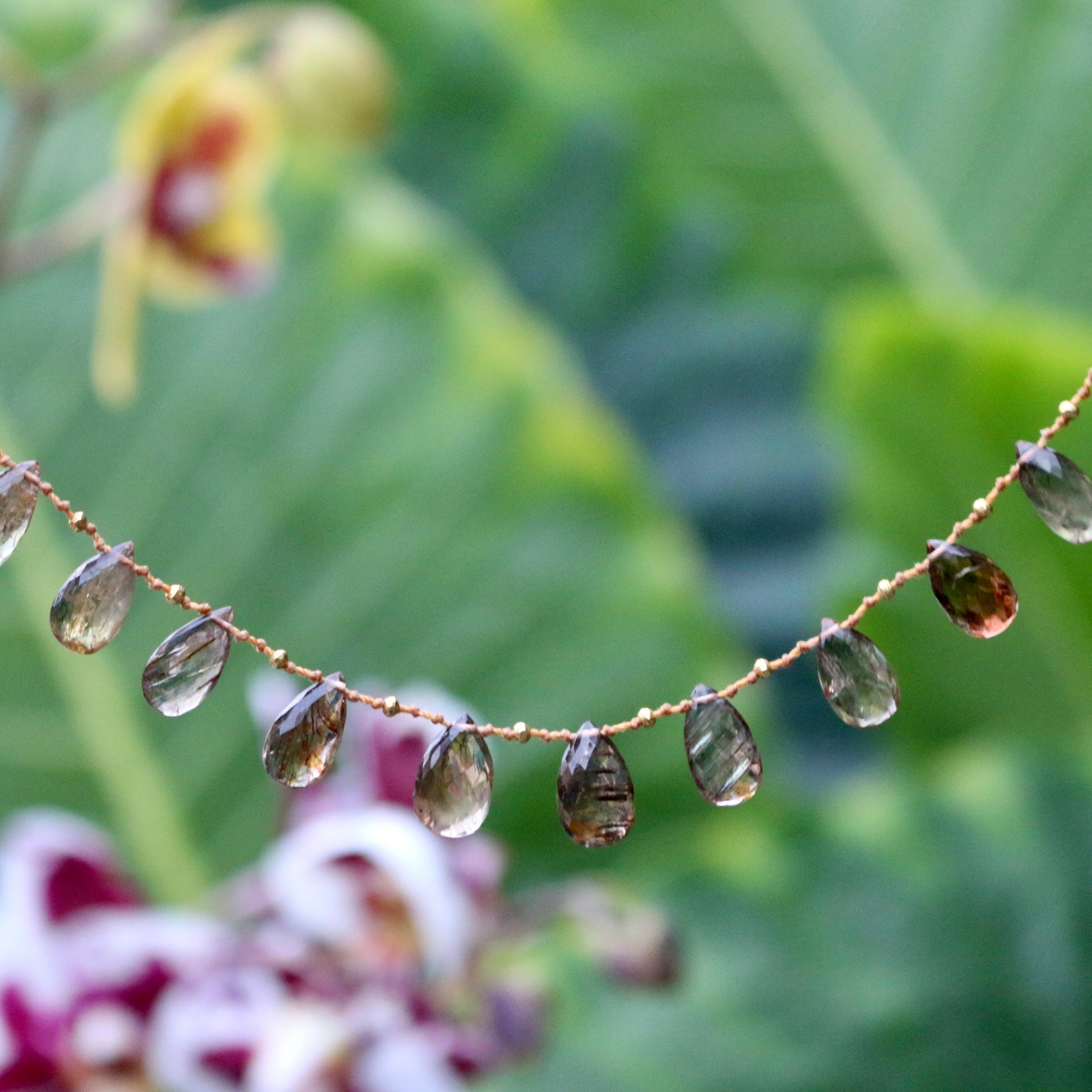 Earthy translucent Andalusite delicately spaced with handmade solid 18k gold beads. Traditionally a protection and grounding stone, Andalusite reinforces inner authority and emotional housecleaning for the sanctuary of the self.