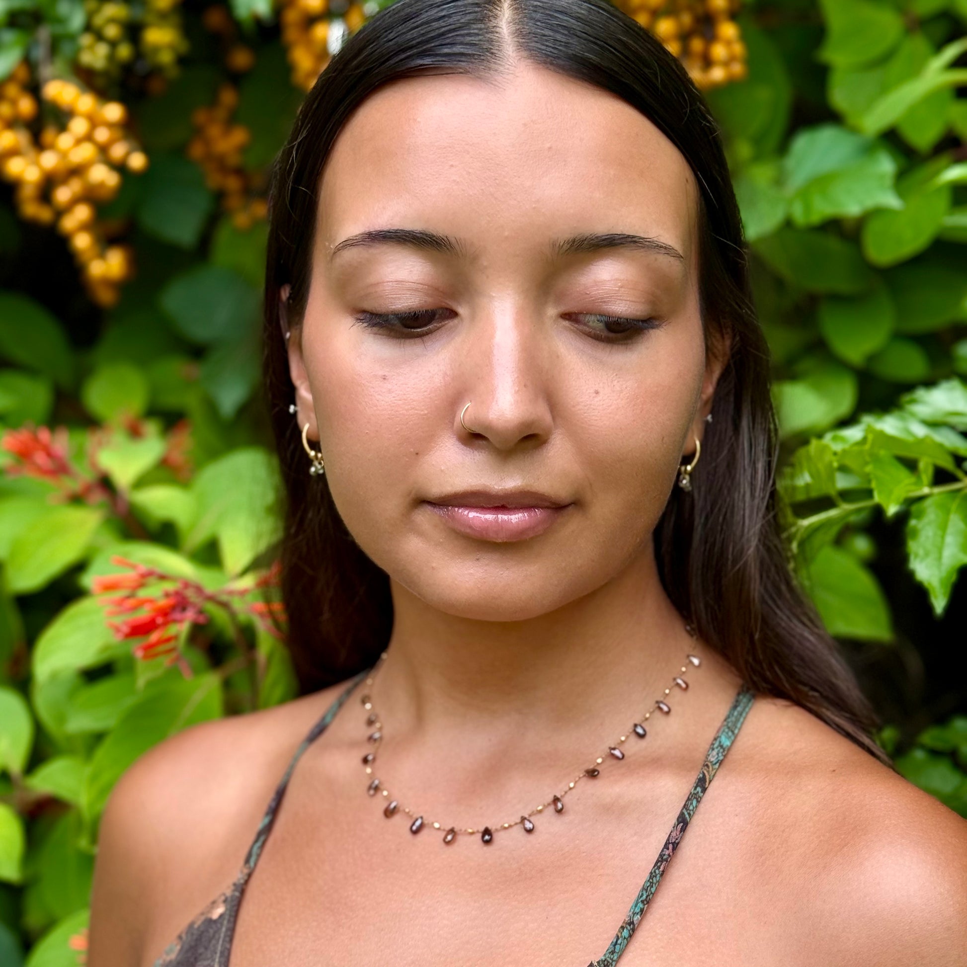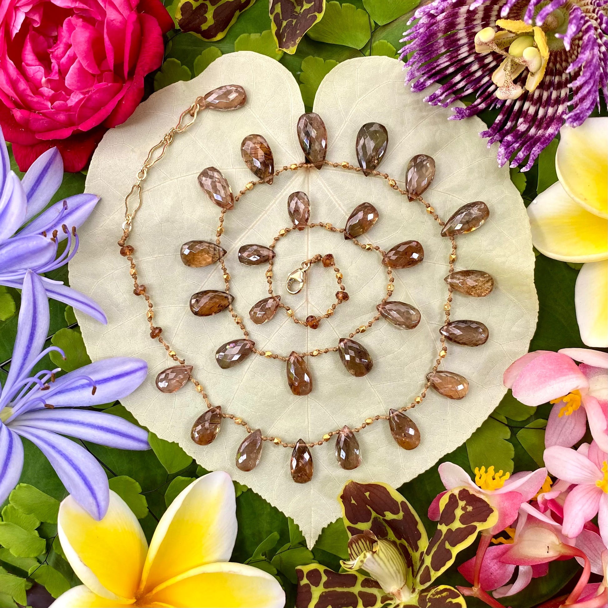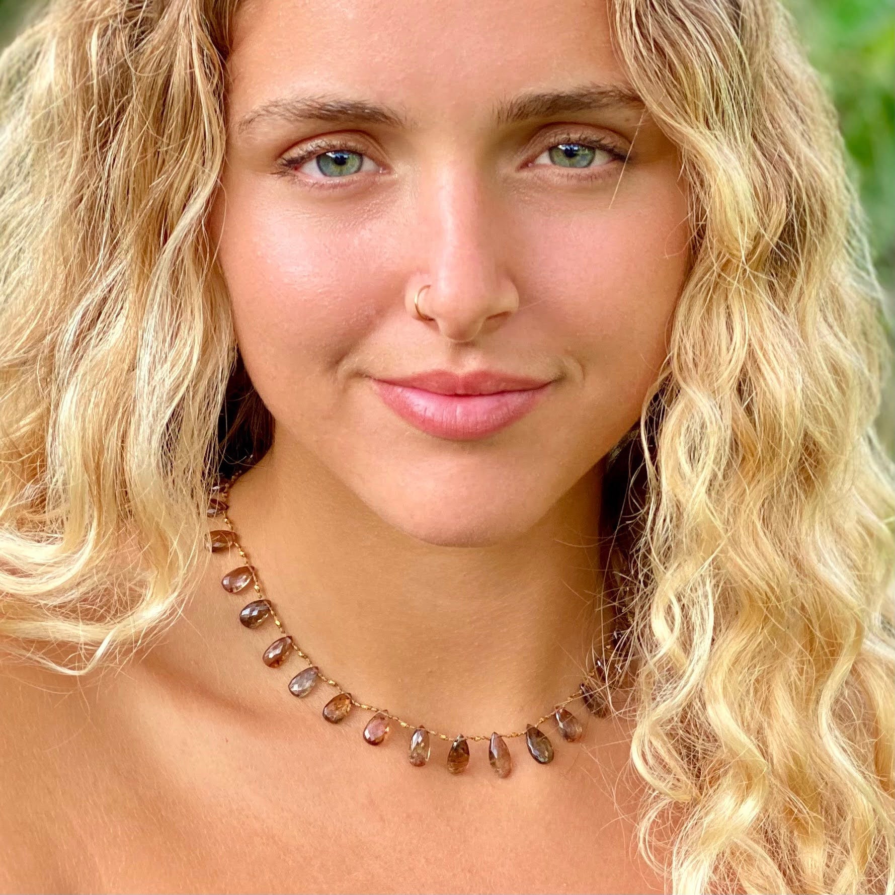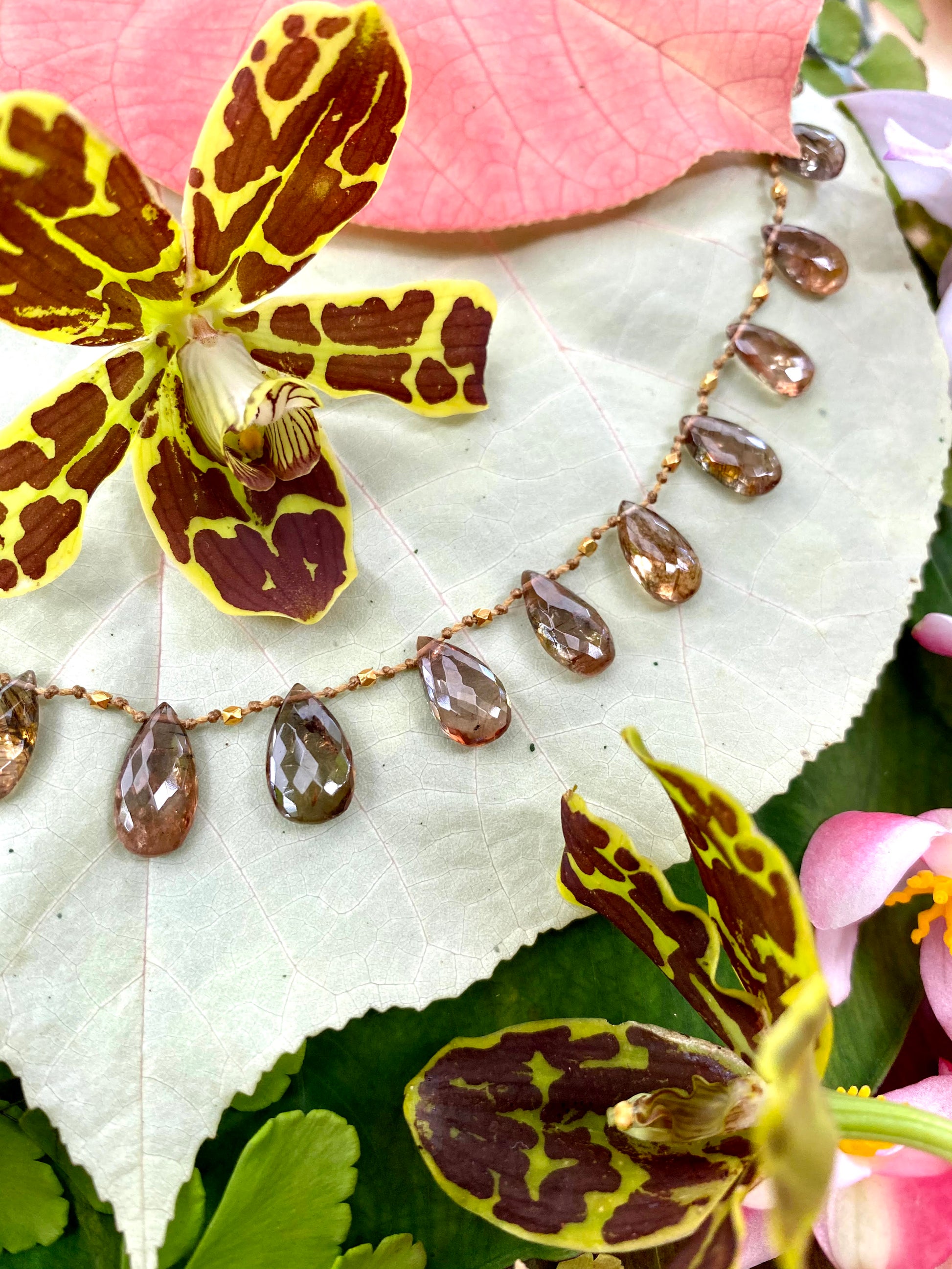 Earthy translucent Andalusite delicately spaced with handmade solid 18k gold beads. Traditionally a protection and grounding stone, Andalusite reinforces inner authority and emotional housecleaning for the sanctuary of the self.