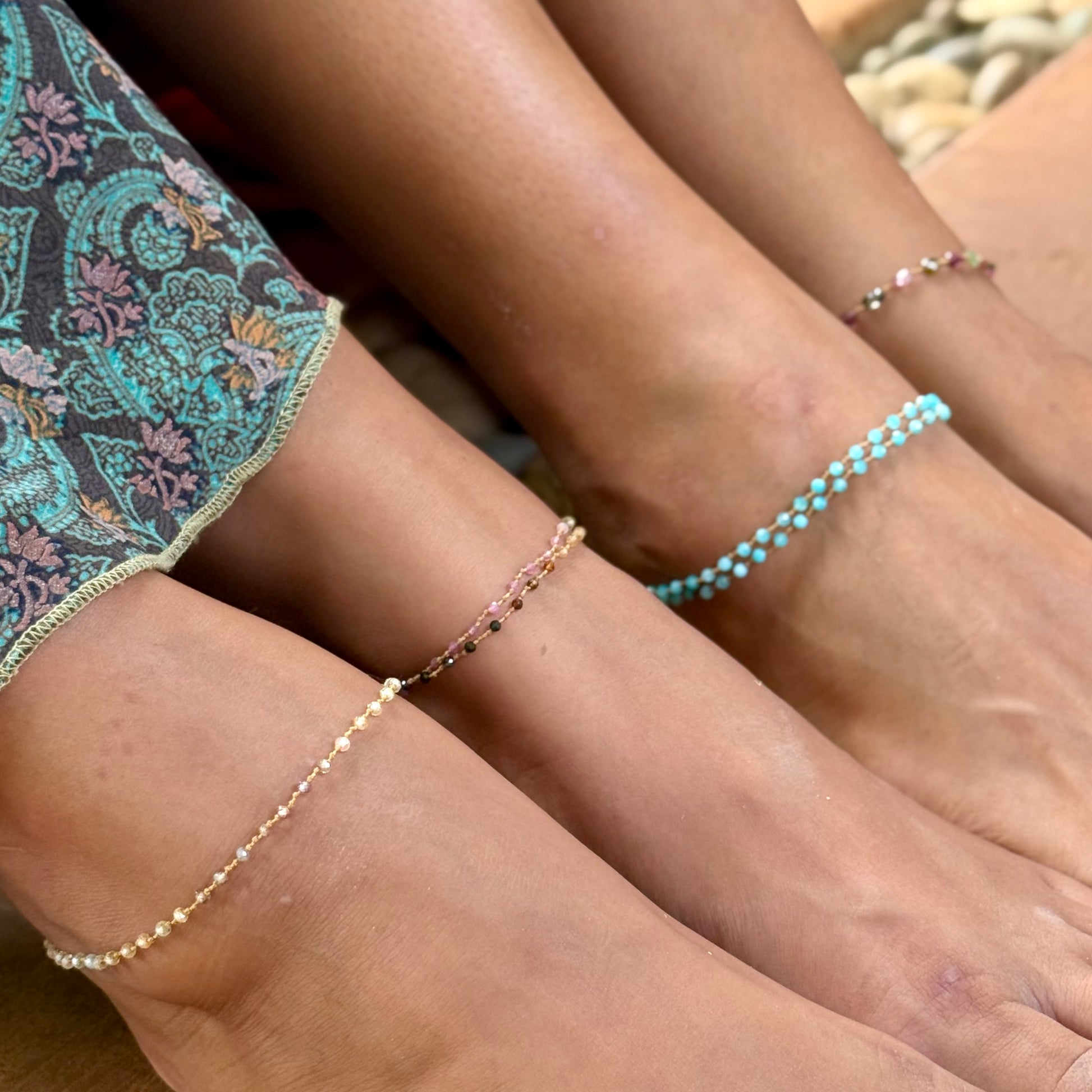 A collection to adorn each and every step of your path. No matter how you move our anklets enliven each stride with pleasure and joy. Representing stability and adaptability, what better way to support a grounded flow than with the twinkling, playful reminder to walk in beauty. Featuring hand-knotted precious gemstones, our anklets resonate with the sweet hum of the earth underfoot and our starry origins overhead.