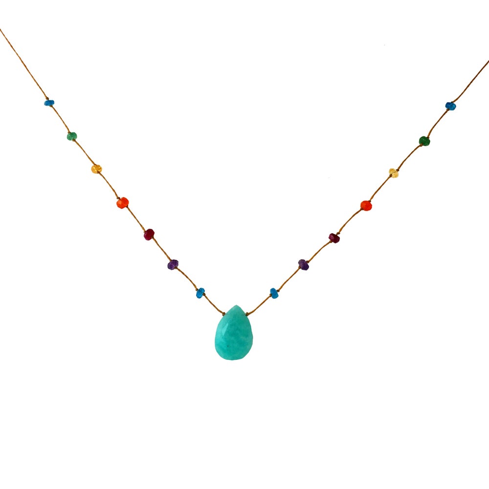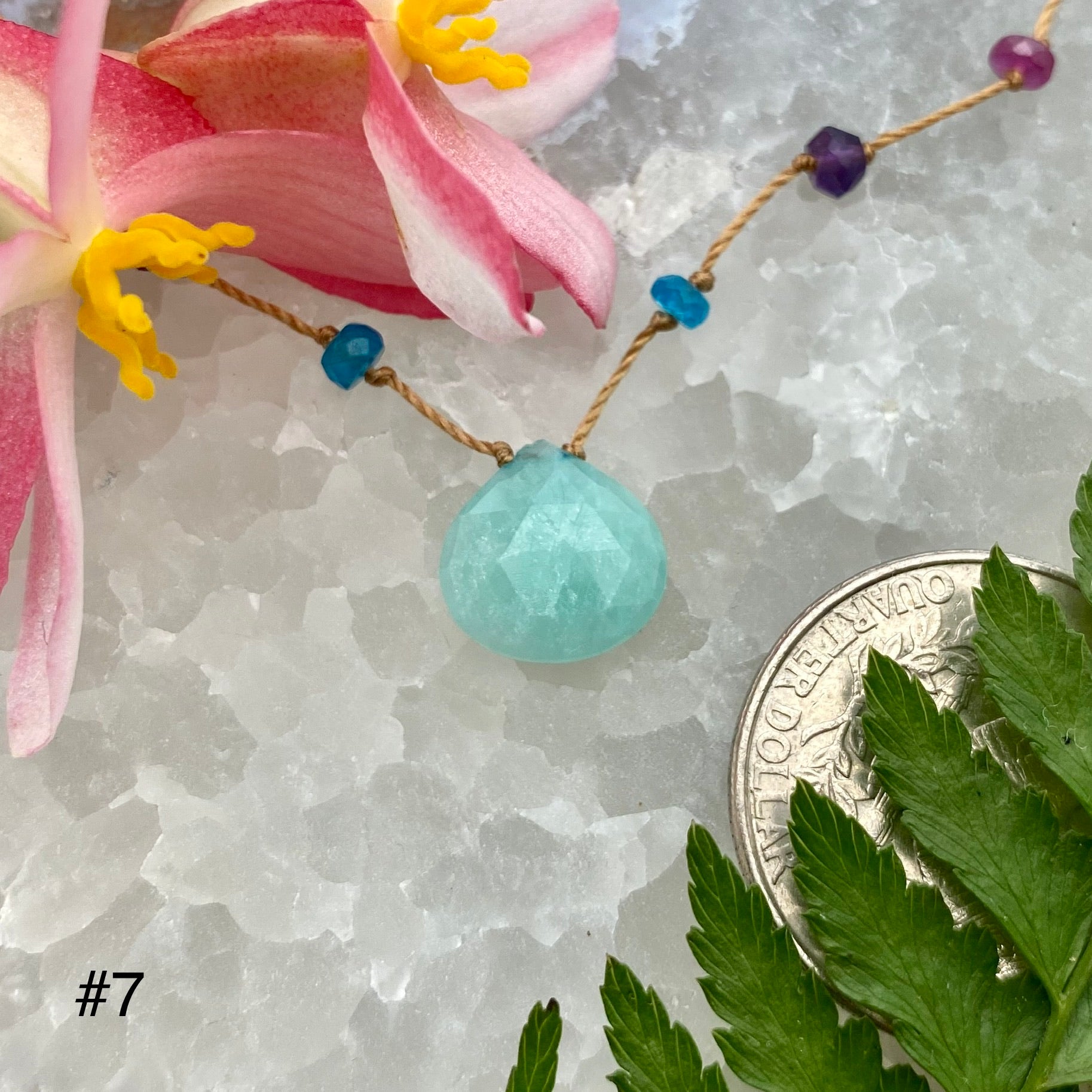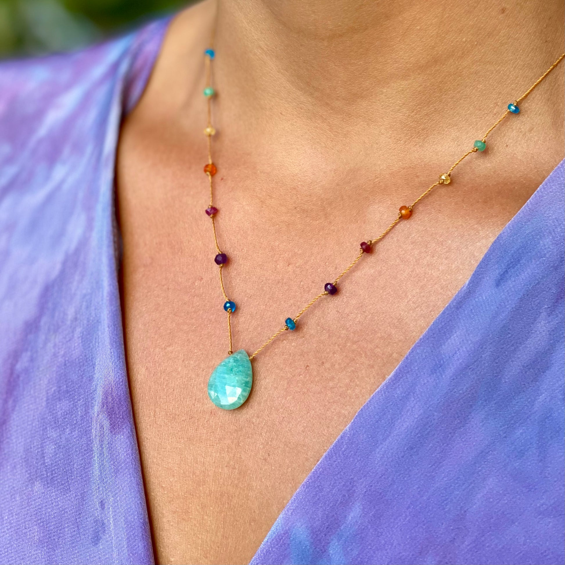 Perhaps the quintessential beginning of Rainbow Gems Kauai, our rainbow drops have been adorning people for over a decade. These delicate rainbow drops showcase the full light spectrum with carefully spaced individual gemstones, culminating in a featured crystalline drop. Just as rainbows herald new beginnings and luck these exquisite strands are the perfect place to begin your love affair with Amalia’s artwork. Many find that once they put on their rainbow drop they never take it off again, such is the nature of love. These strands are perfect for the minimalist at heart and make a striking impression stacked in a series with our other collections.