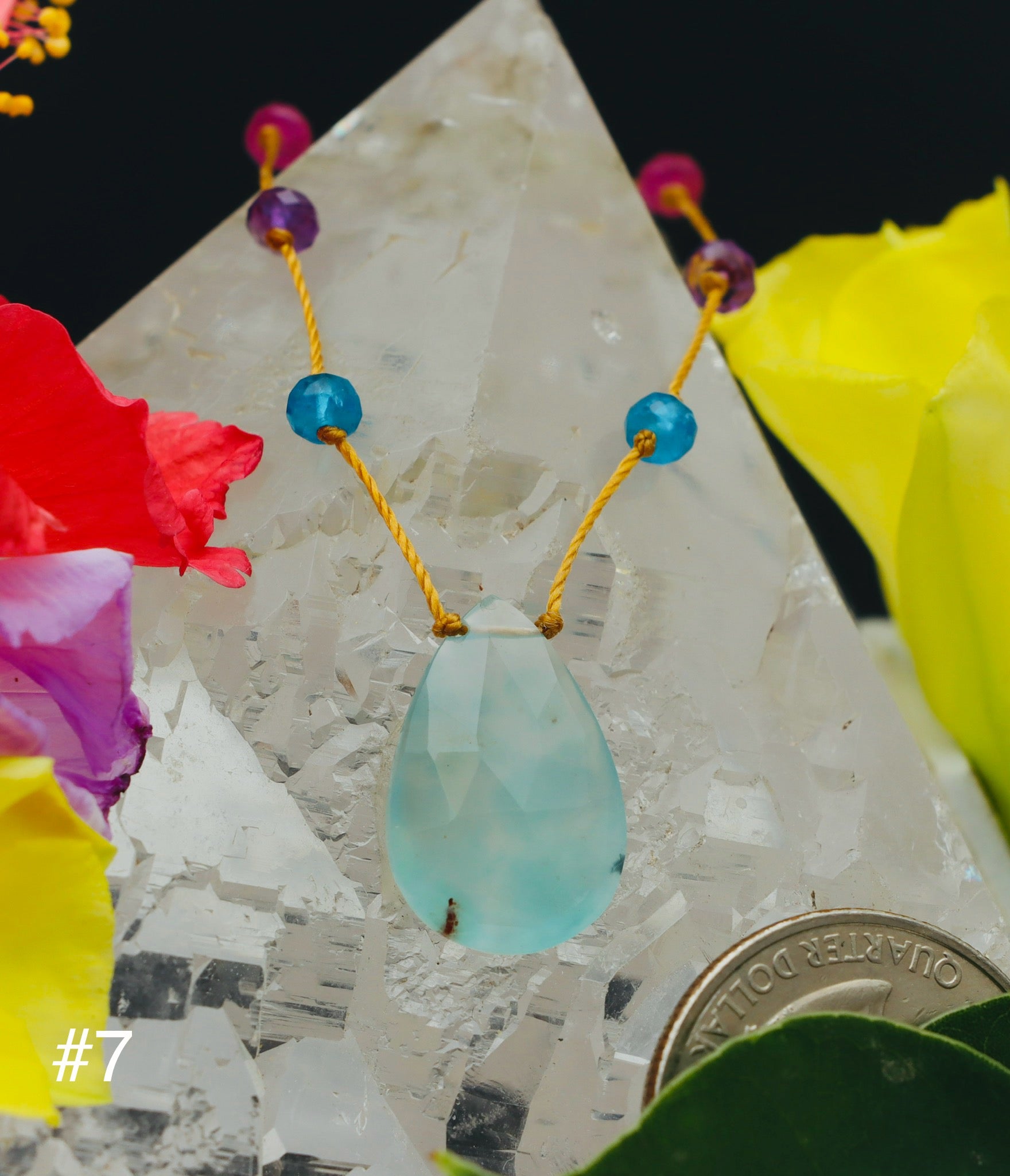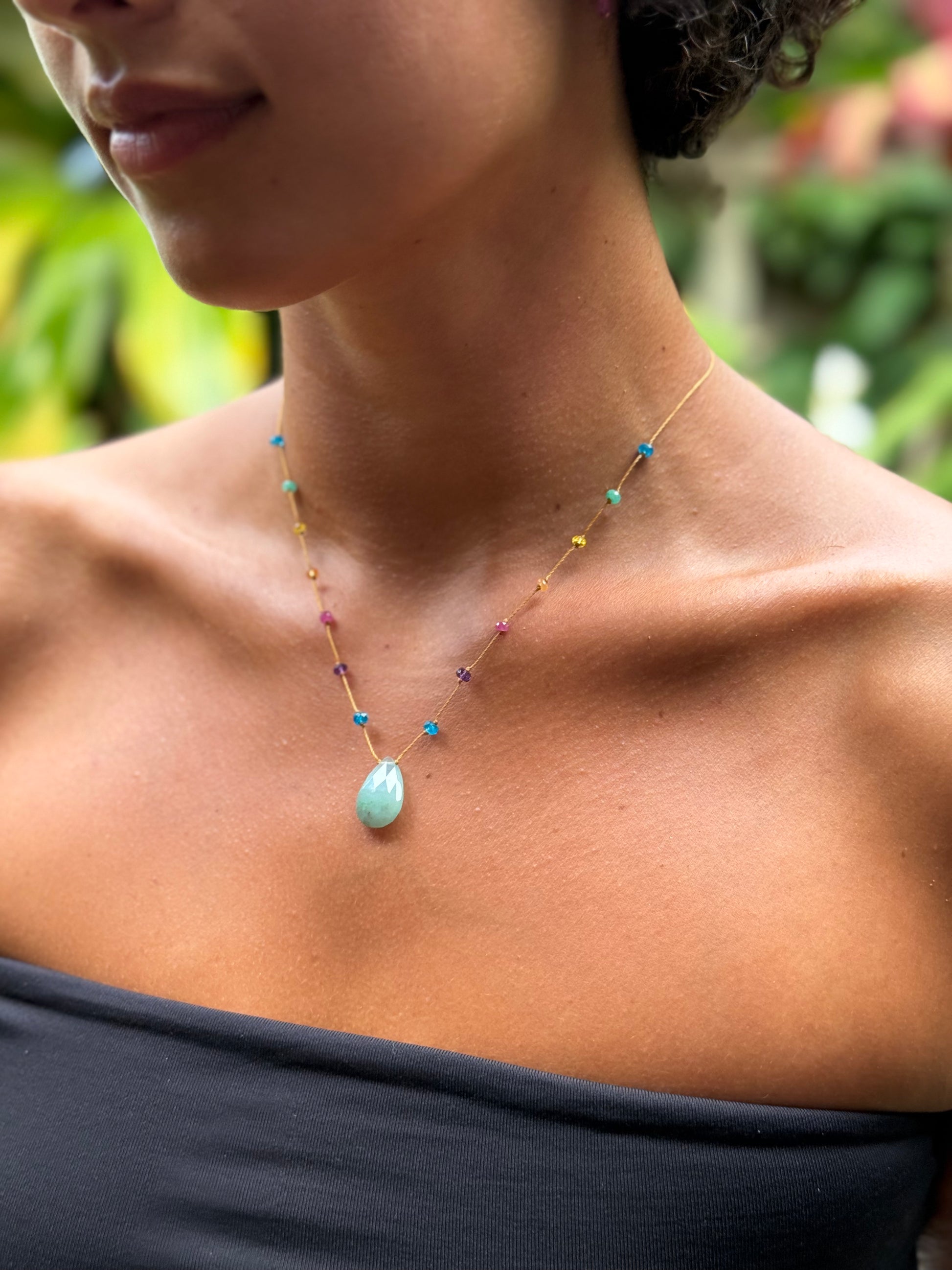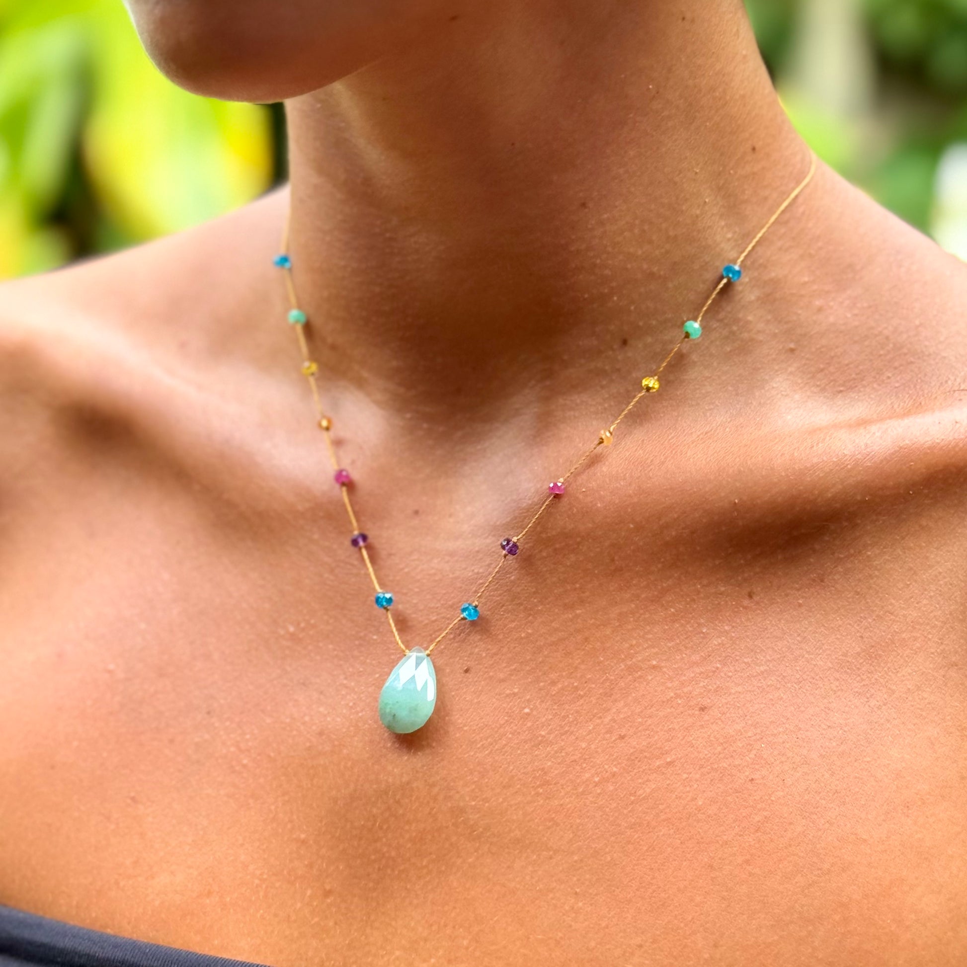 Perhaps the quintessential beginning of Rainbow Gems Kauai, our rainbow drops have been adorning people for over a decade. These delicate rainbow drops showcase the full light spectrum with carefully spaced individual gemstones, culminating in a featured crystalline drop. Just as rainbows herald new beginnings and luck these exquisite strands are the perfect place to begin your love affair with Amalia’s artwork. Many find that once they put on their rainbow drop they never take it off again, such is the nature of love. These strands are perfect for the minimalist at heart and make a striking impression stacked in a series with our other collections.