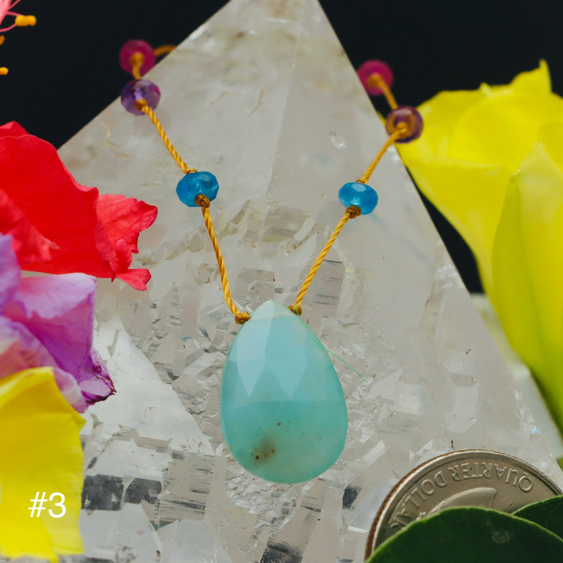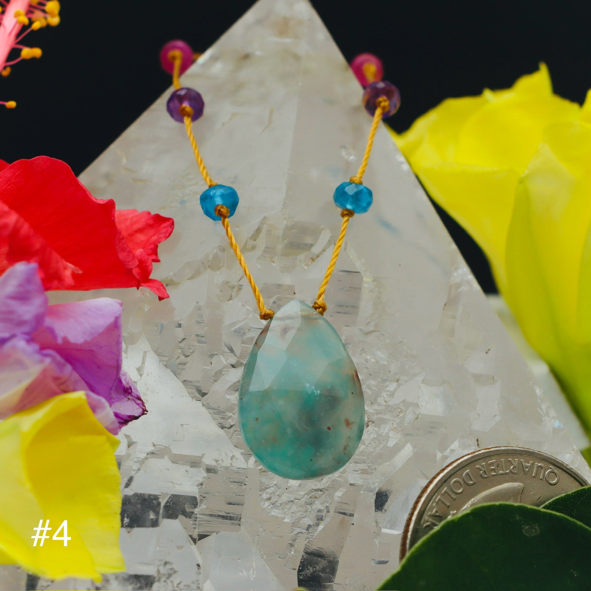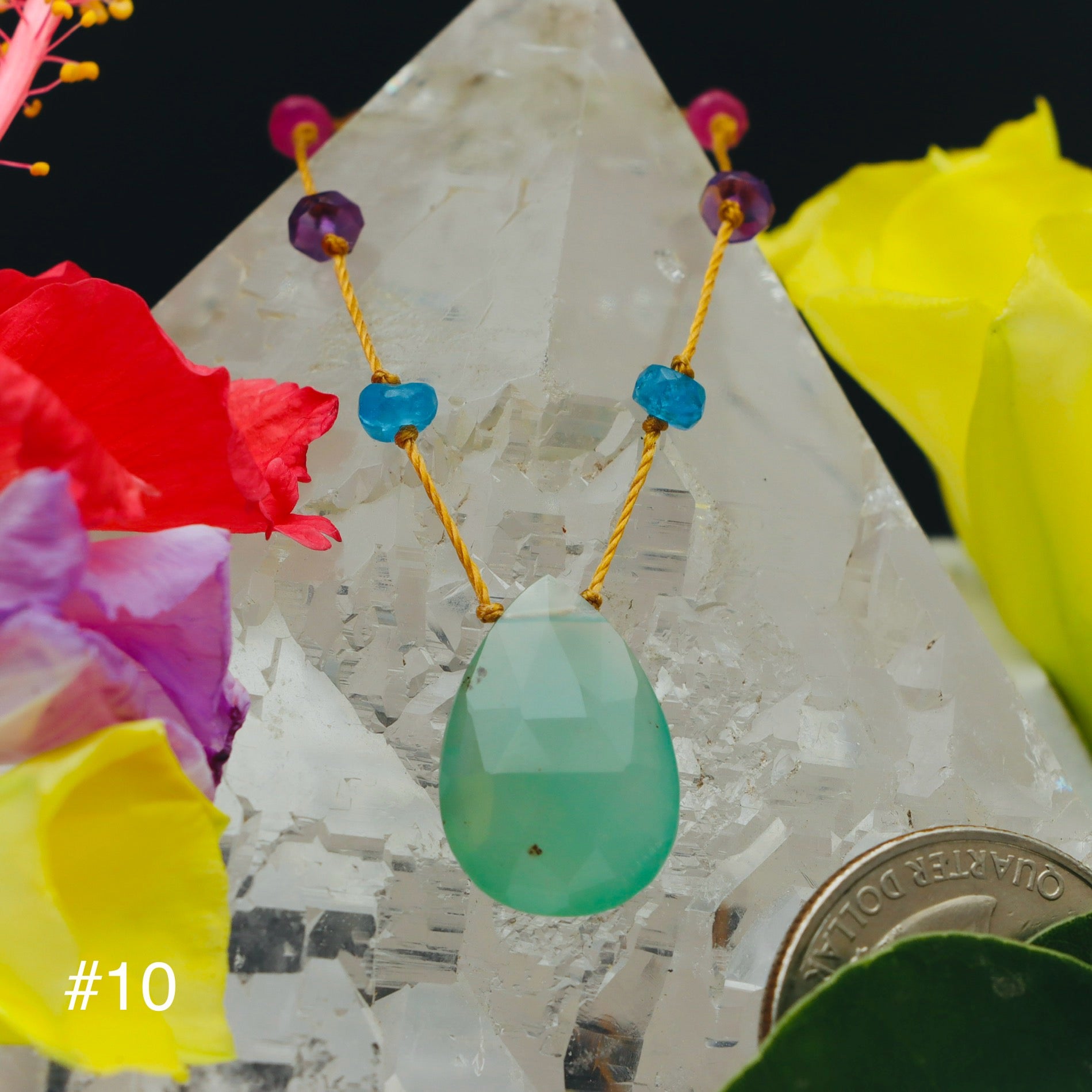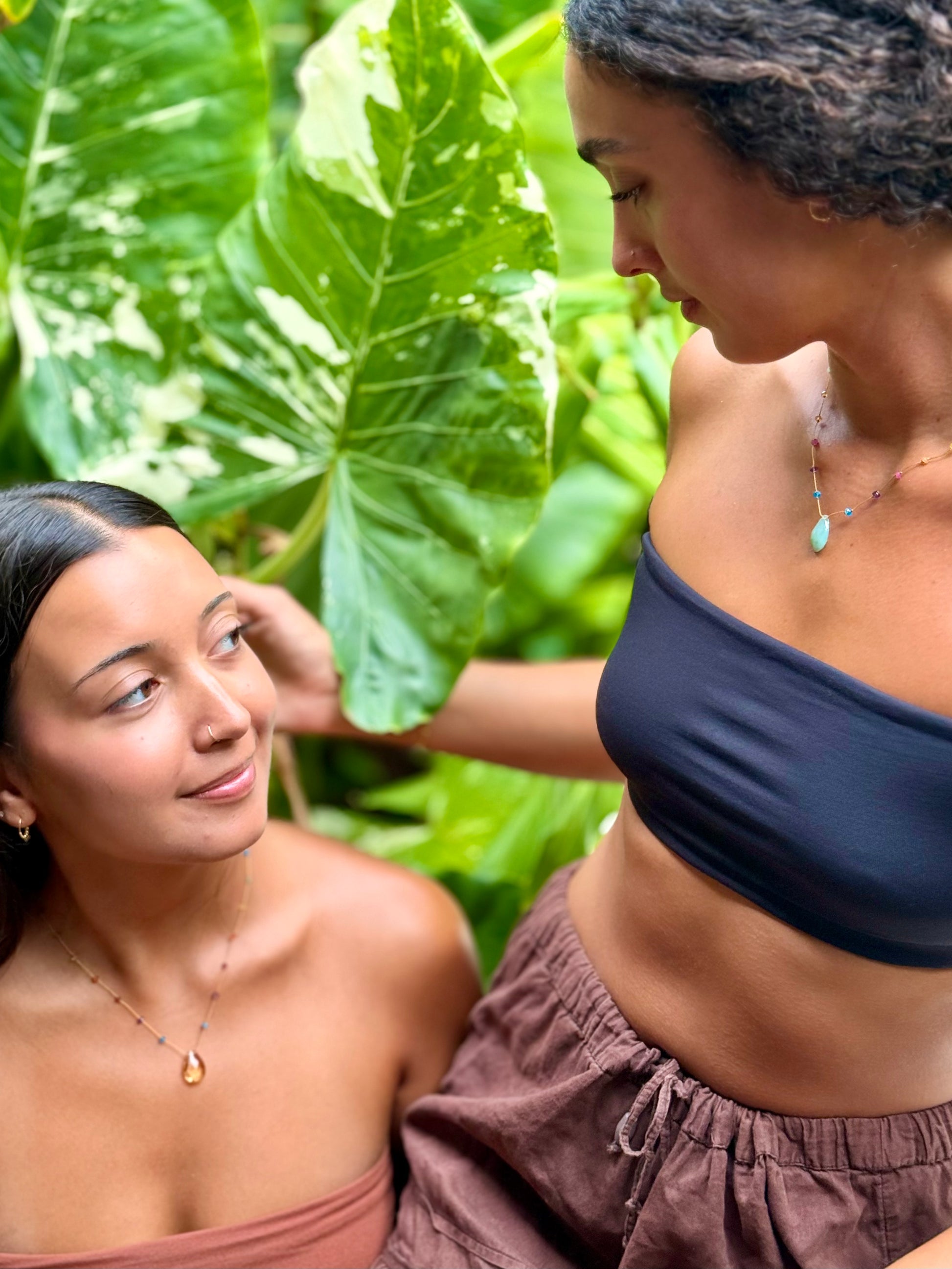 Perhaps the quintessential beginning of Rainbow Gems Kauai, our rainbow drops have been adorning people for over a decade. These delicate rainbow drops showcase the full light spectrum with carefully spaced individual gemstones, culminating in a featured crystalline drop. Just as rainbows herald new beginnings and luck these exquisite strands are the perfect place to begin your love affair with Amalia’s artwork. Many find that once they put on their rainbow drop they never take it off again, such is the nature of love. These strands are perfect for the minimalist at heart and make a striking impression stacked in a series with our other collections.