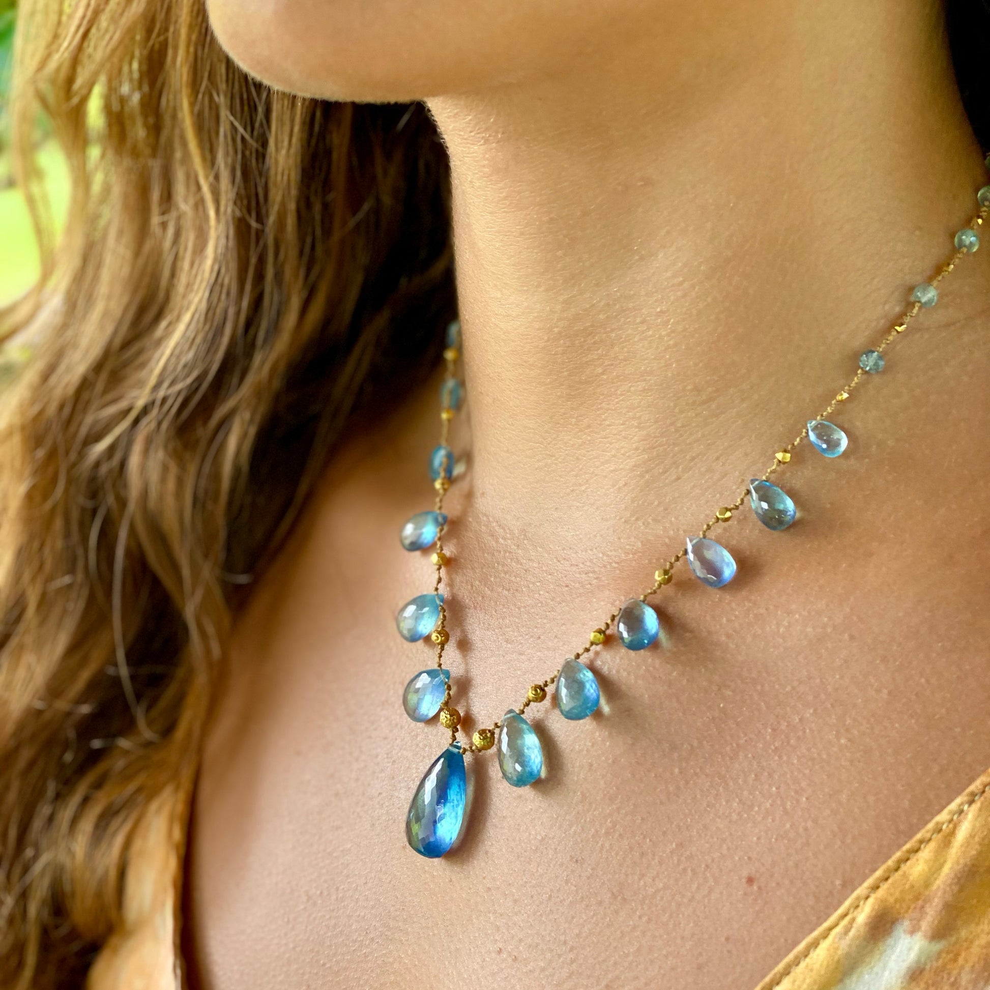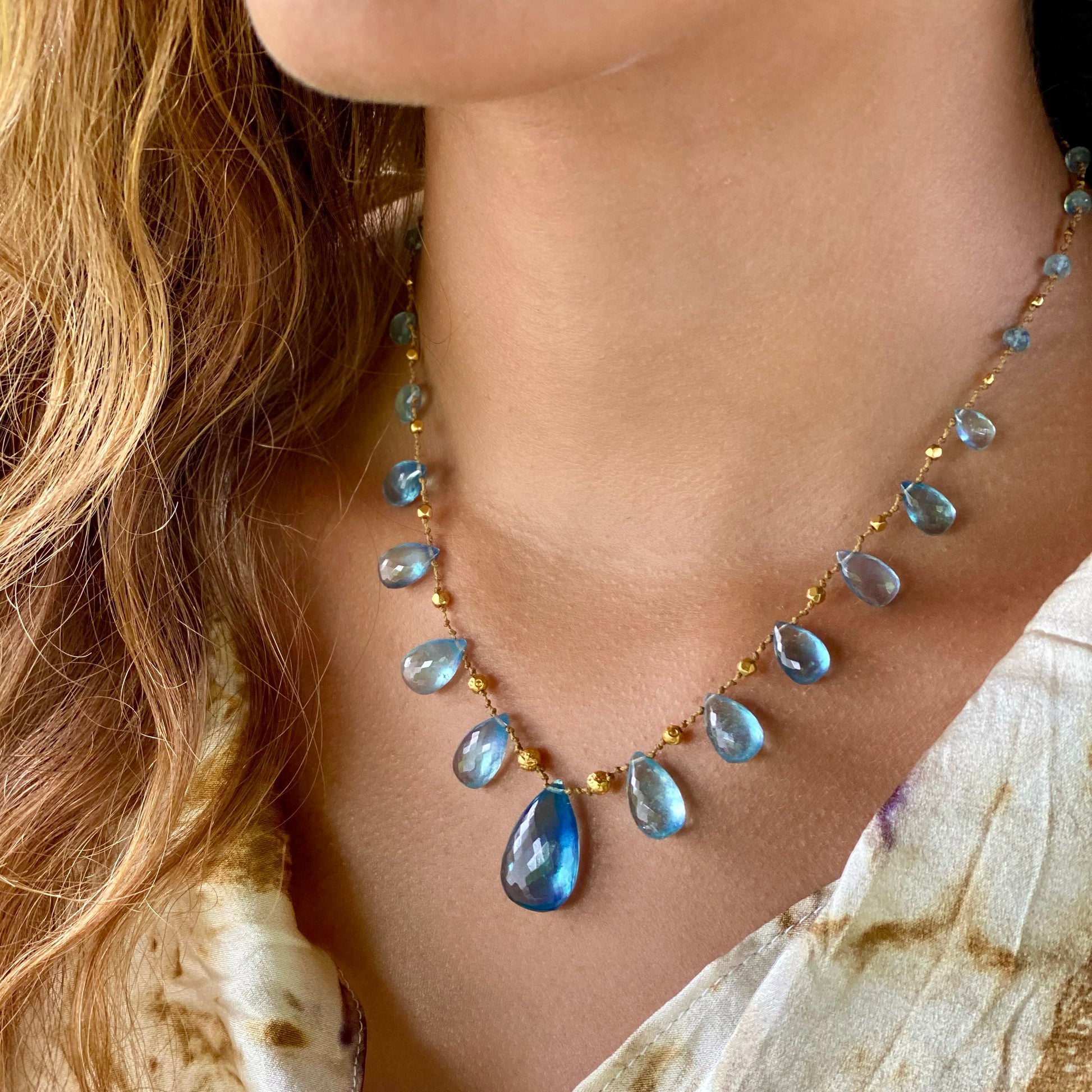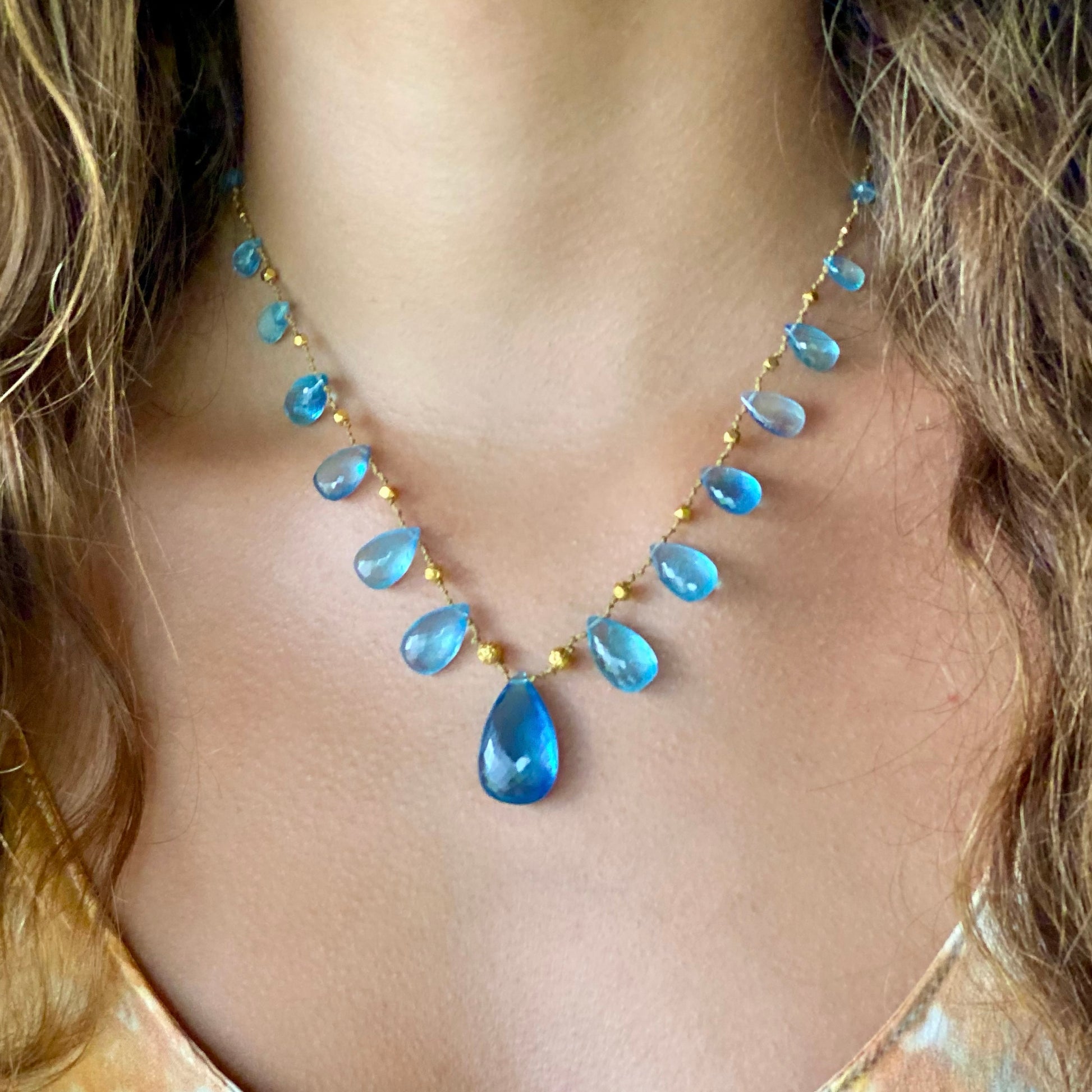Breathtaking Aquamarine drops in a shade reminiscent of the Aegean Sea, a bluebird mountain morning, or a lost angelic tribe. These beauties herald calm authority, trust in truth, and surrender to divinity. Graduated gems are set between handmade solid 18k gold beads.