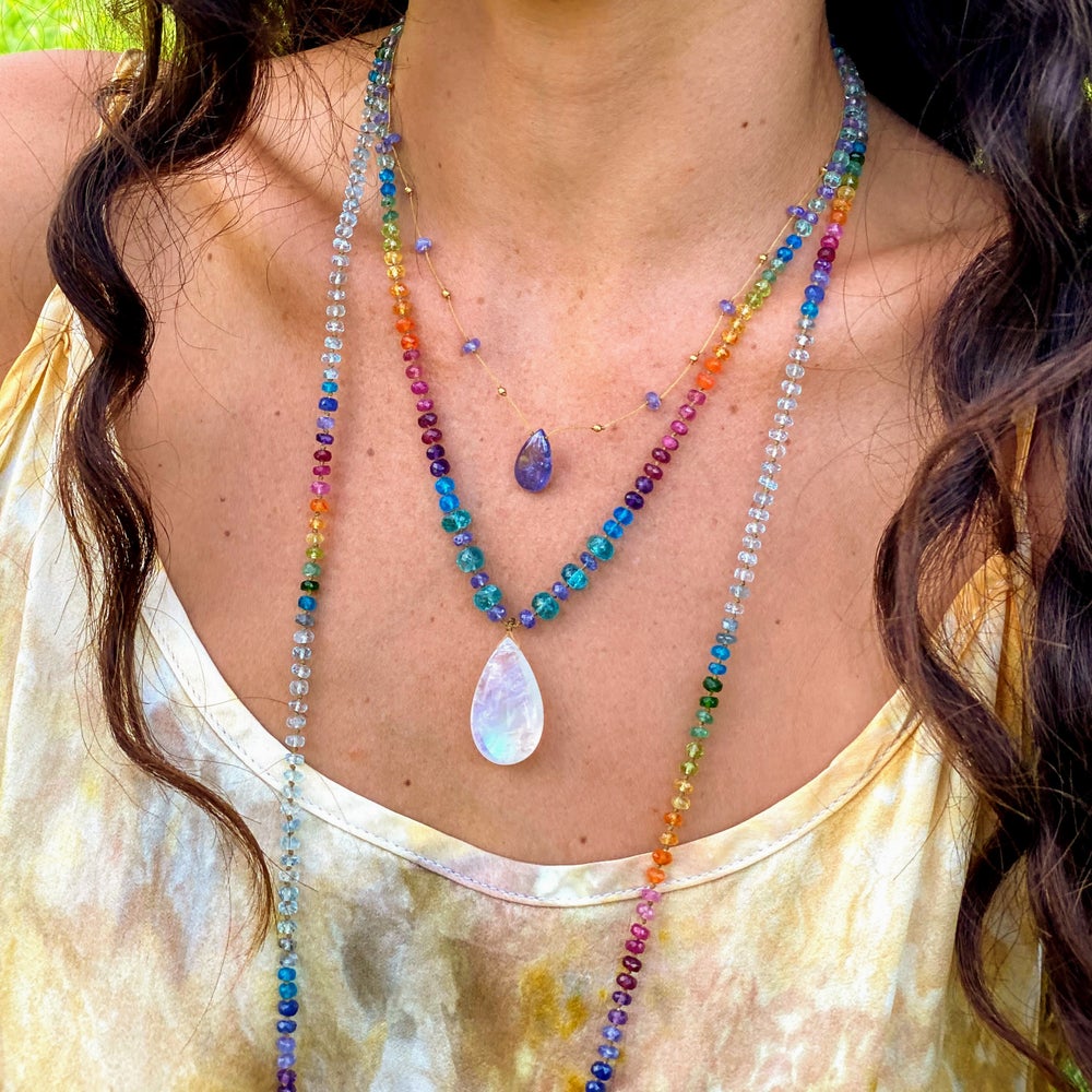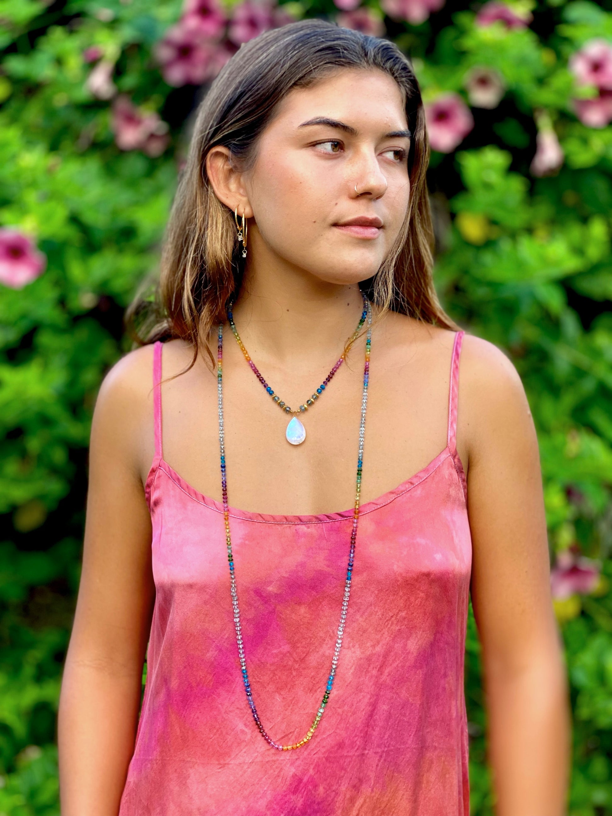 You can layer Rainbow Leis with with both our Alohi or Rainbow Drop collections. They are also a lovely compliment to our Rainbow Mana pieces and can be worn to bring forth dynamic color contrast or chosen mineral emphasis.