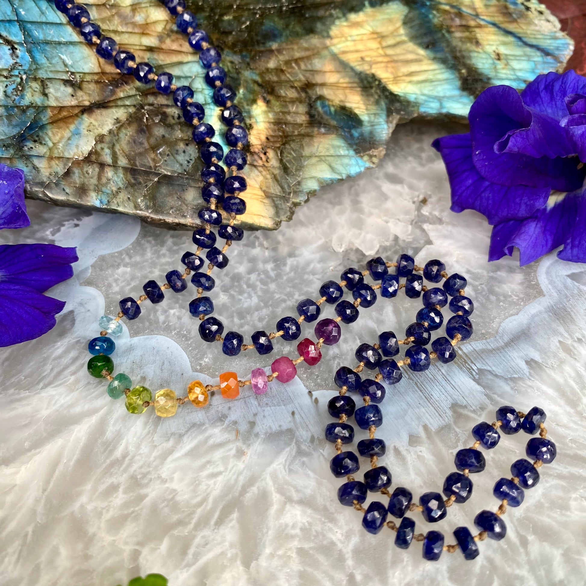 Please choose from available lengths, and either no clasp (slips overhead), or the slightly shorter versions with either our handmade solid 18k gold J clasp or our knotted bead and hoop clasp.