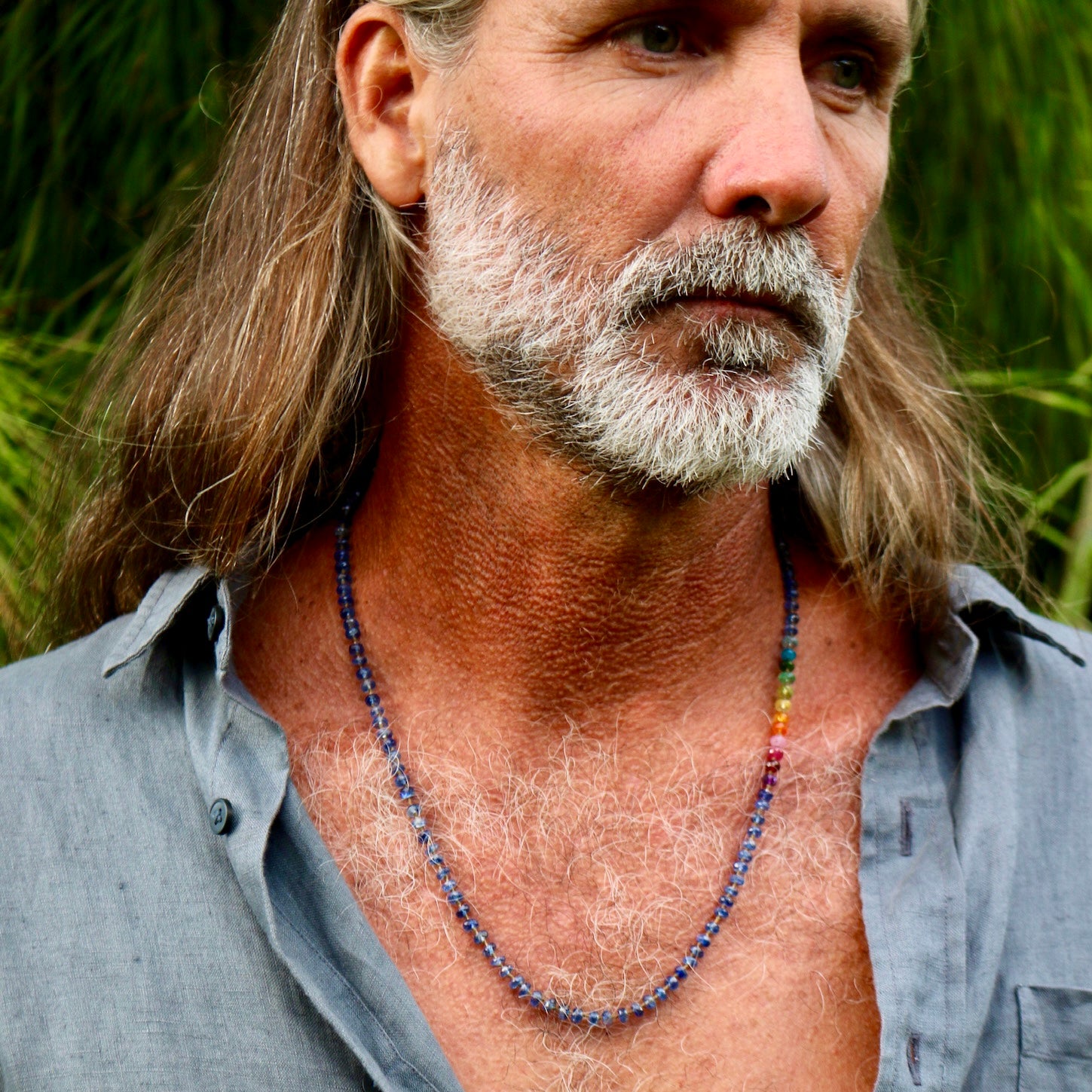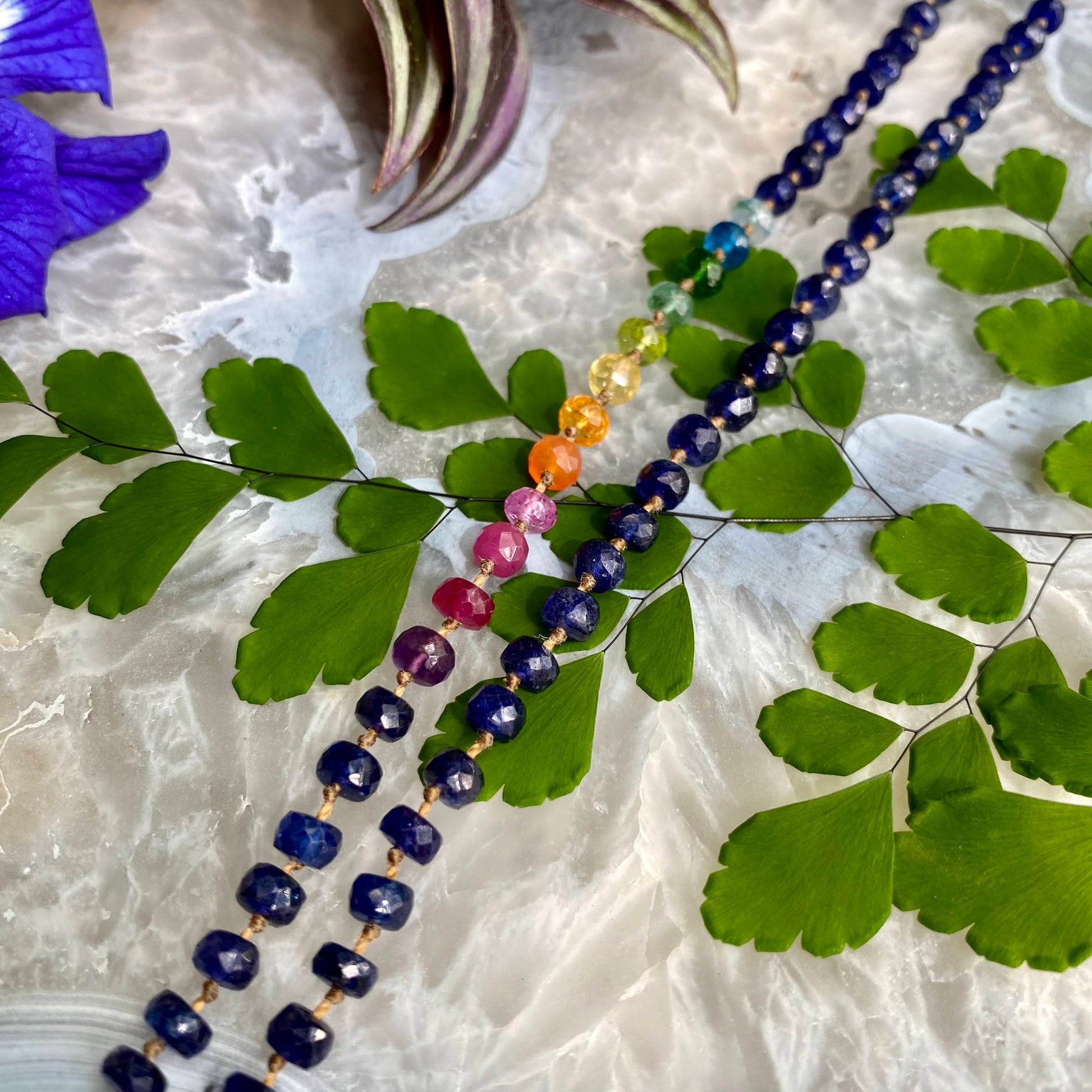 Rainbow Sequence: Blue Sapphire, Amethyst, Ruby, Light Ruby, Pink Sapphire, Carnelian, Spessartite Garnet, Heliodor Aquamarine, Peridot, Emerald, Chrome Diopside, Apatite, and Blue Zircon.