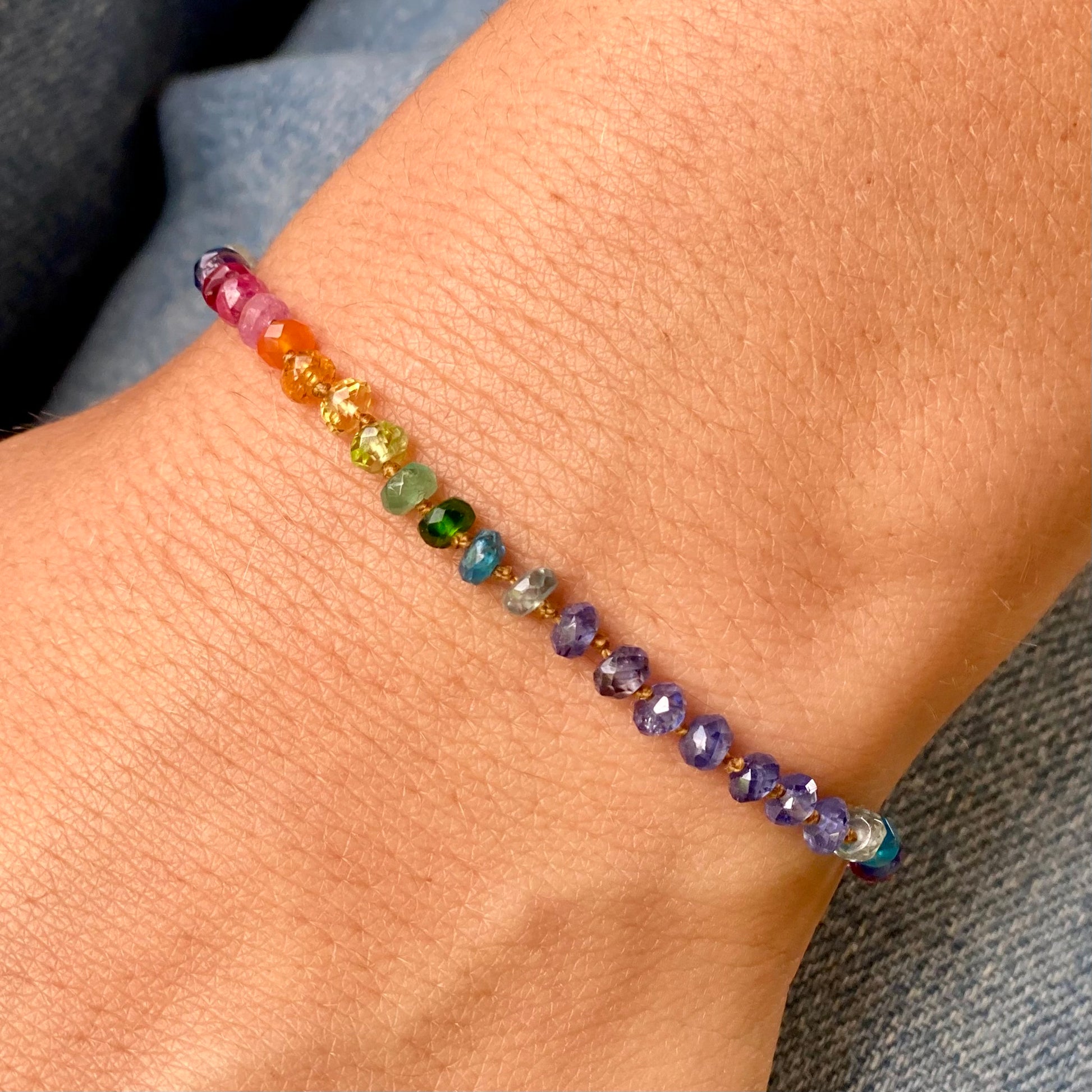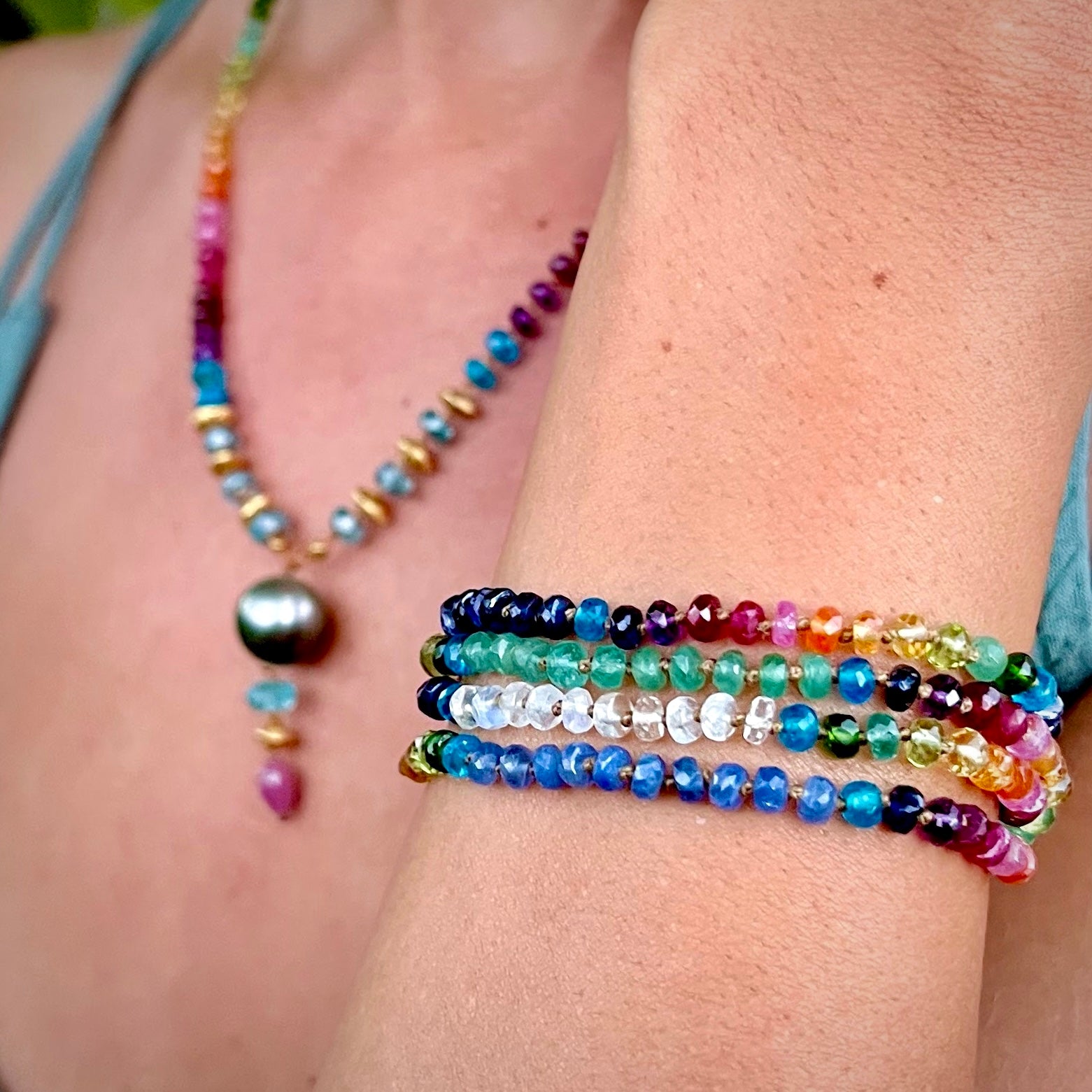 The hands are an extension of the heart, and as such, the wrists are a link between our passions and their expressions. As one of the most delicate joints in the body, they are responsible for movement, flexibility, dexterity, ease and skill. Celebrate, nourish, and embolden their expressions adorned in prismatic minerals that so eloquently highlight the finesse of love in action. Like all of Amalia’s pieces, our rainbow bracelets feature detailed knotting, precious gemstones, and a dash of uplifting rainbow magic. They also accent our other collections beautifully.