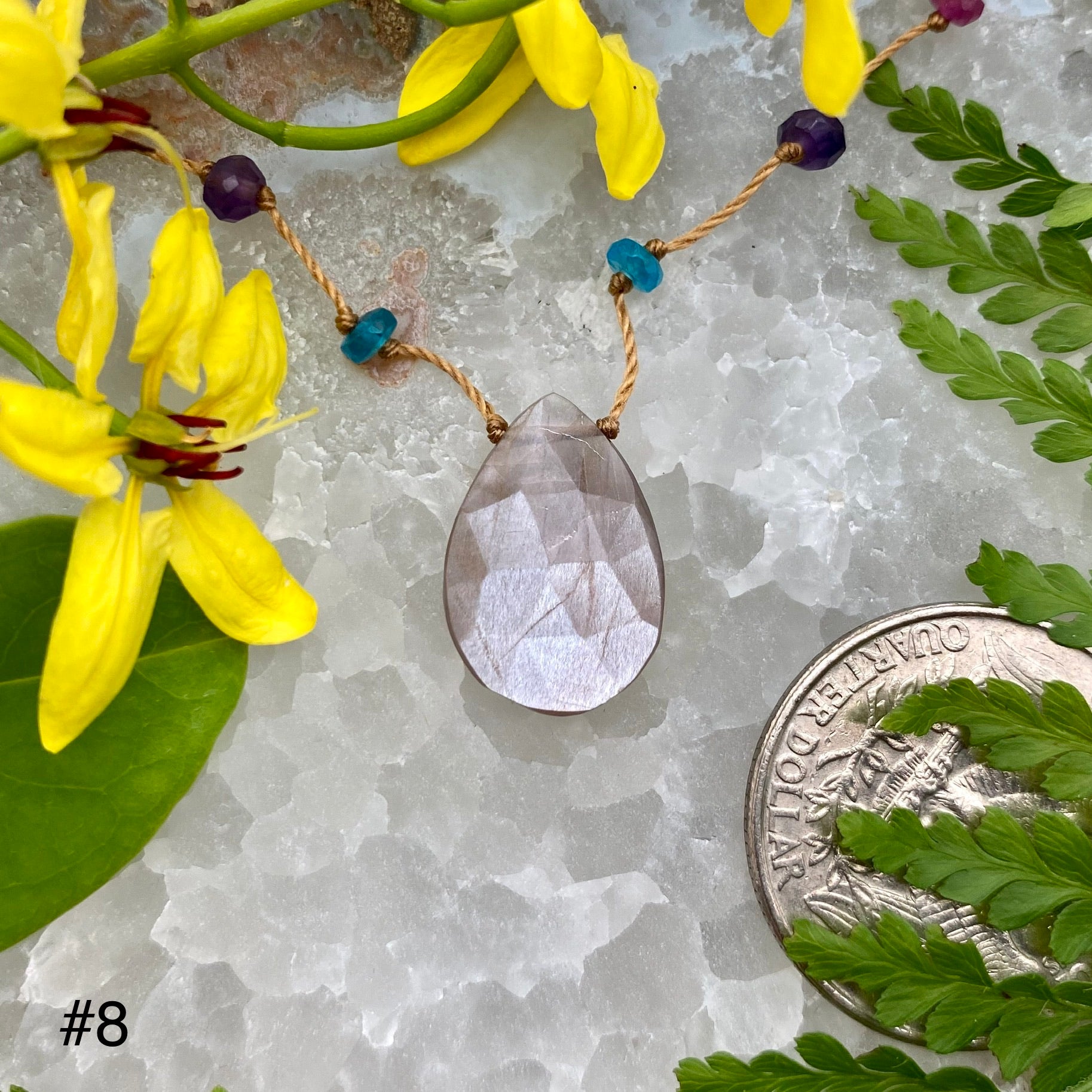 Perhaps the quintessential beginning of Rainbow Gems Kauai, our rainbow drops have been adorning people for over a decade. These delicate rainbow drops showcase the full light spectrum with carefully spaced individual gemstones, culminating in a featured crystalline drop. Just as rainbows herald new beginnings and luck these exquisite strands are the perfect place to begin your love affair with Amalia’s artwork. Many find that once they put on their rainbow drop they never take it off again, such is the nature of love. These strands are perfect for the minimalist at heart and make a striking impression stacked in a series with our other collections.