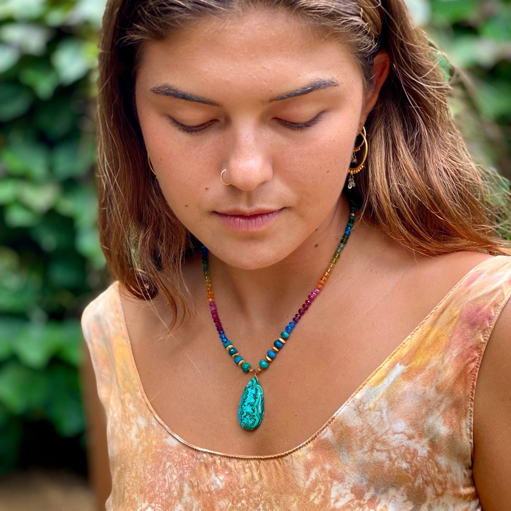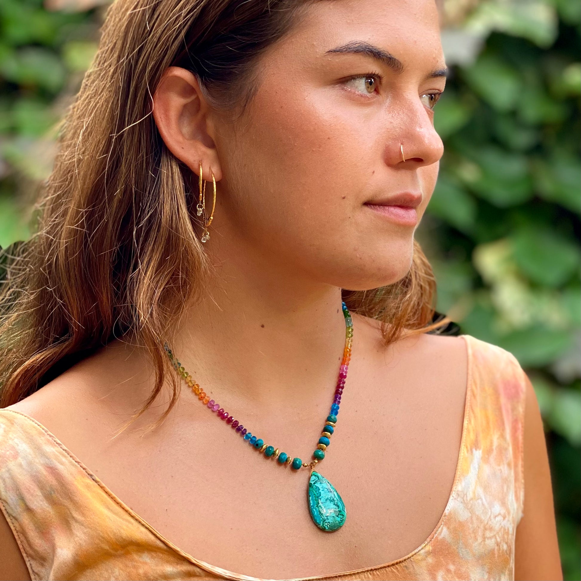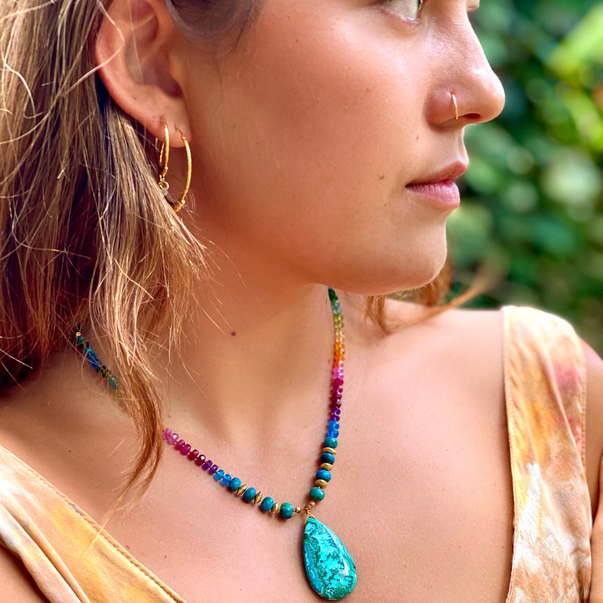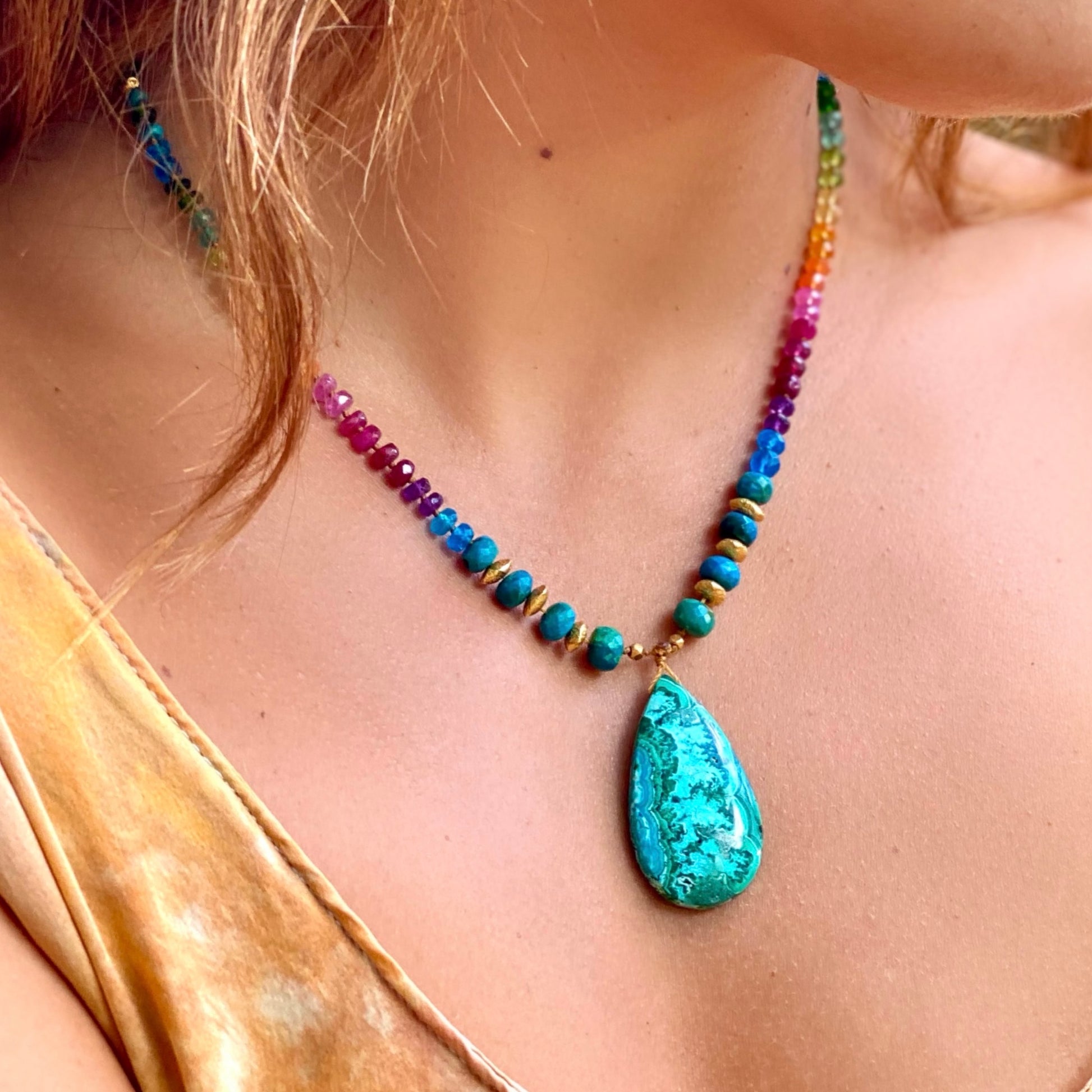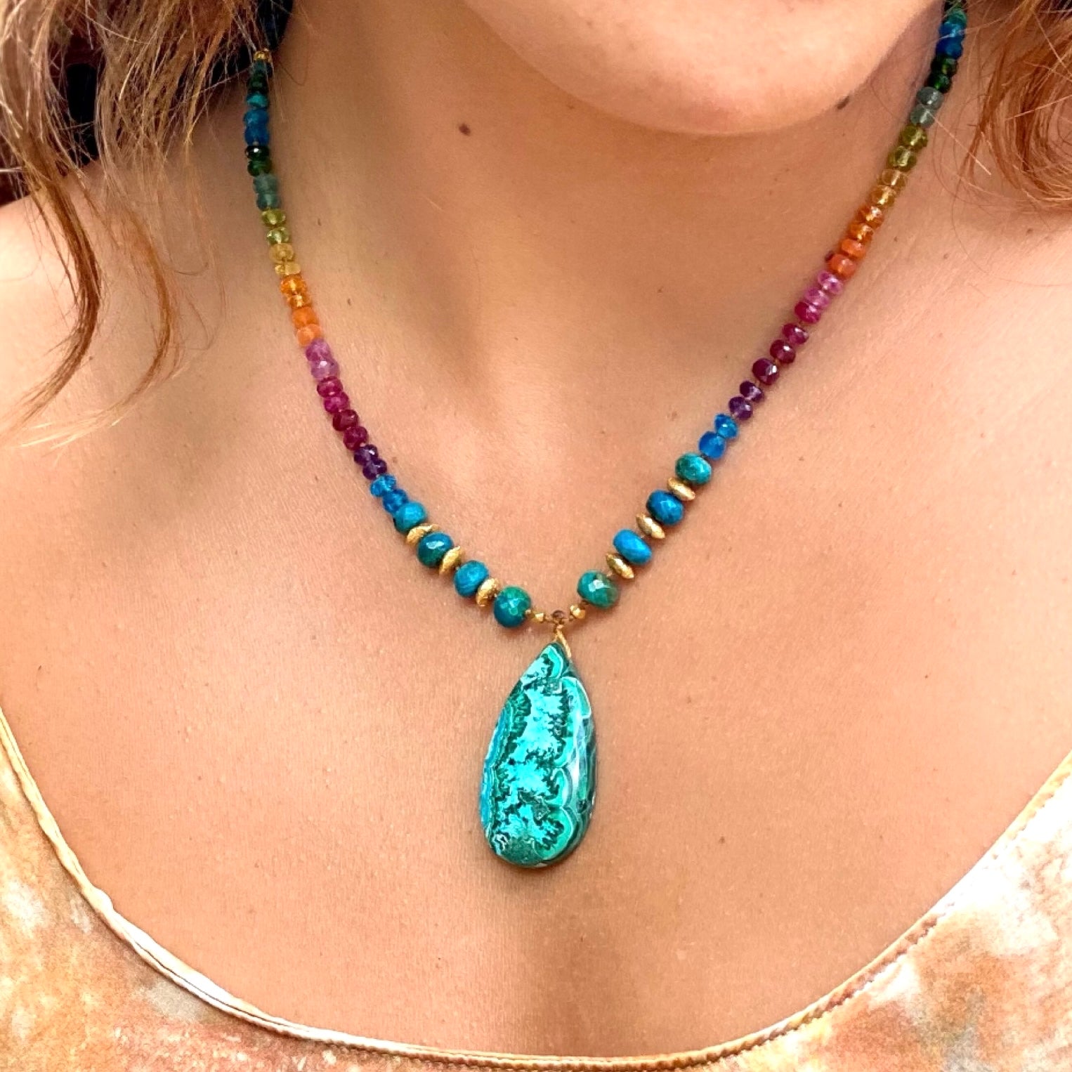 Mesmerizing Chrysocolla Malachite with Opalina, organically shaped handmade solid 18k gold beads, and Rainbows.