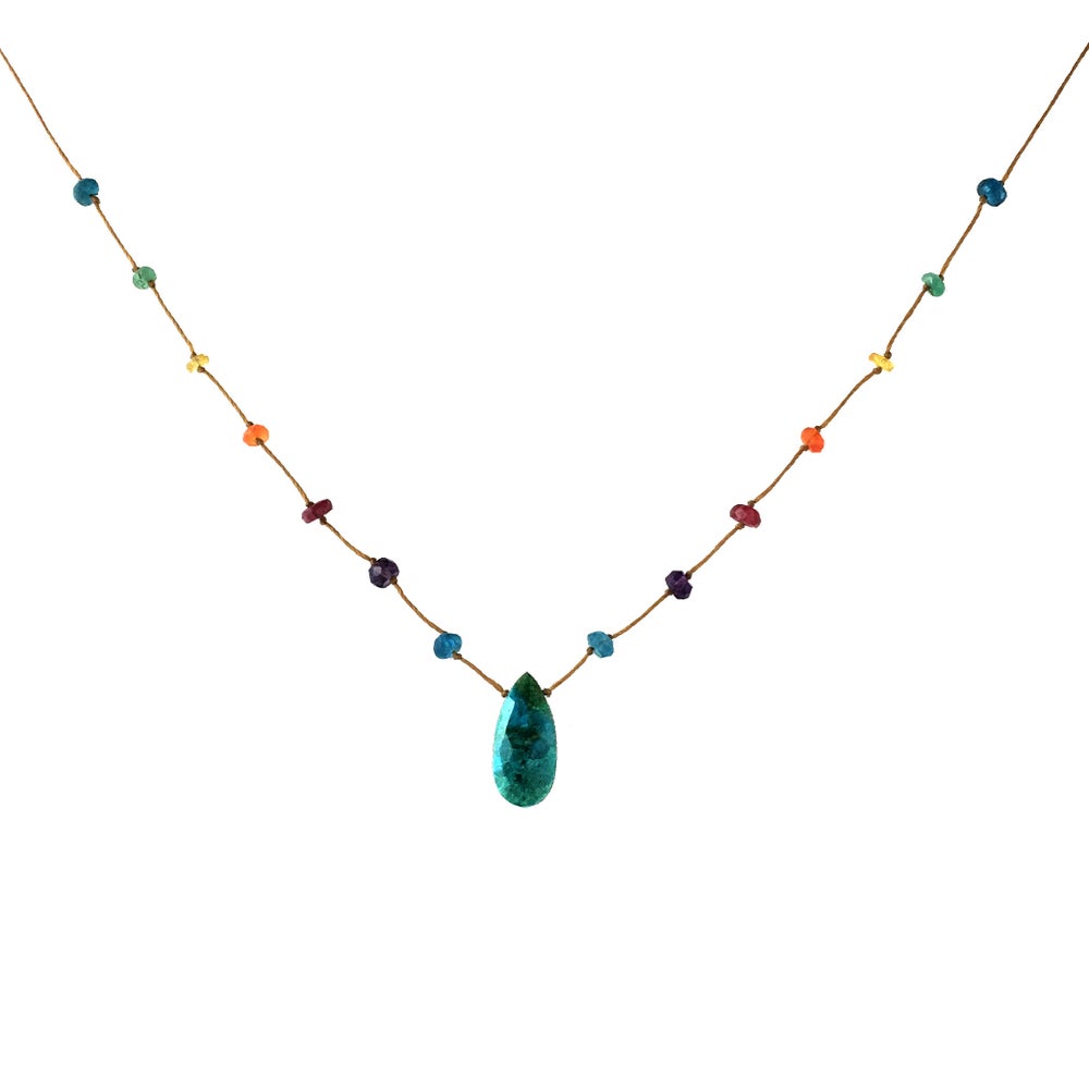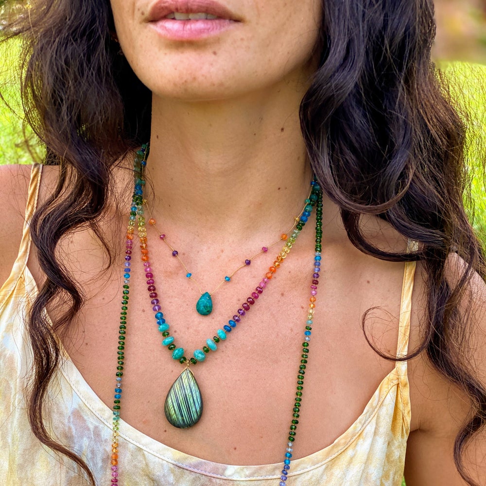 Perhaps the quintessential beginning of Rainbow Gems Kauai, our rainbow drops have been adorning people for over a decade. These delicate rainbow drops showcase the full light spectrum with carefully spaced individual gemstones, culminating in a featured crystalline drop. Just as rainbows herald new beginnings and luck these exquisite strands are the perfect place to begin your love affair with Amalia’s artwork. Many find that once they put on their rainbow drop they never take it off again, such is the nature of love. These strands are perfect for the minimalist at heart and make a striking impression stacked in a series with our other collections.