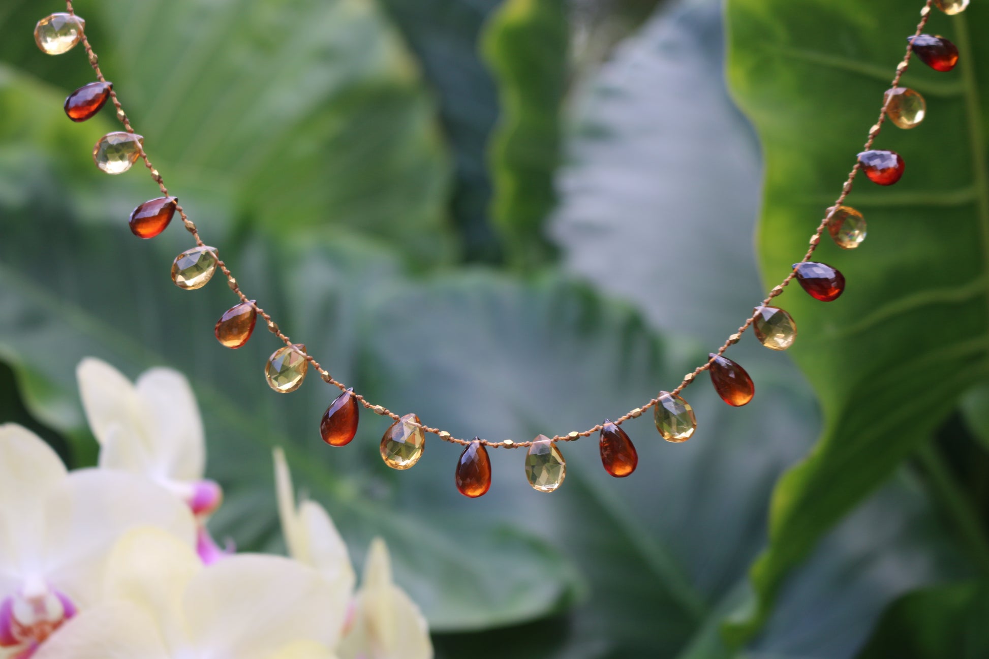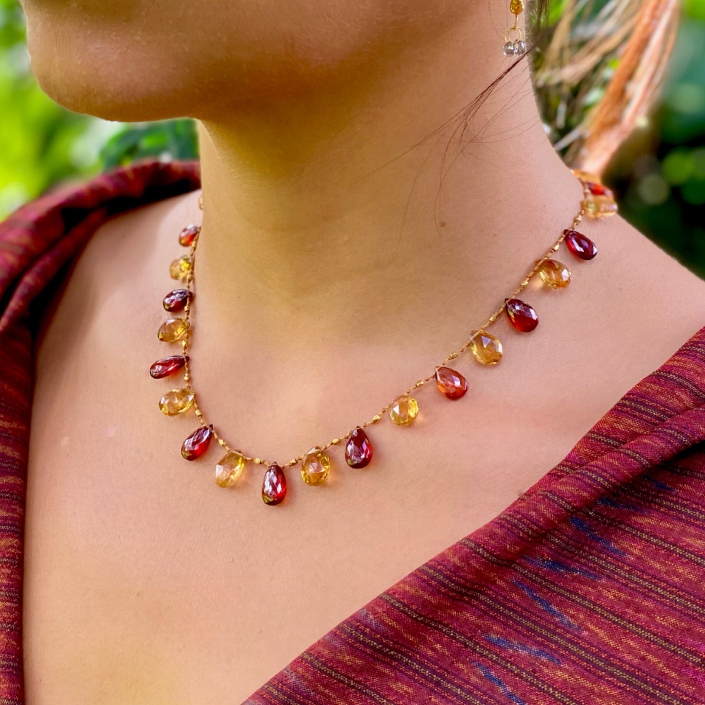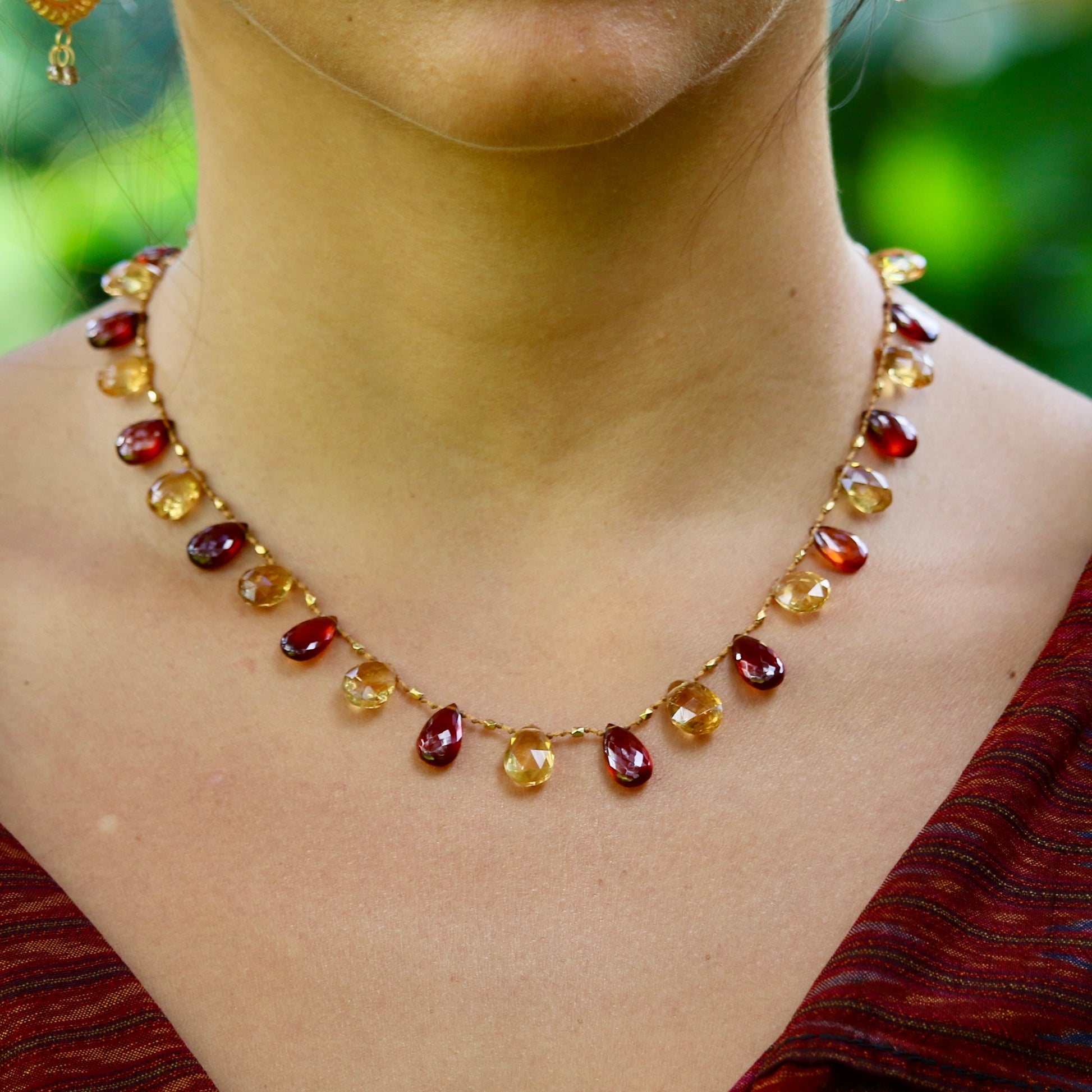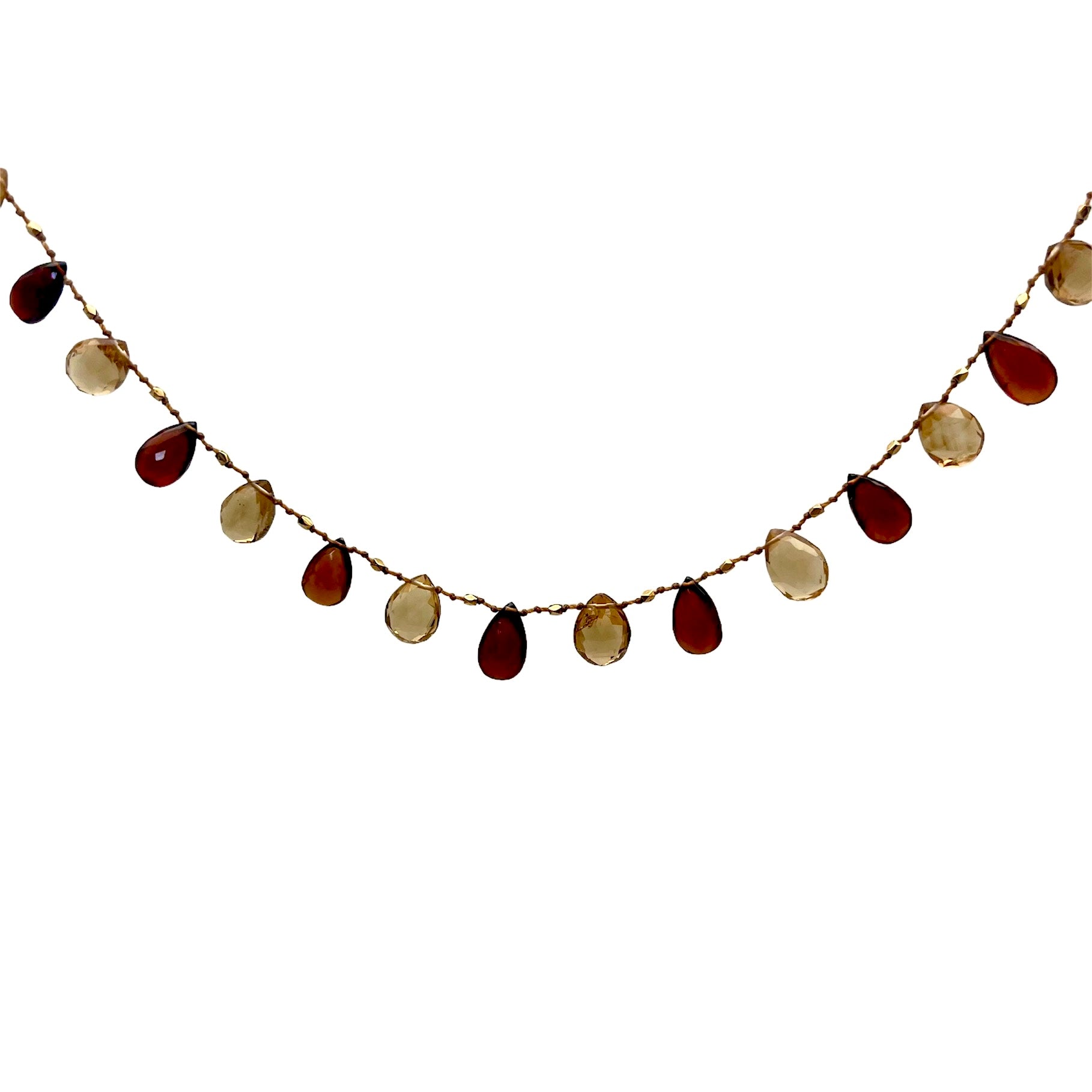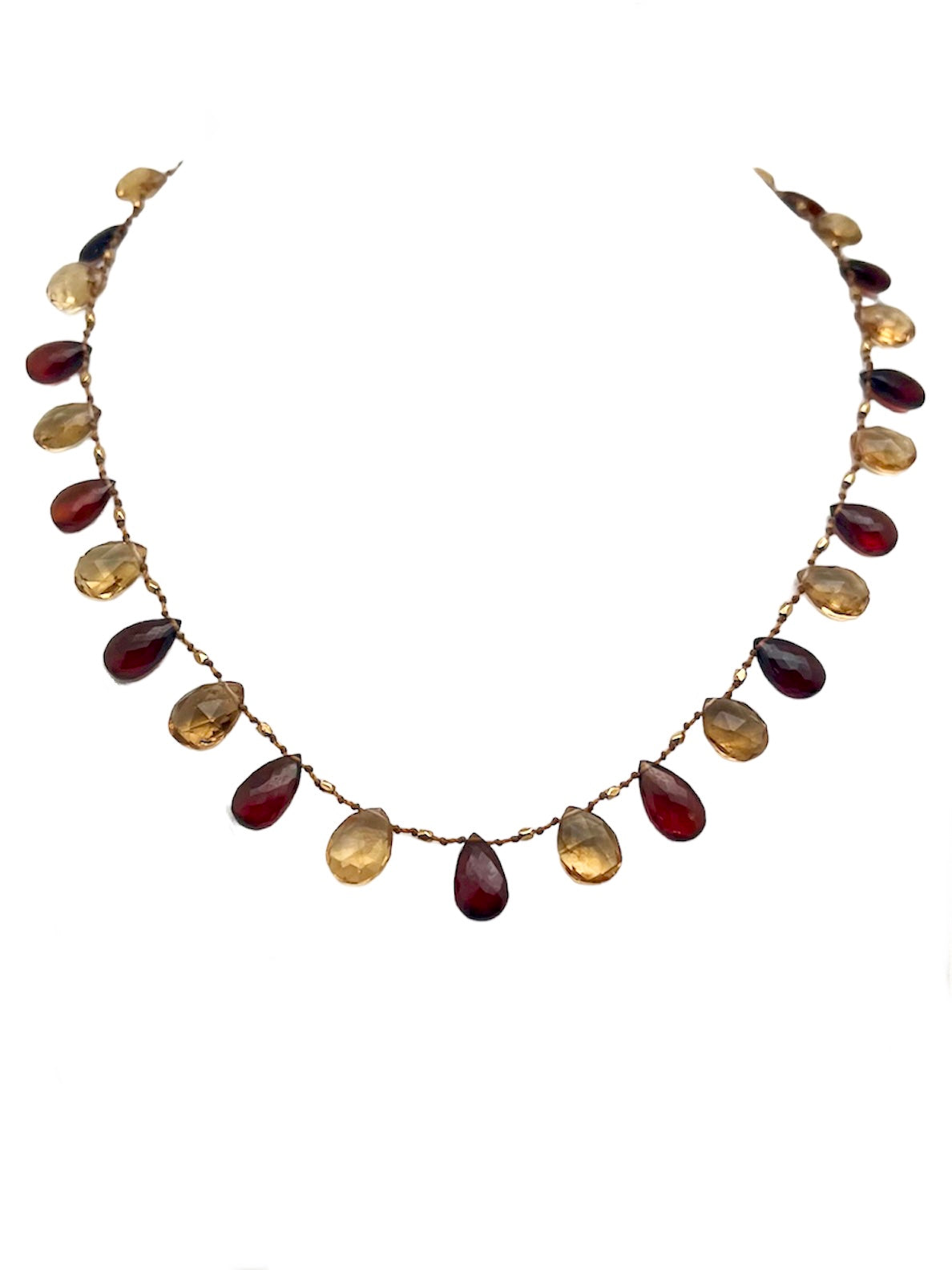 Beautifully Deep Red Garnet alternating with golden drops of Citrine delicately spaced with handmade solid 18k gold beads