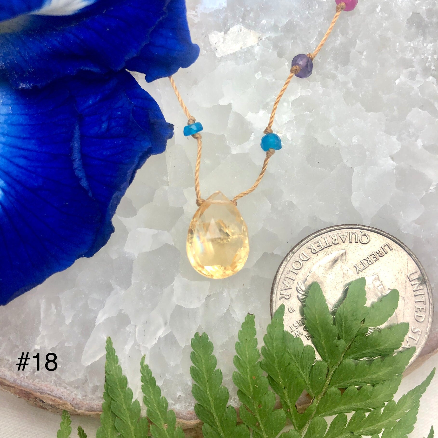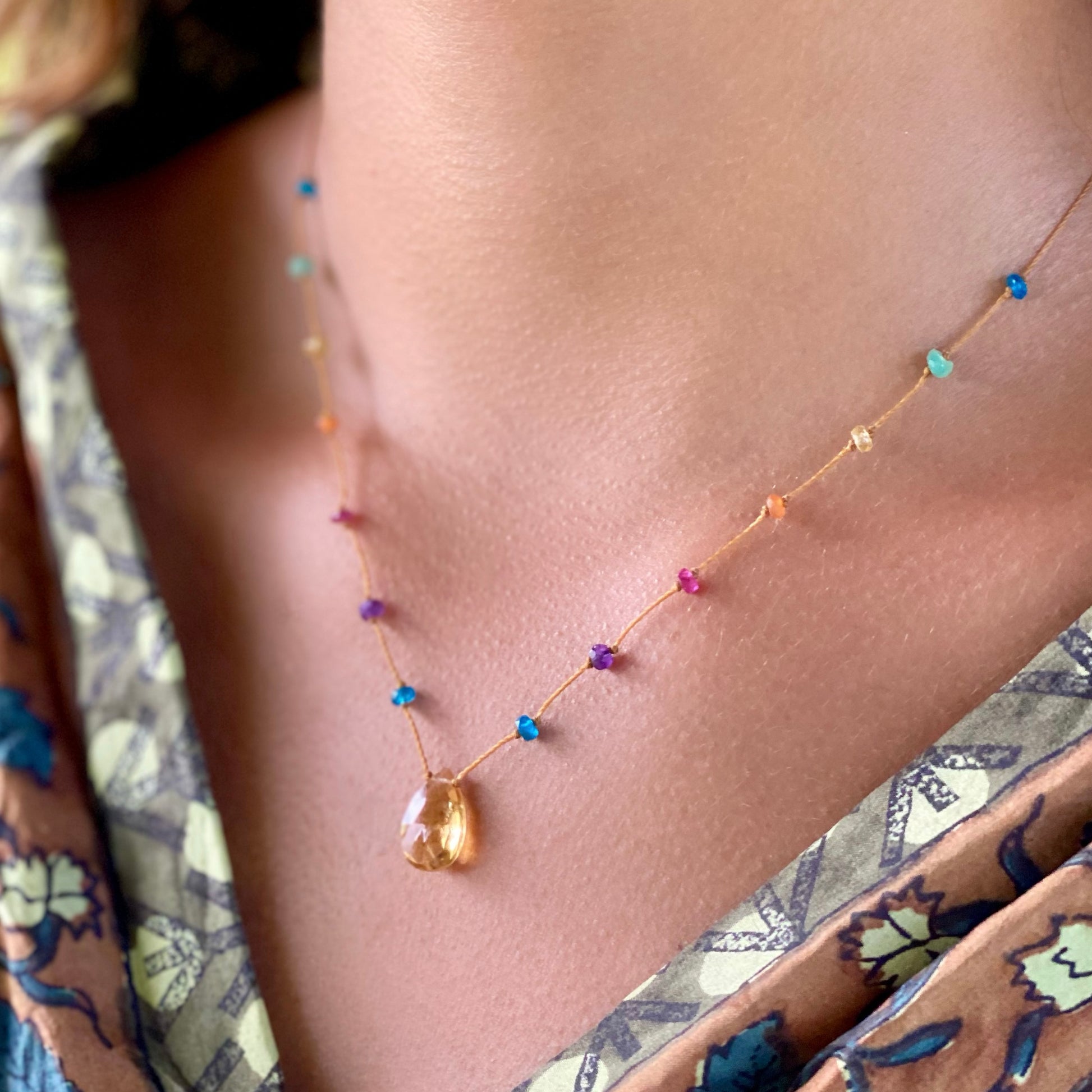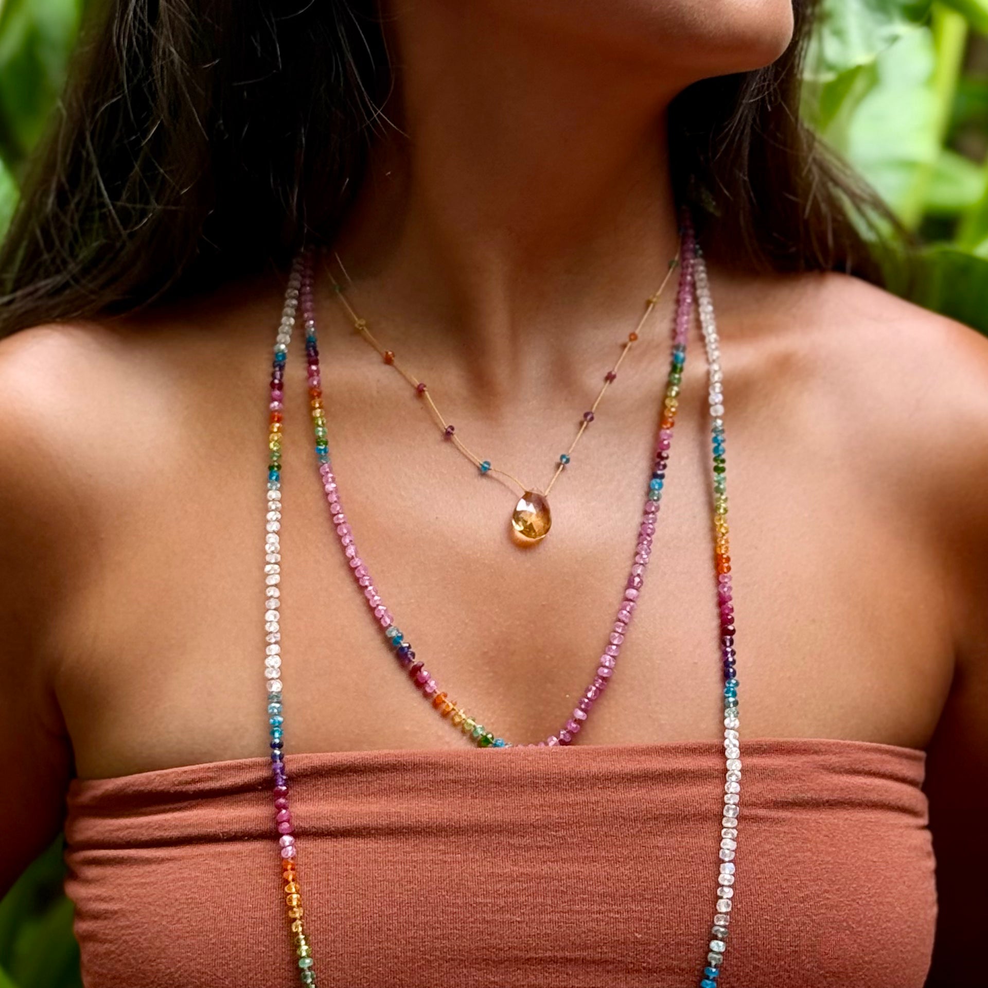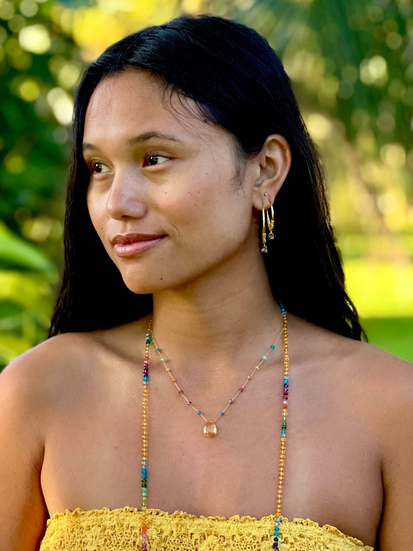 Perhaps the quintessential beginning of Rainbow Gems Kauai, our rainbow drops have been adorning people for over a decade. These delicate rainbow drops showcase the full light spectrum with carefully spaced individual gemstones, culminating in a featured crystalline drop. Just as rainbows herald new beginnings and luck these exquisite strands are the perfect place to begin your love affair with Amalia’s artwork. Many find that once they put on their rainbow drop they never take it off again, such is the nature of love. These strands are perfect for the minimalist at heart and make a striking impression stacked in a series with our other collections.