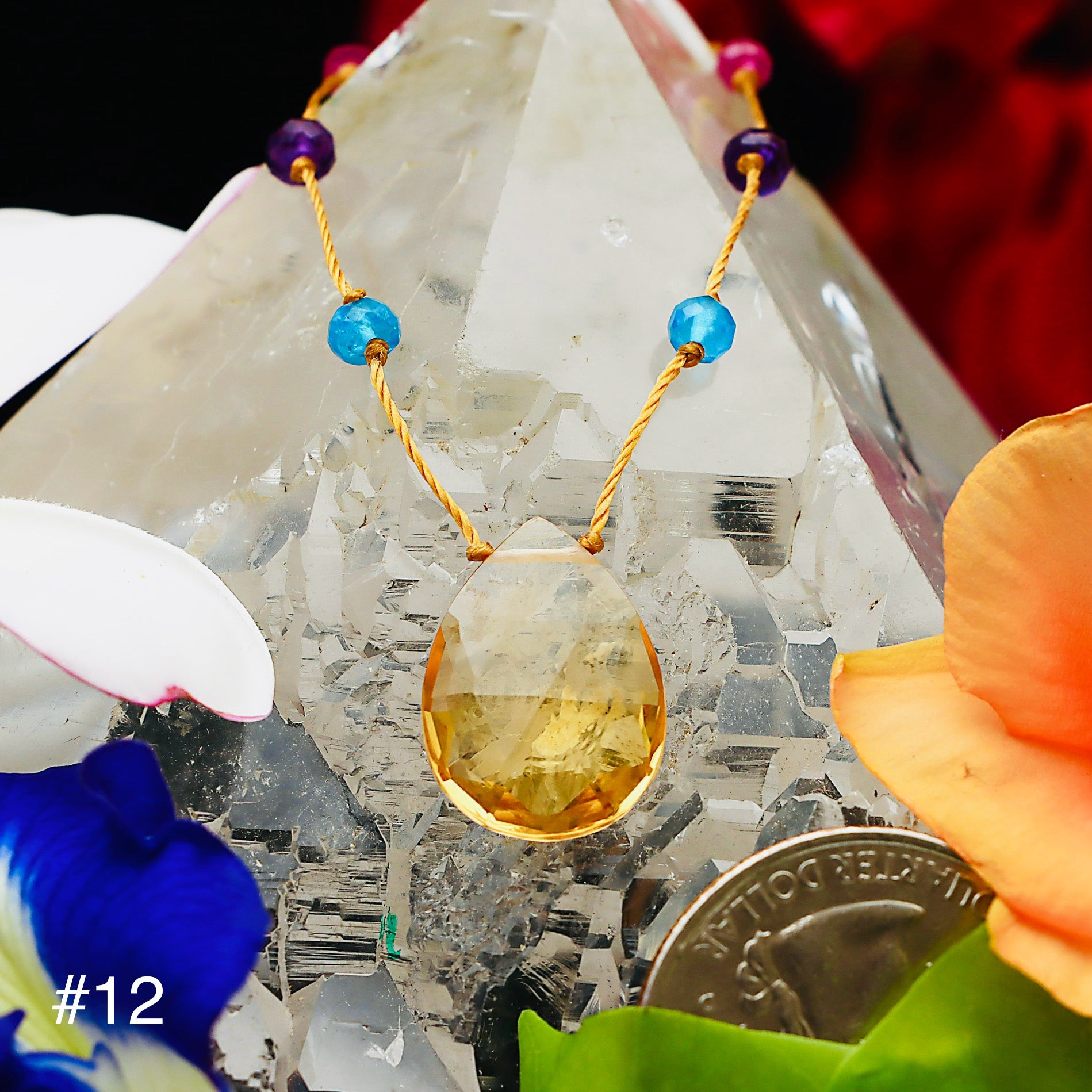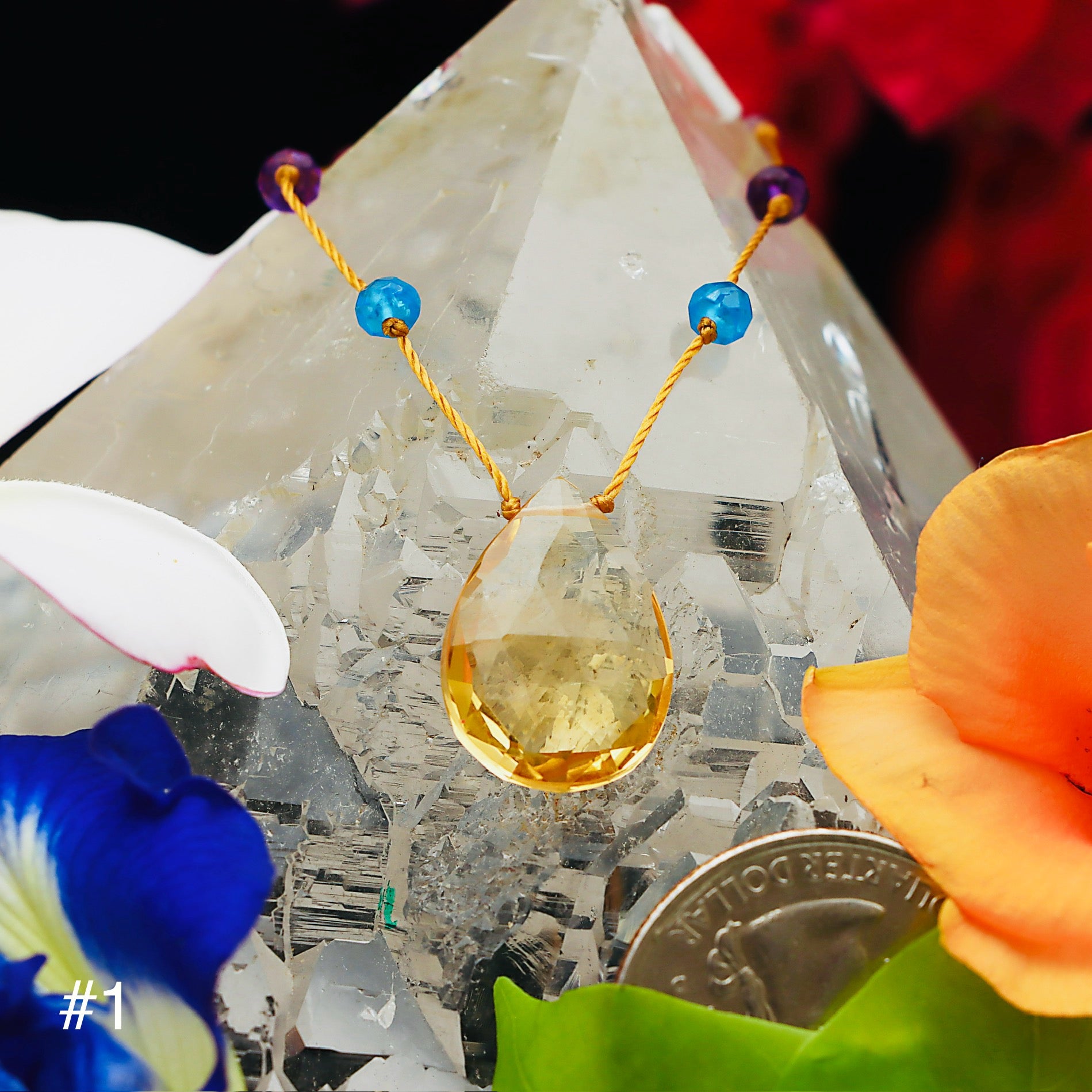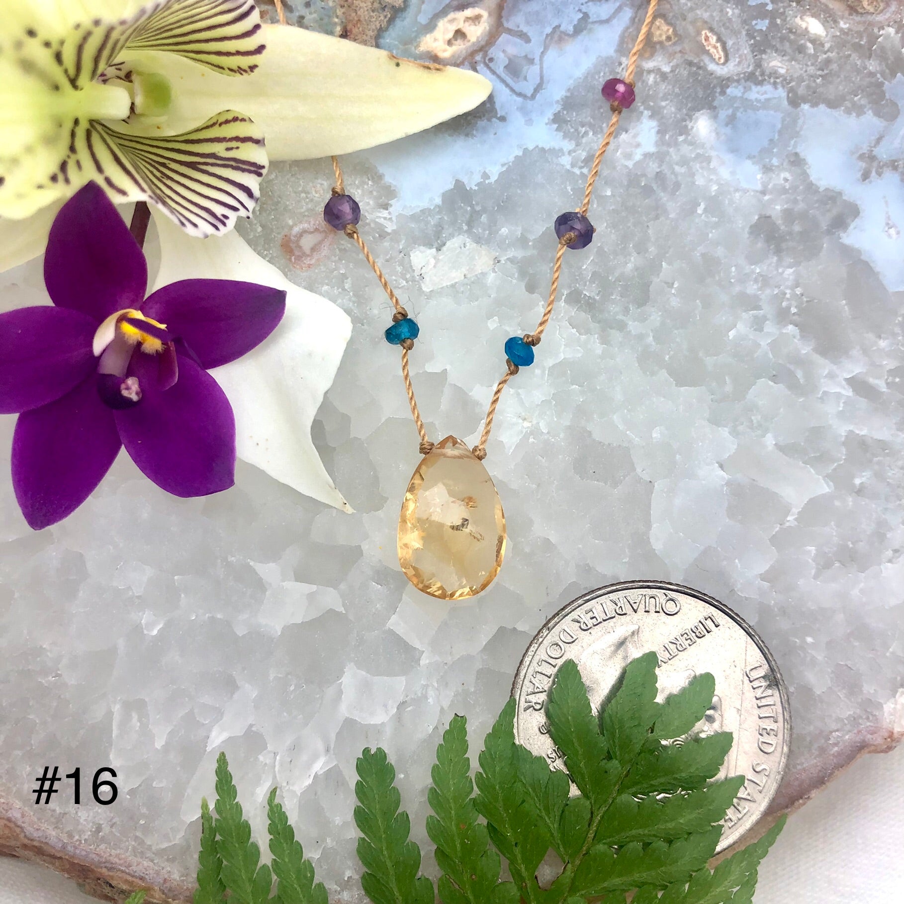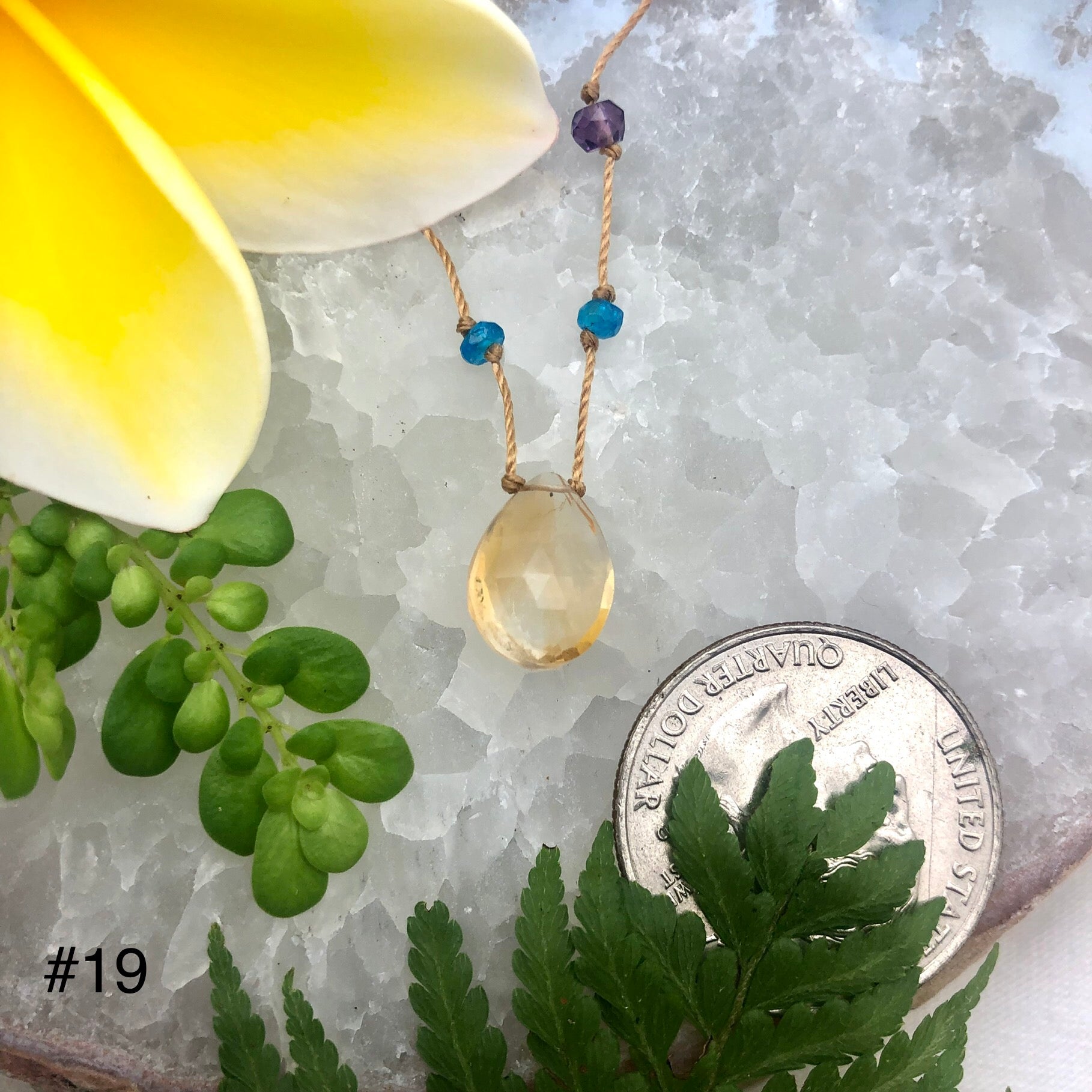 Perhaps the quintessential beginning of Rainbow Gems Kauai, our rainbow drops have been adorning people for over a decade. These delicate rainbow drops showcase the full light spectrum with carefully spaced individual gemstones, culminating in a featured crystalline drop. Just as rainbows herald new beginnings and luck these exquisite strands are the perfect place to begin your love affair with Amalia’s artwork. Many find that once they put on their rainbow drop they never take it off again, such is the nature of love. These strands are perfect for the minimalist at heart and make a striking impression stacked in a series with our other collections.