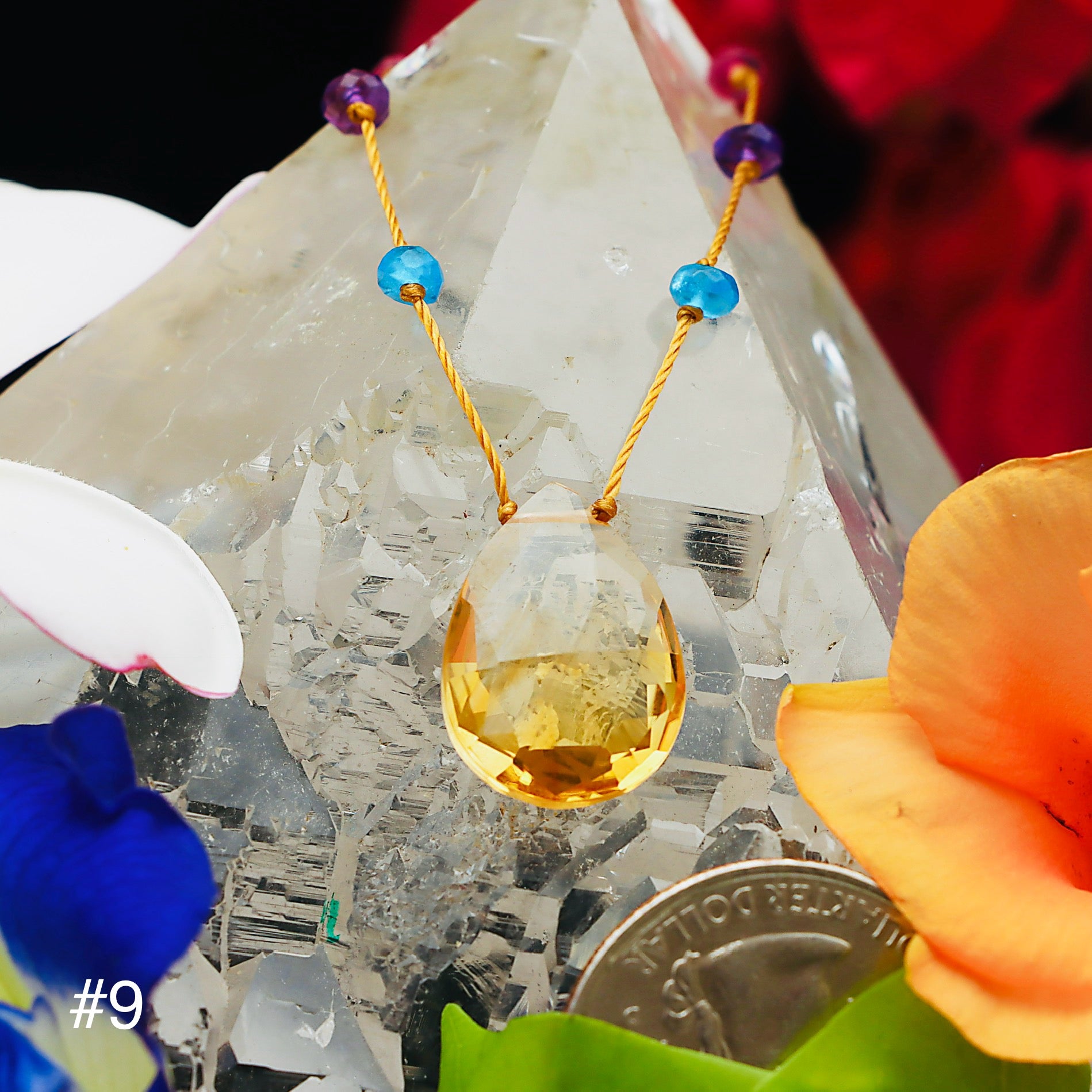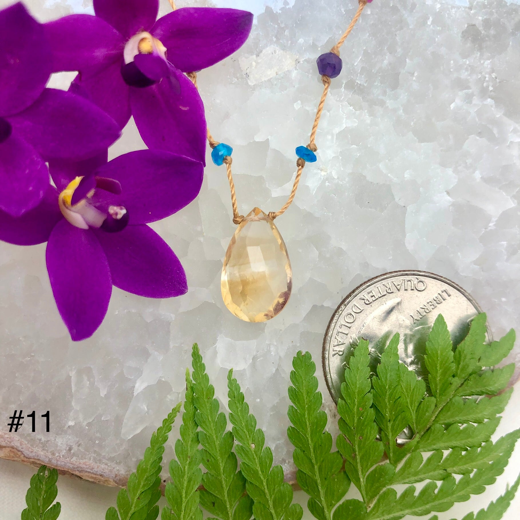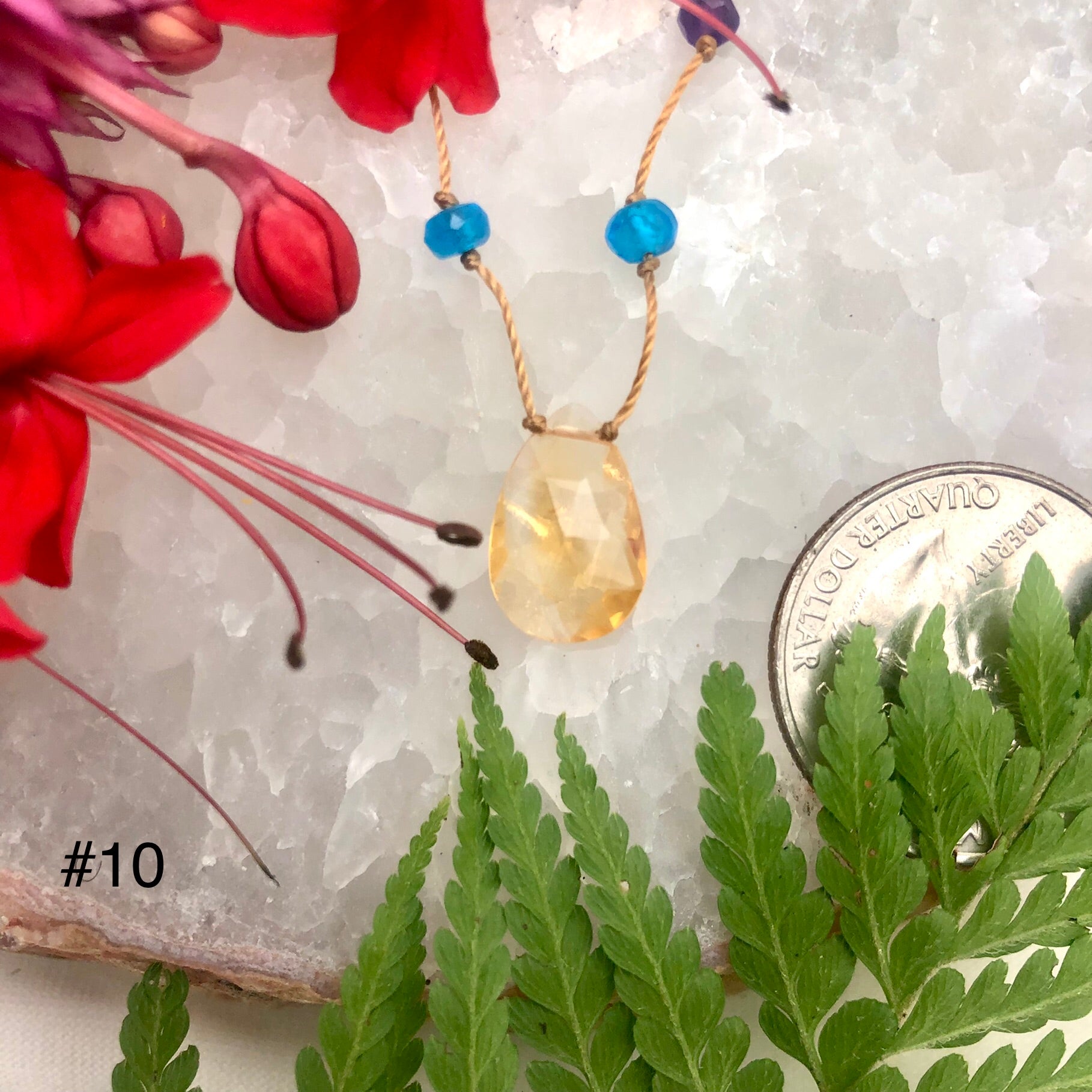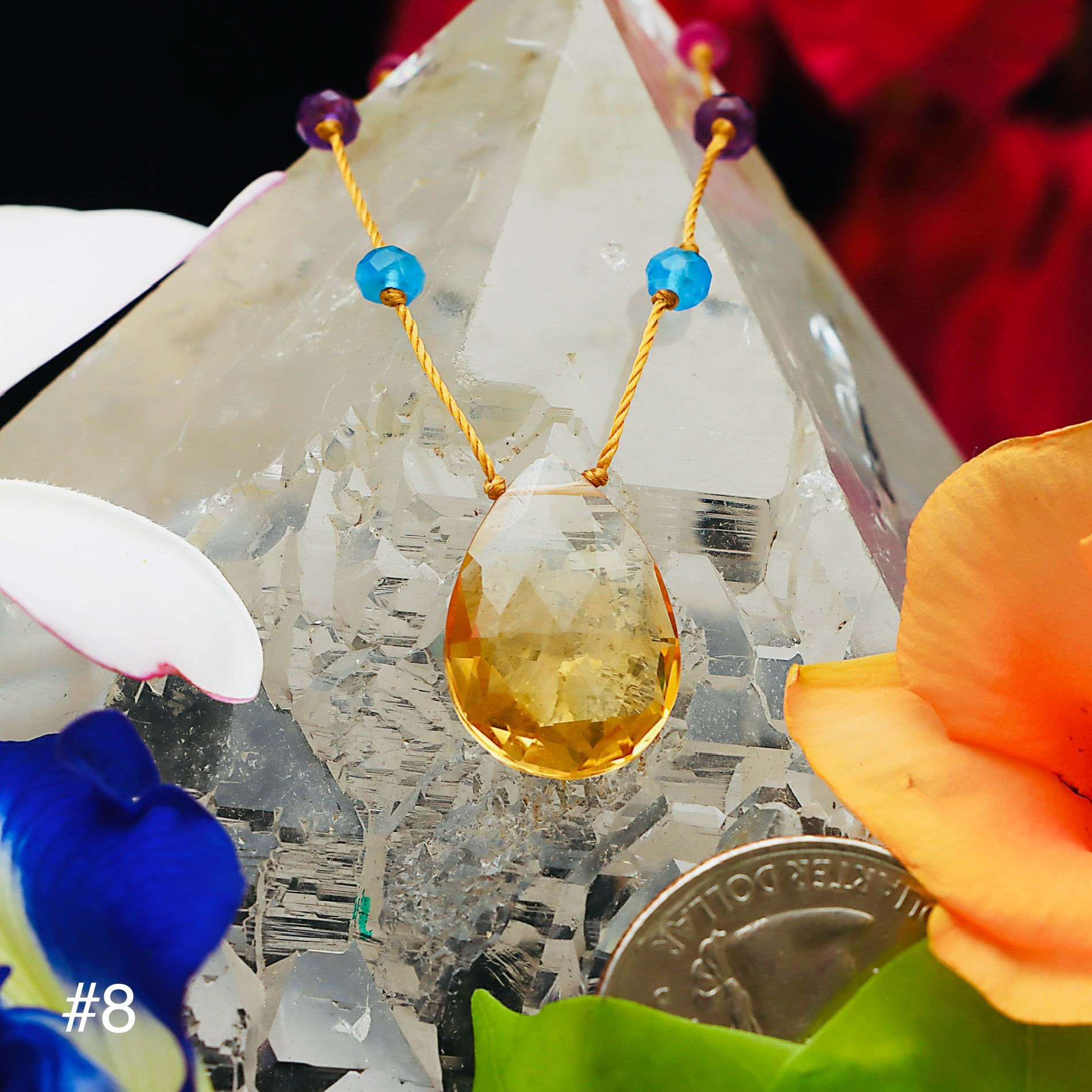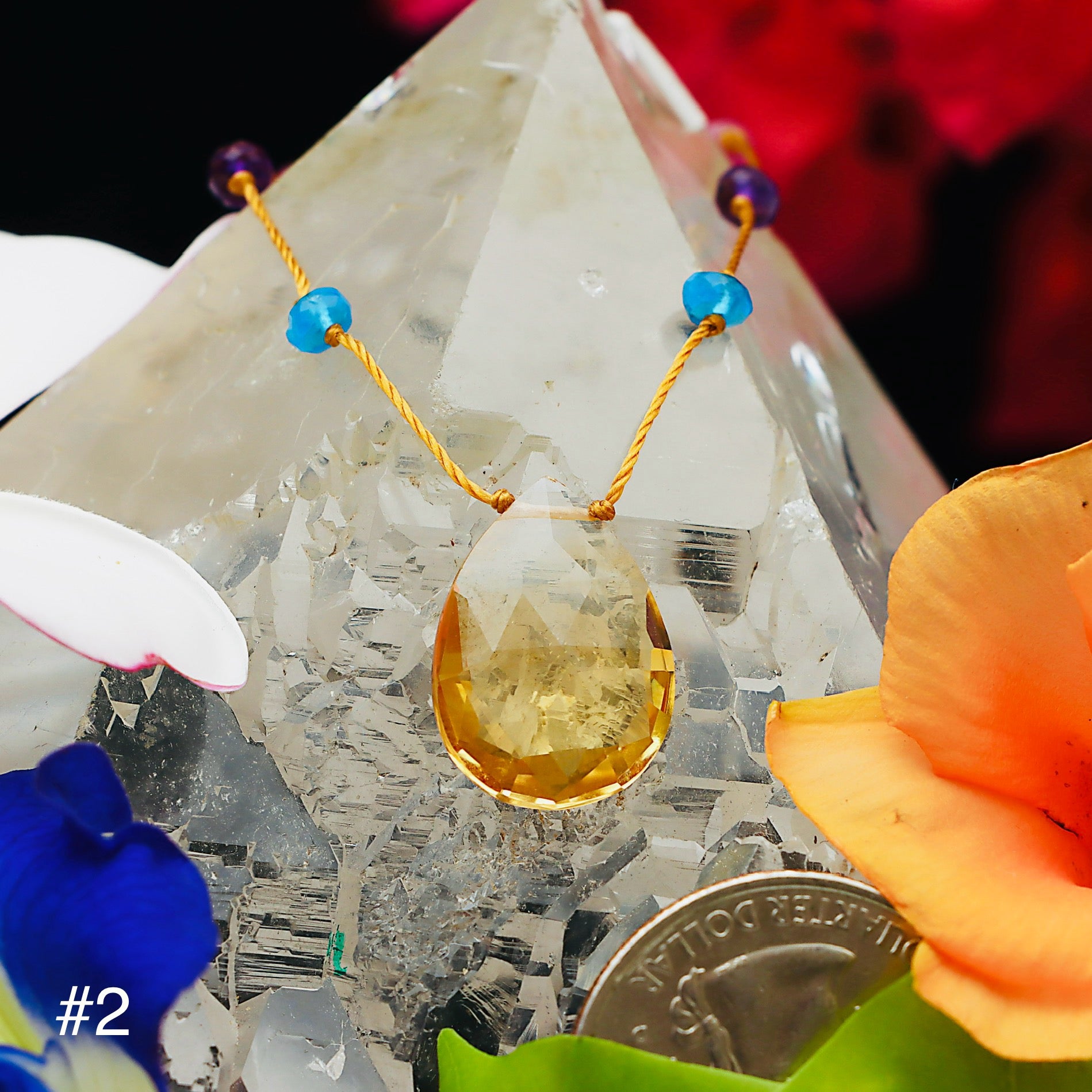 Perhaps the quintessential beginning of Rainbow Gems Kauai, our rainbow drops have been adorning people for over a decade. These delicate rainbow drops showcase the full light spectrum with carefully spaced individual gemstones, culminating in a featured crystalline drop. Just as rainbows herald new beginnings and luck these exquisite strands are the perfect place to begin your love affair with Amalia’s artwork. Many find that once they put on their rainbow drop they never take it off again, such is the nature of love. These strands are perfect for the minimalist at heart and make a striking impression stacked in a series with our other collections.