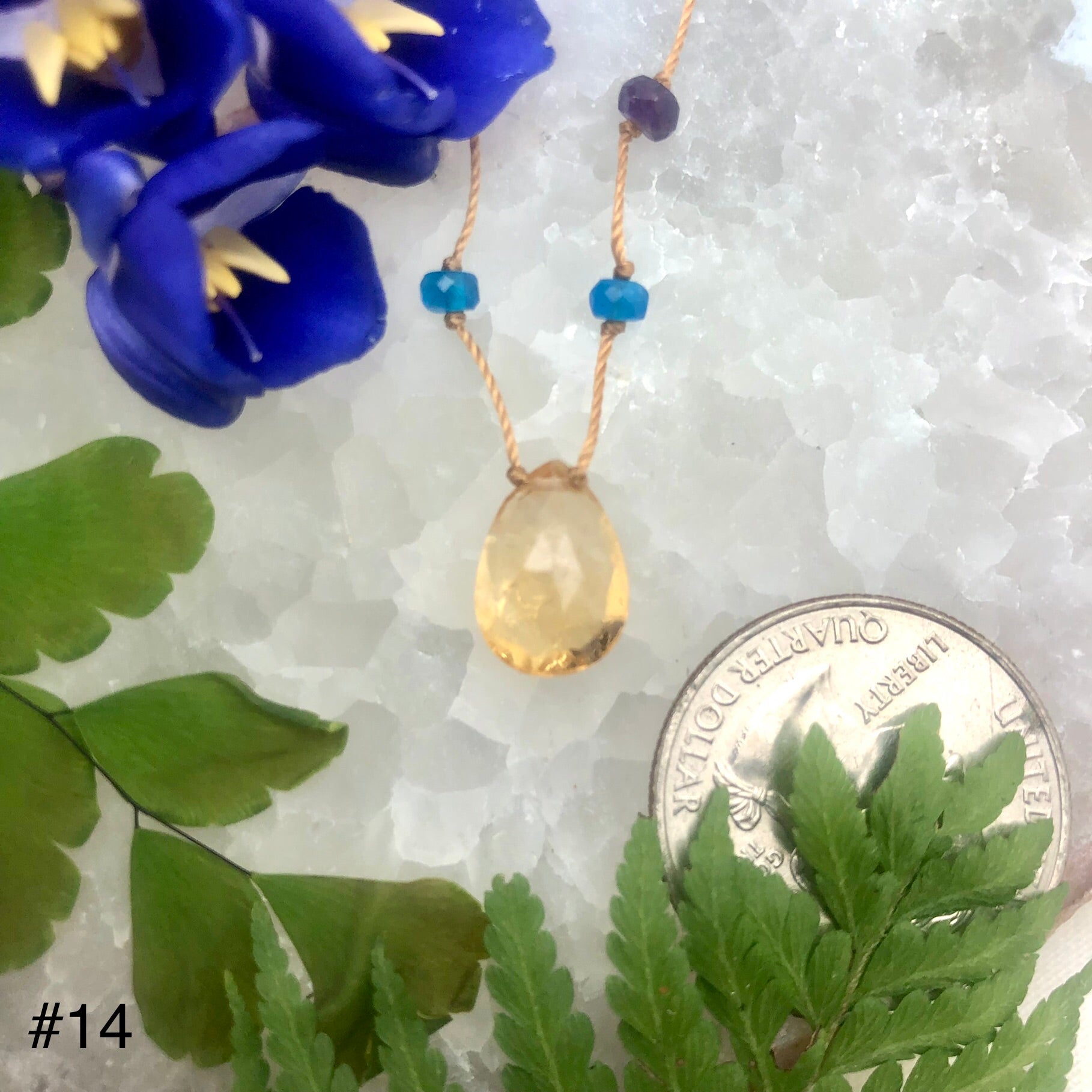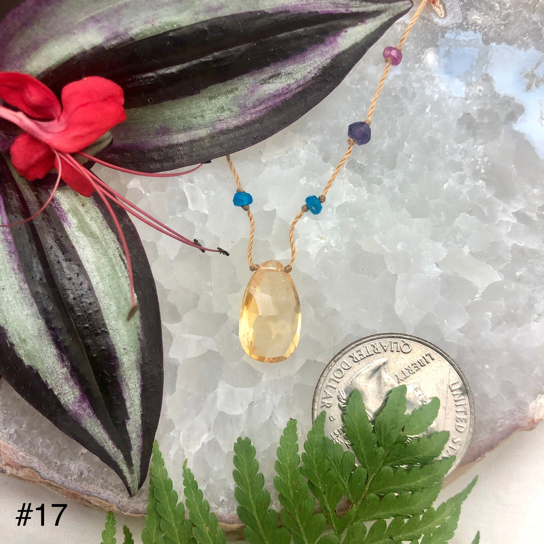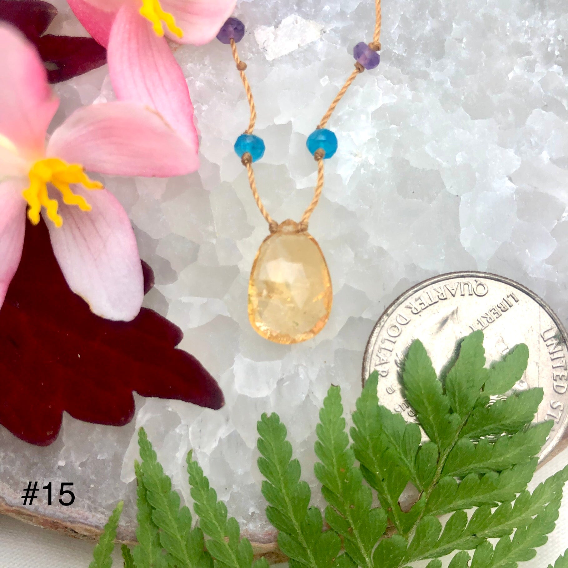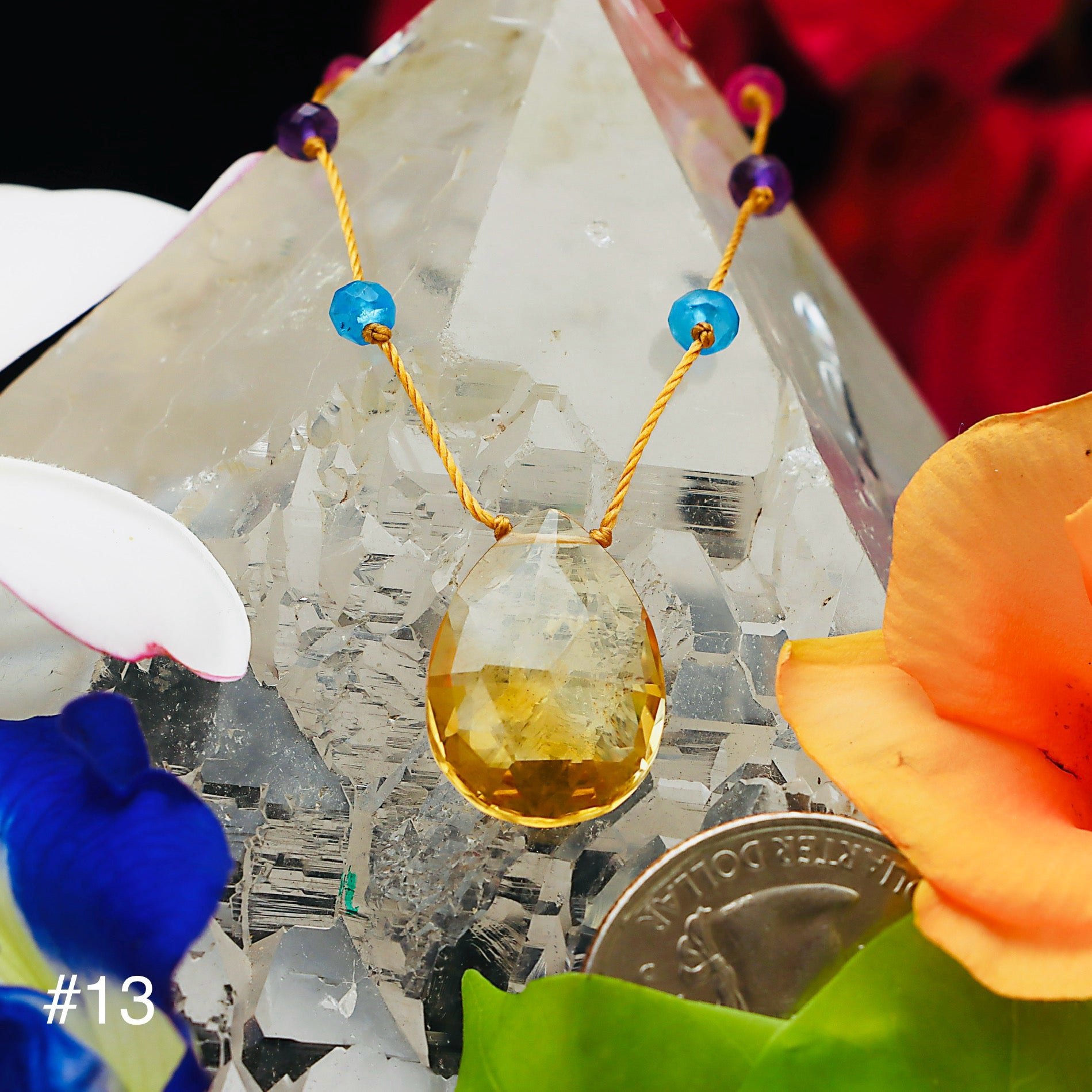 Perhaps the quintessential beginning of Rainbow Gems Kauai, our rainbow drops have been adorning people for over a decade. These delicate rainbow drops showcase the full light spectrum with carefully spaced individual gemstones, culminating in a featured crystalline drop. Just as rainbows herald new beginnings and luck these exquisite strands are the perfect place to begin your love affair with Amalia’s artwork. Many find that once they put on their rainbow drop they never take it off again, such is the nature of love. These strands are perfect for the minimalist at heart and make a striking impression stacked in a series with our other collections.