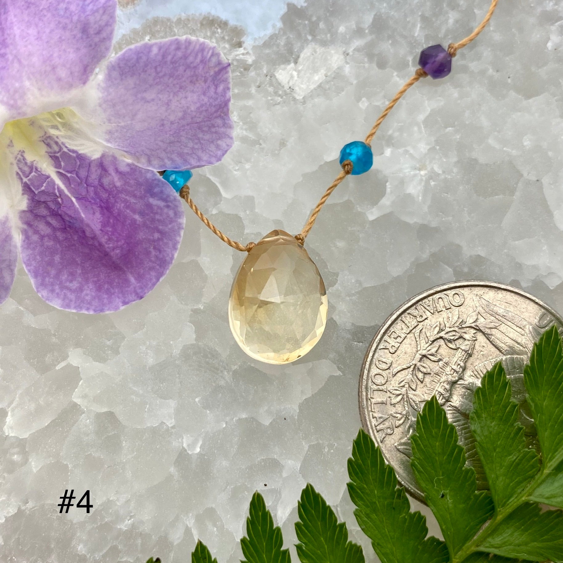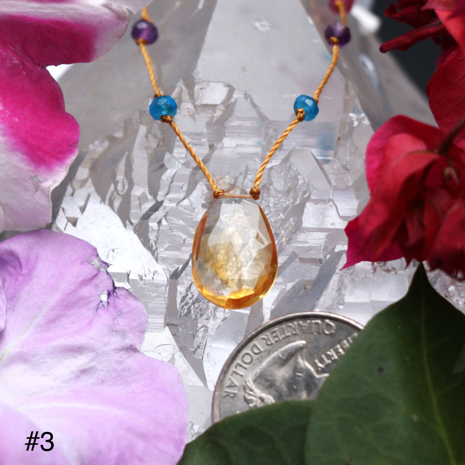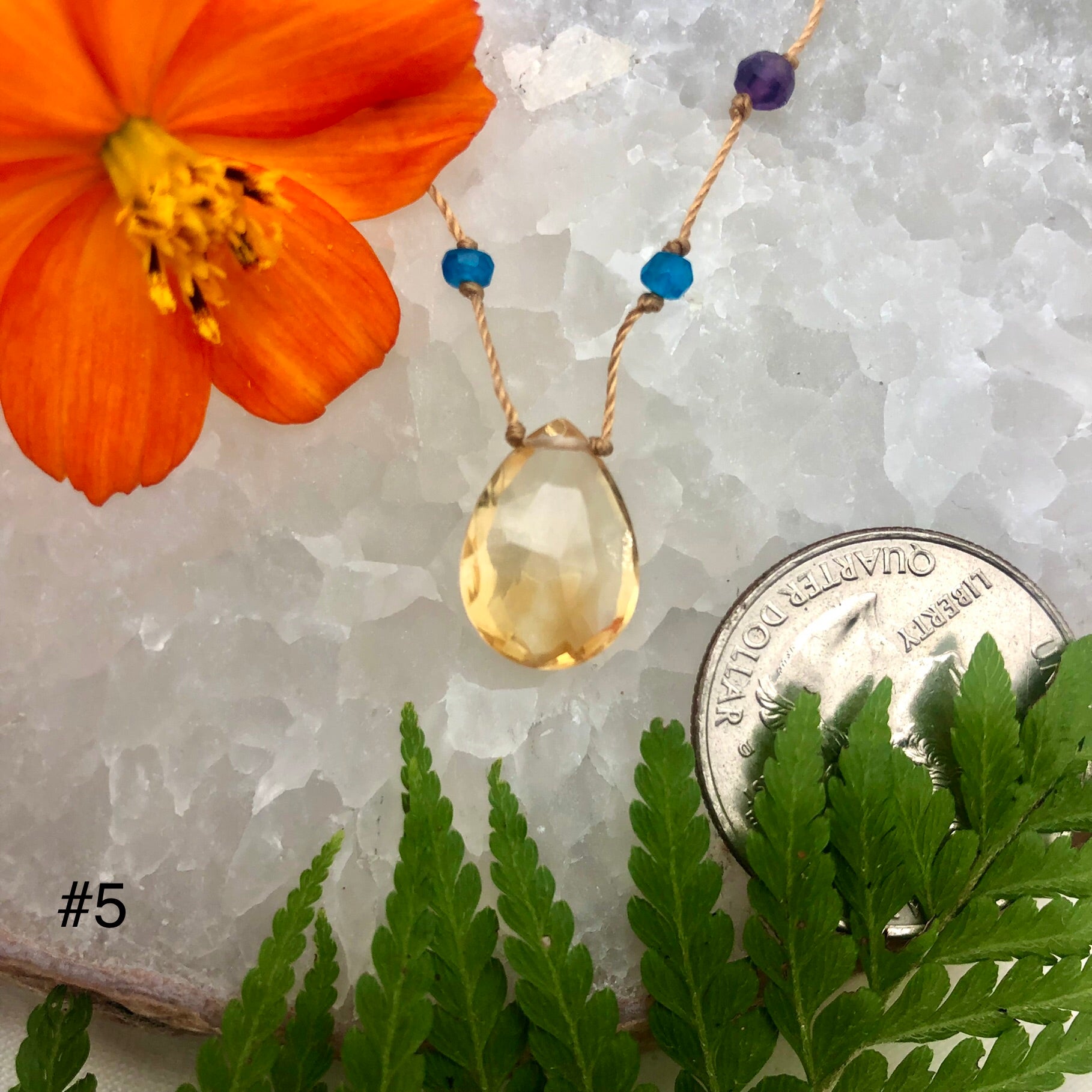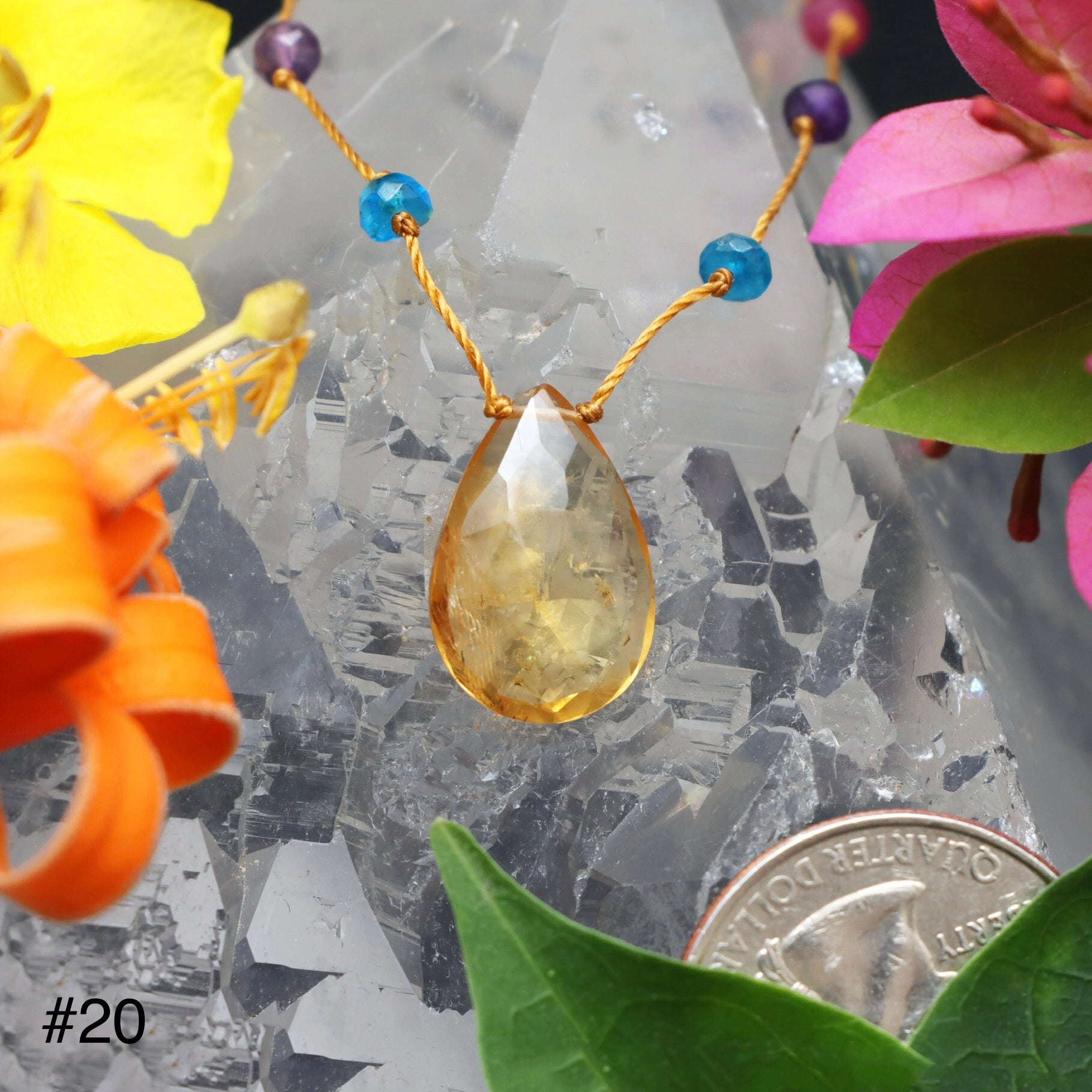 Perhaps the quintessential beginning of Rainbow Gems Kauai, our rainbow drops have been adorning people for over a decade. These delicate rainbow drops showcase the full light spectrum with carefully spaced individual gemstones, culminating in a featured crystalline drop. Just as rainbows herald new beginnings and luck these exquisite strands are the perfect place to begin your love affair with Amalia’s artwork. Many find that once they put on their rainbow drop they never take it off again, such is the nature of love. These strands are perfect for the minimalist at heart and make a striking impression stacked in a series with our other collections.