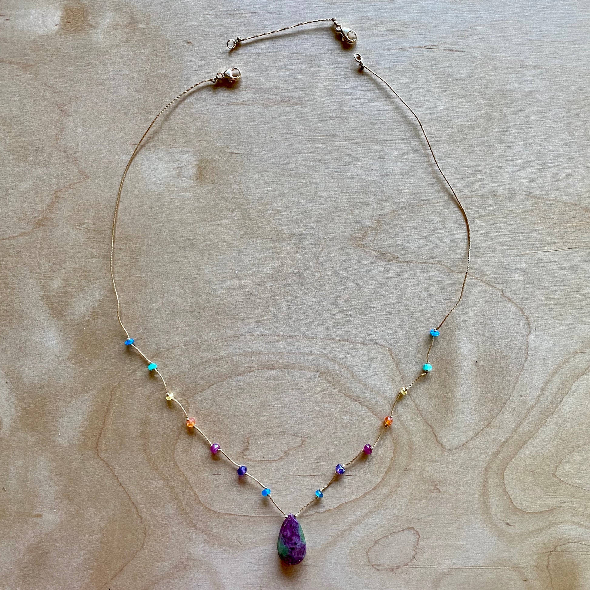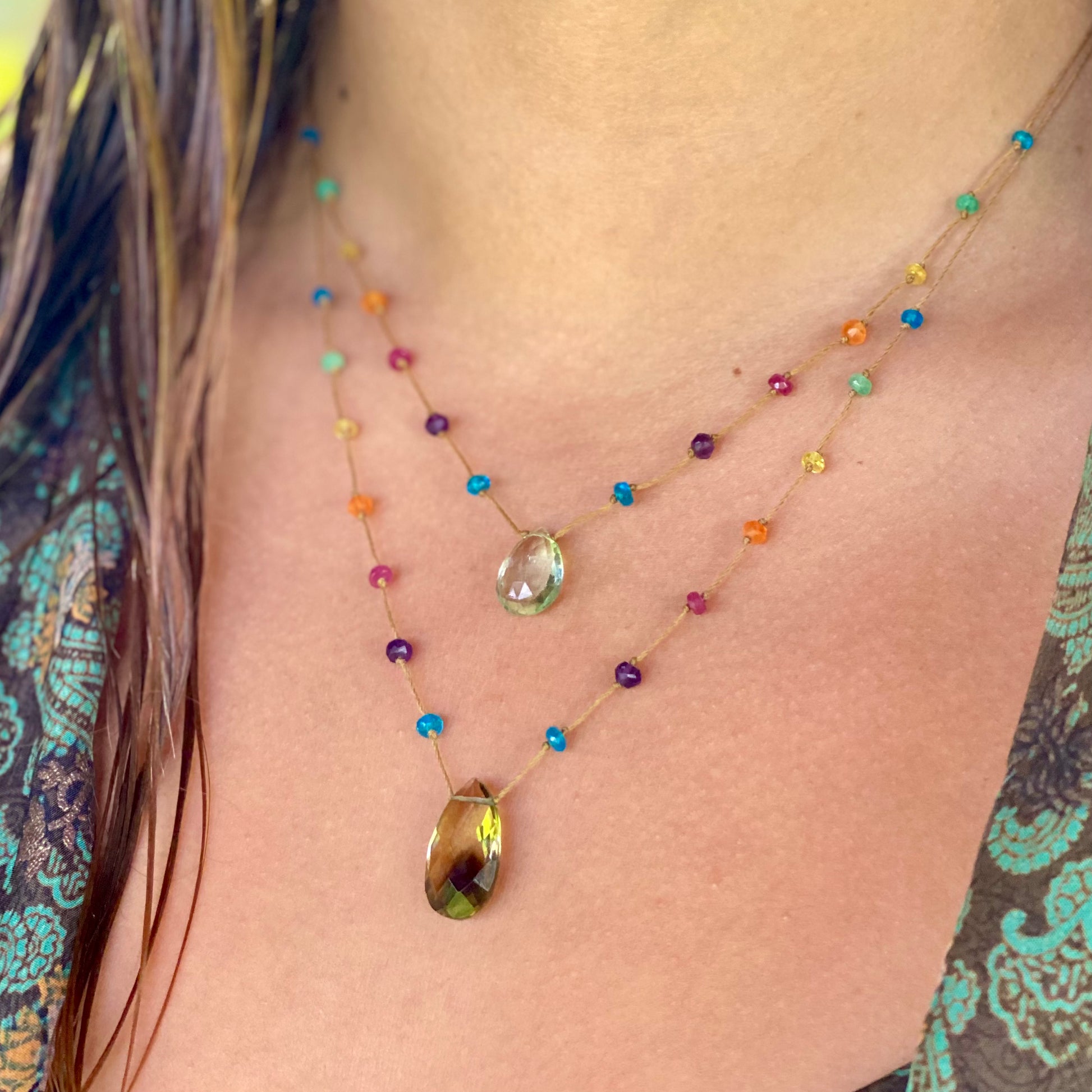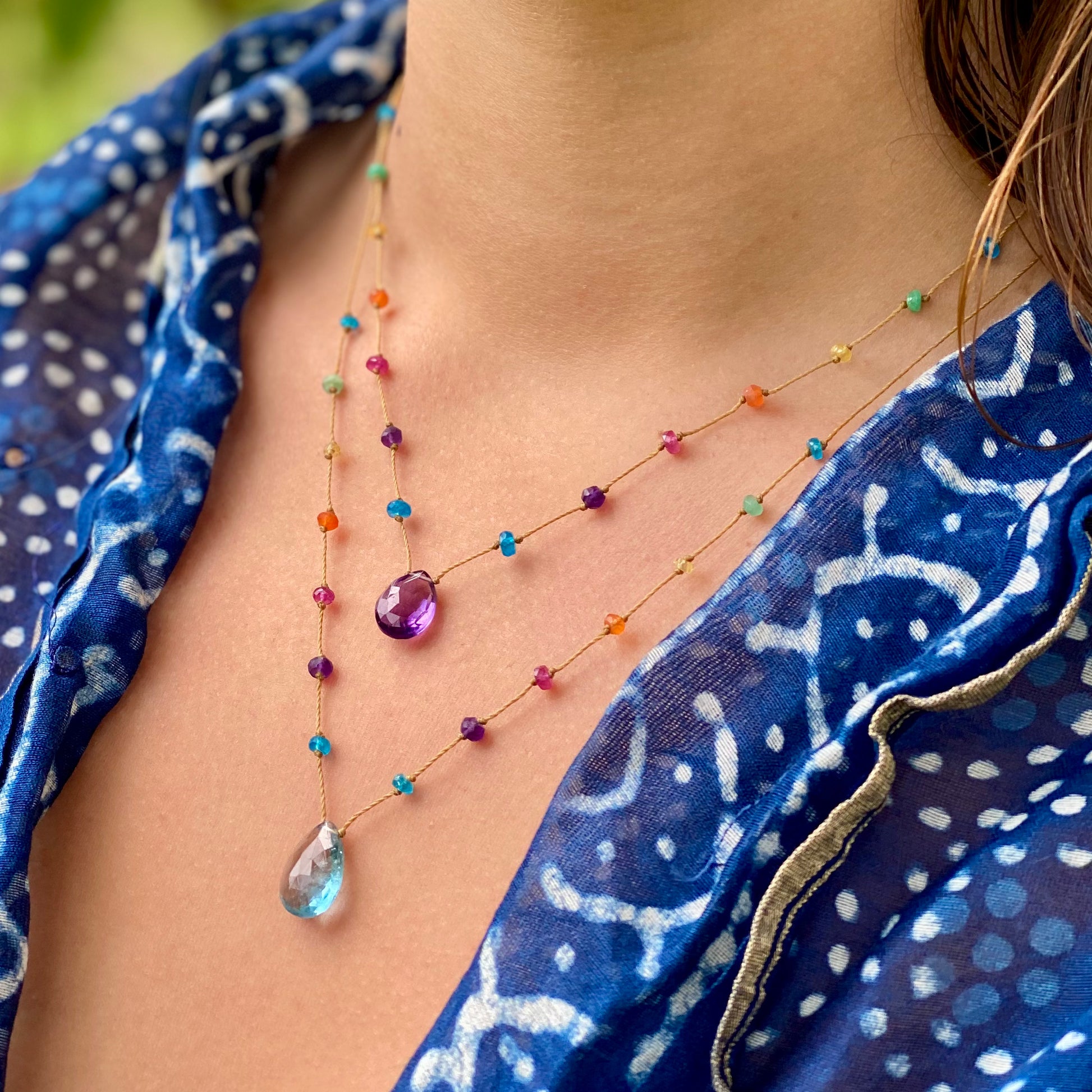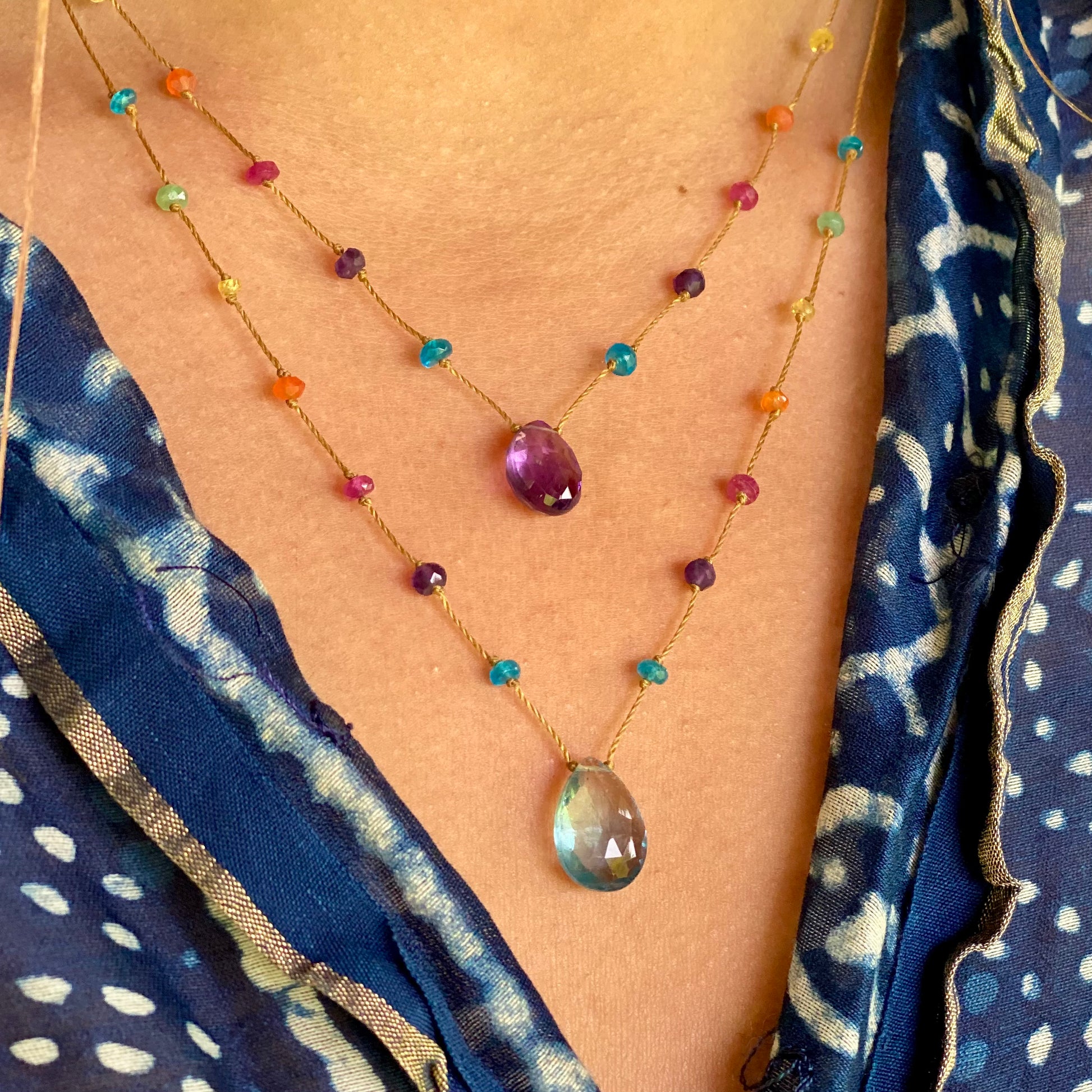 Perhaps the quintessential beginning of Rainbow Gems Kauai, our rainbow drops have been adorning people for over a decade. These delicate rainbow drops showcase the full light spectrum with carefully spaced individual gemstones, culminating in a featured crystalline drop. Just as rainbows herald new beginnings and luck these exquisite strands are the perfect place to begin your love affair with Amalia’s artwork. Many find that once they put on their rainbow drop they never take it off again, such is the nature of love. These strands are perfect for the minimalist at heart and make a striking impression stacked in a series with our other collections.
