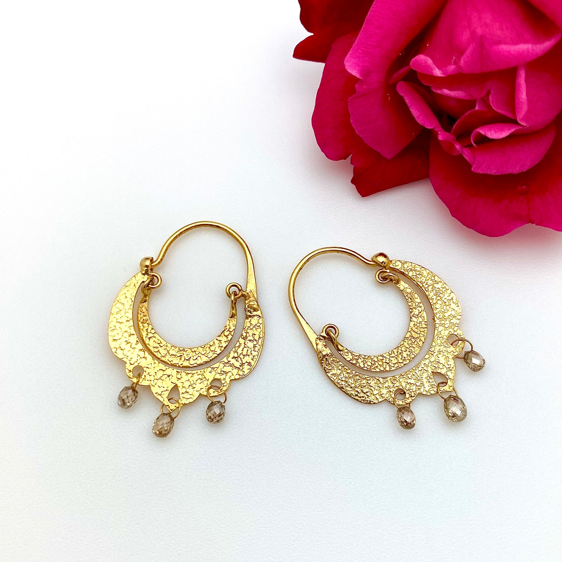 Crescent Dangle Gold Hoops with Dangling Diamonds
