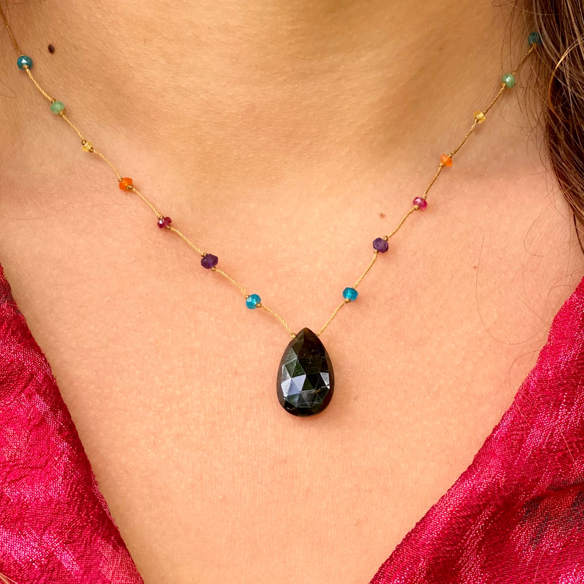 Perhaps the quintessential beginning of Rainbow Gems Kauai, our rainbow drops have been adorning people for over a decade. These delicate rainbow drops showcase the full light spectrum with carefully spaced individual gemstones, culminating in a featured crystalline drop. Just as rainbows herald new beginnings and luck these exquisite strands are the perfect place to begin your love affair with Amalia’s artwork. Many find that once they put on their rainbow drop they never take it off again, such is the nature of love. These strands are perfect for the minimalist at heart and make a striking impression stacked in a series with our other collections.