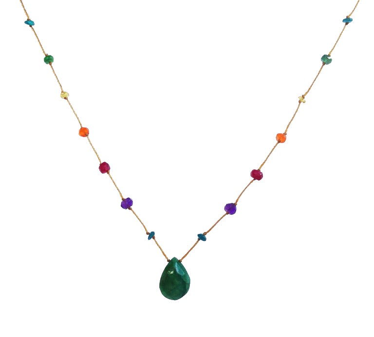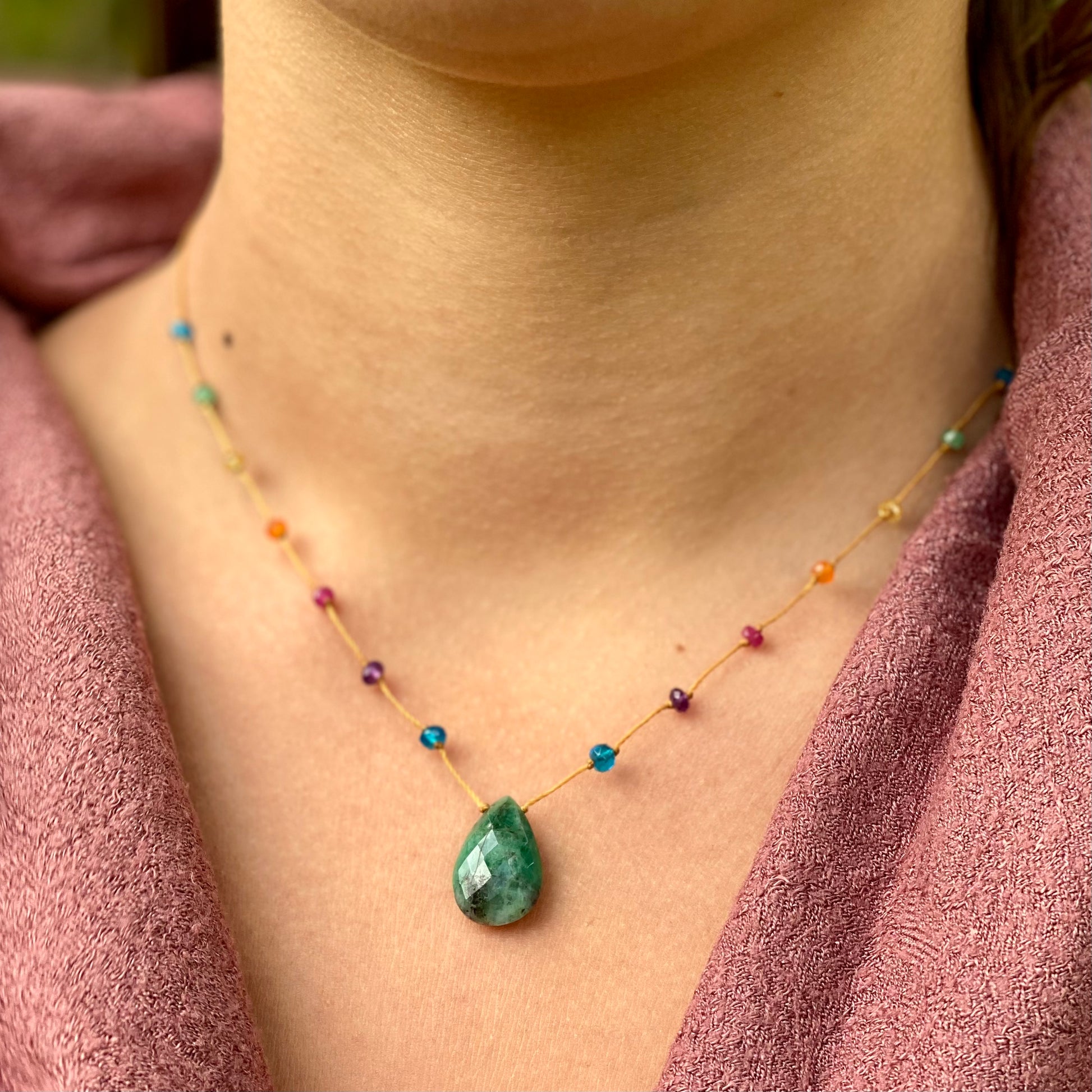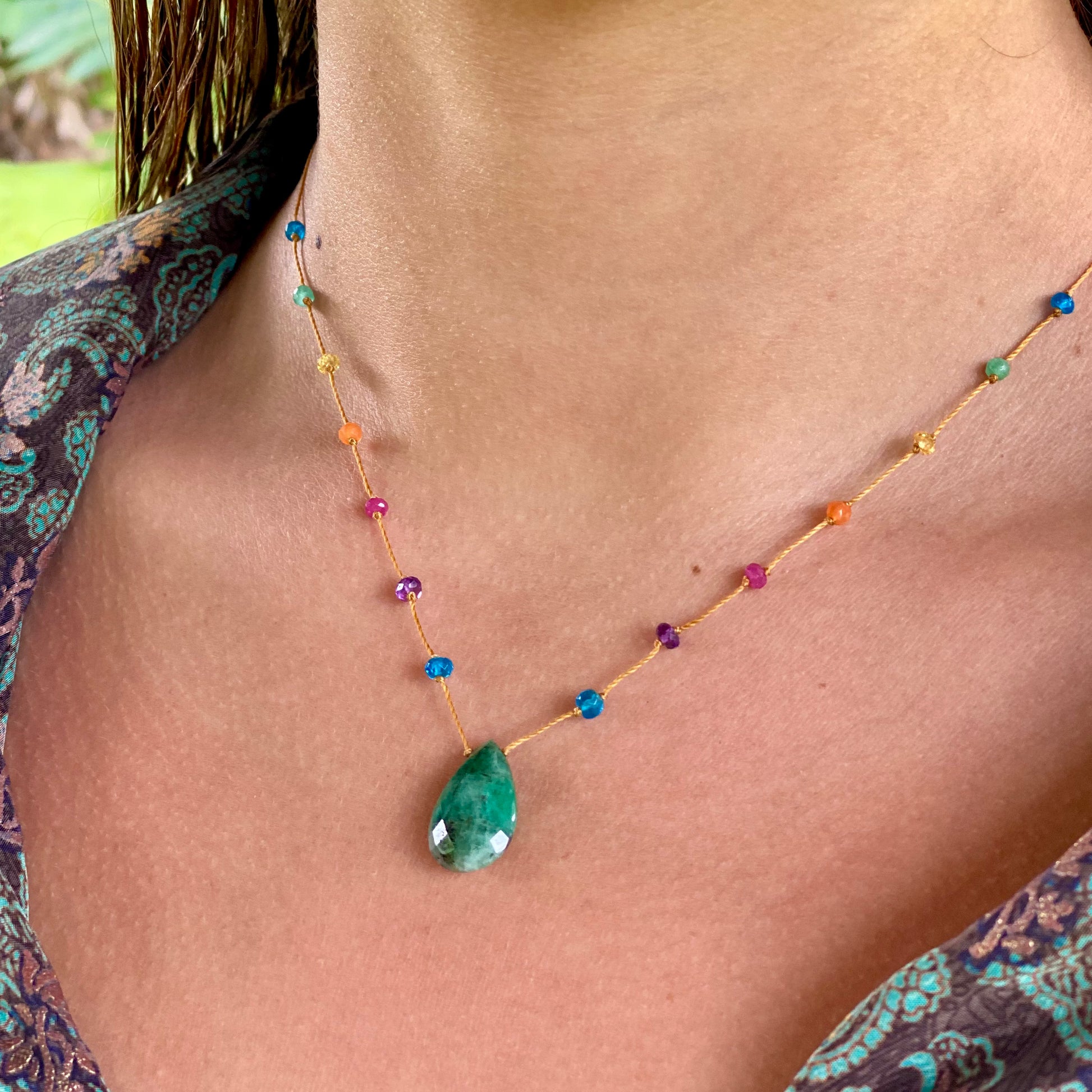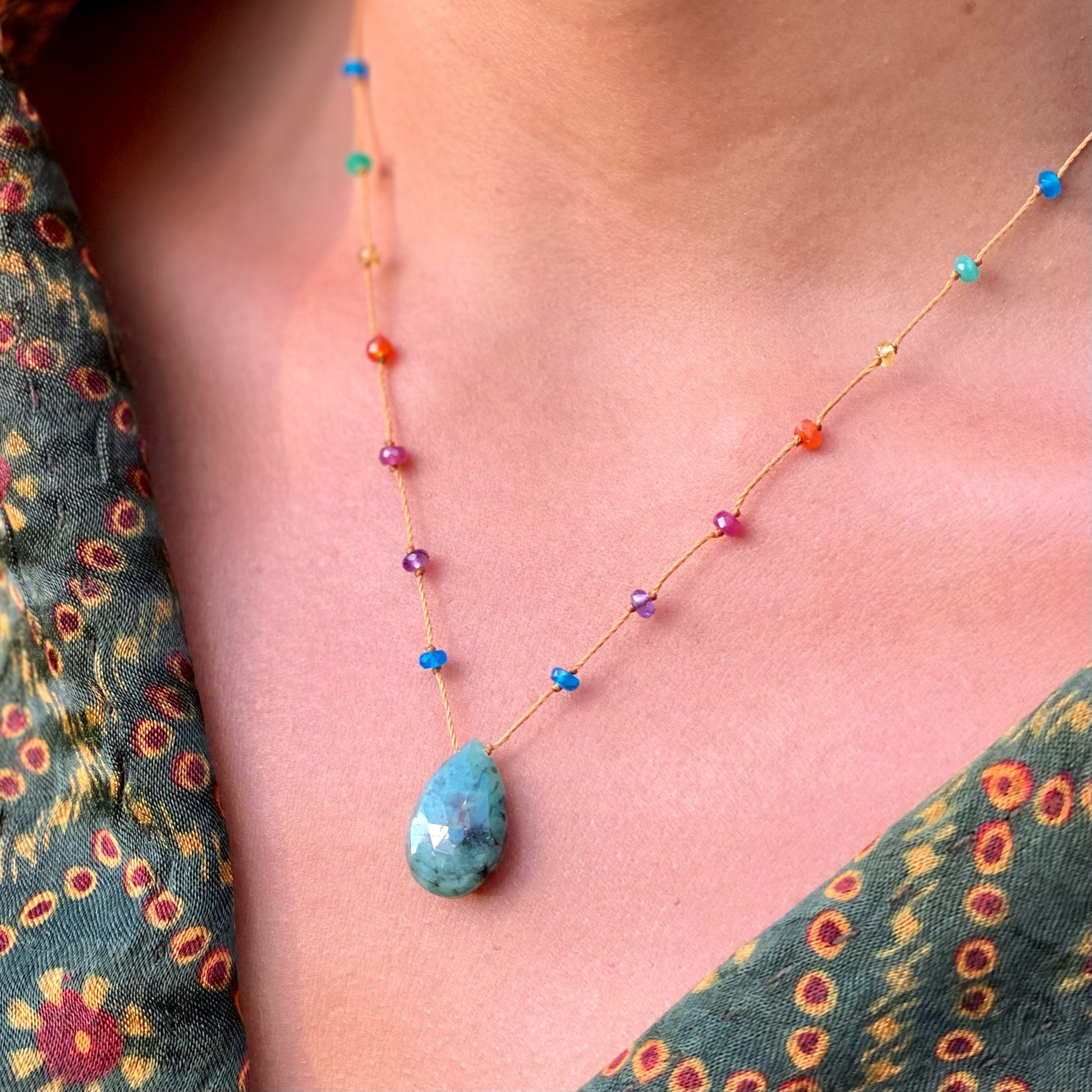 Perhaps the quintessential beginning of Rainbow Gems Kauai, our rainbow drops have been adorning people for over a decade. These delicate rainbow drops showcase the full light spectrum with carefully spaced individual gemstones, culminating in a featured crystalline drop. Just as rainbows herald new beginnings and luck these exquisite strands are the perfect place to begin your love affair with Amalia’s artwork. Many find that once they put on their rainbow drop they never take it off again, such is the nature of love. These strands are perfect for the minimalist at heart and make a striking impression stacked in a series with our other collections.