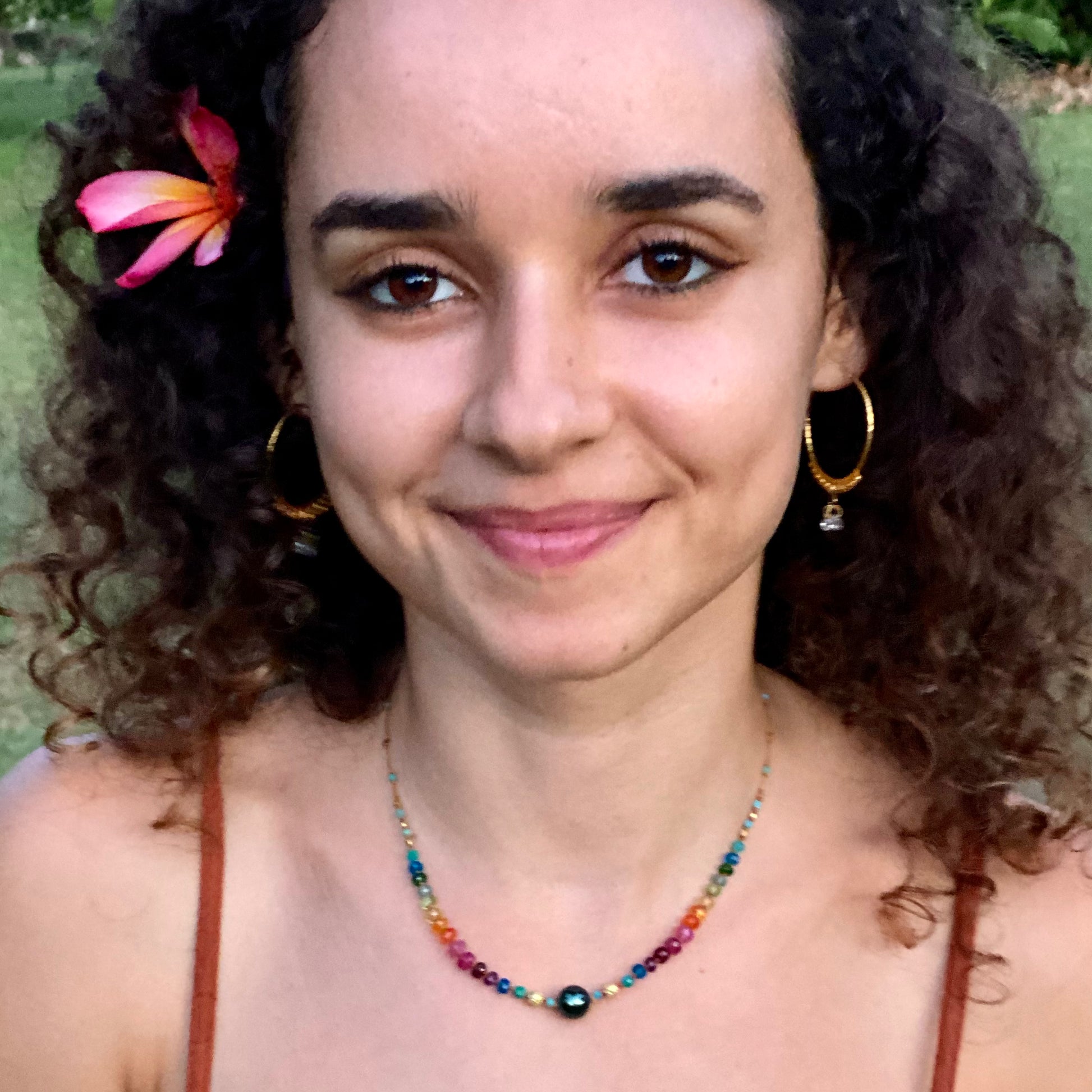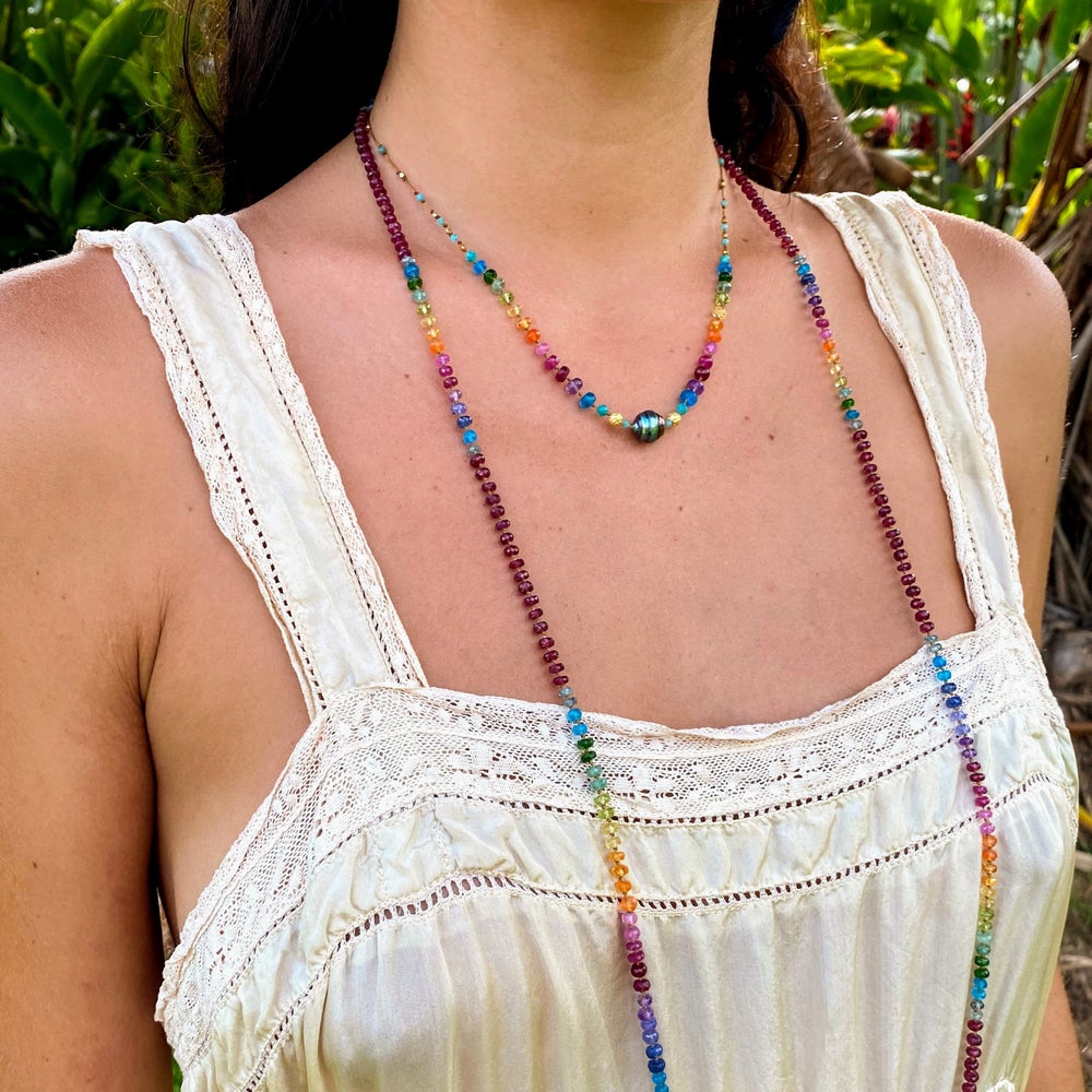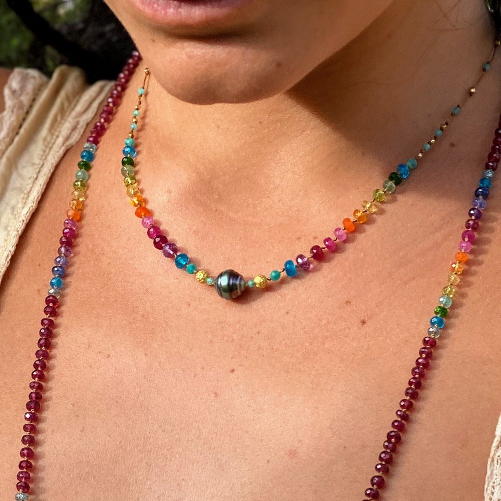 Saturated in the rainbow prism, this power piece features a dazzling 8-9mm Tahitian Pearl with handmade solid 18k gold beads and an Amazonite transition, inspiring receptivity and devotion to beauty.