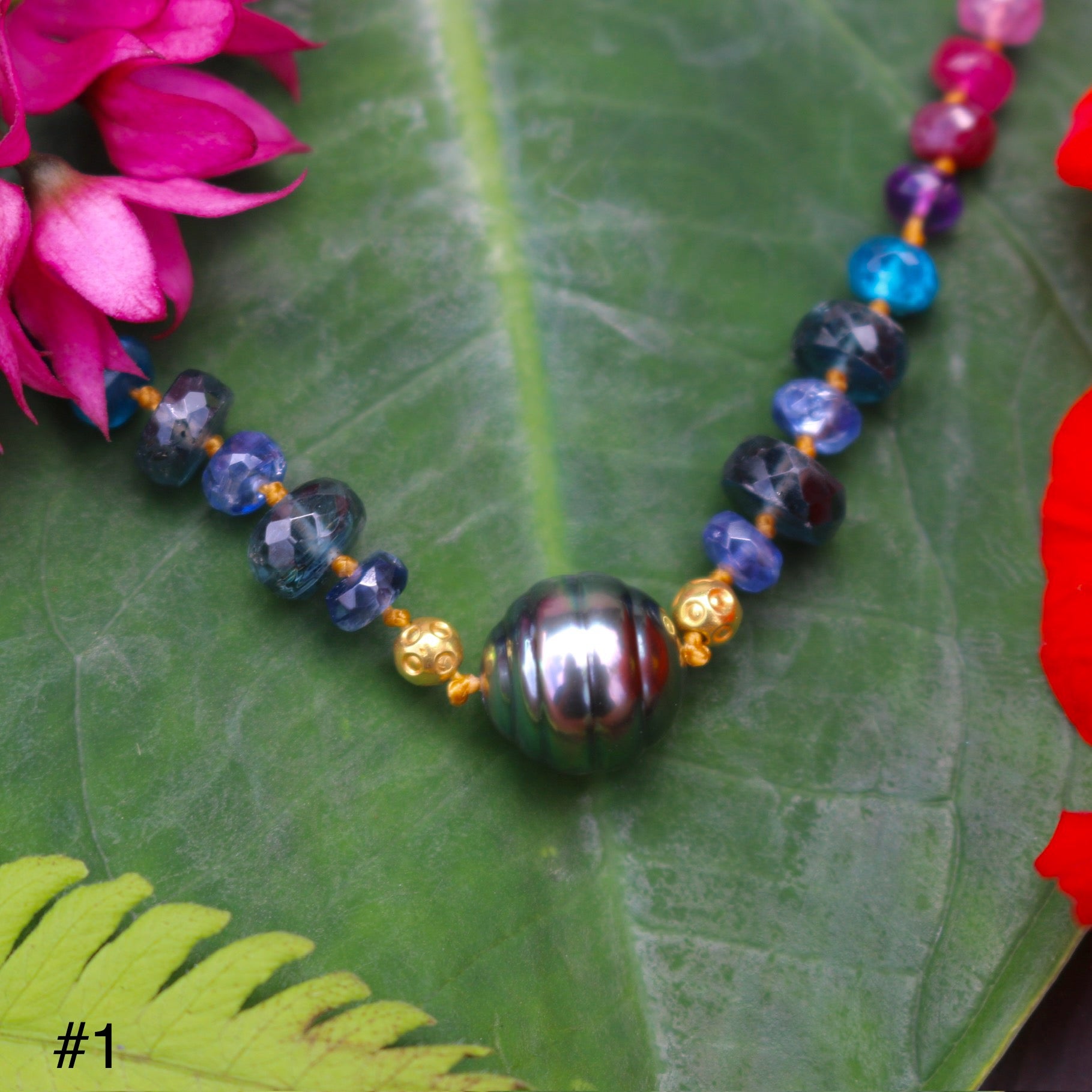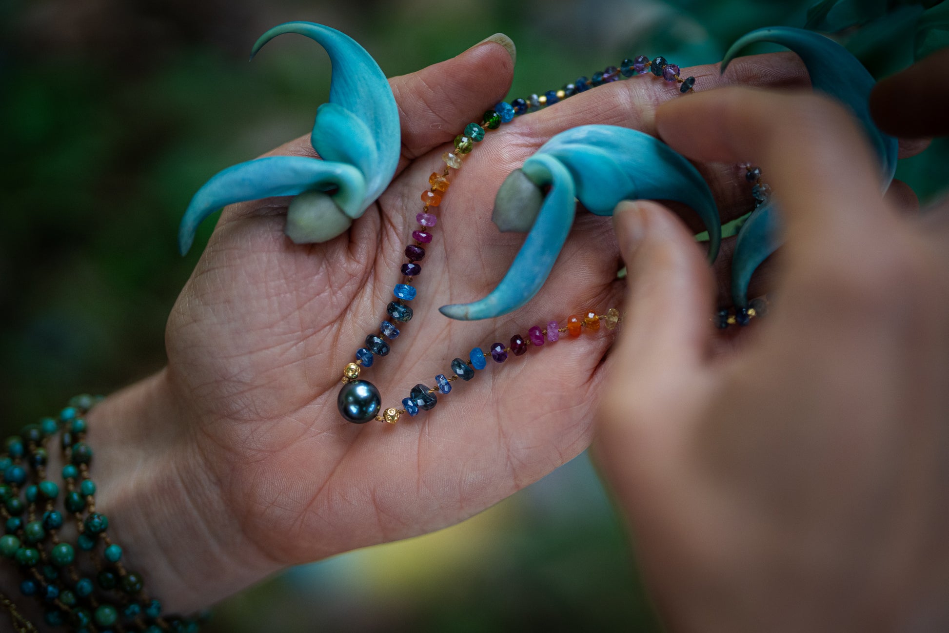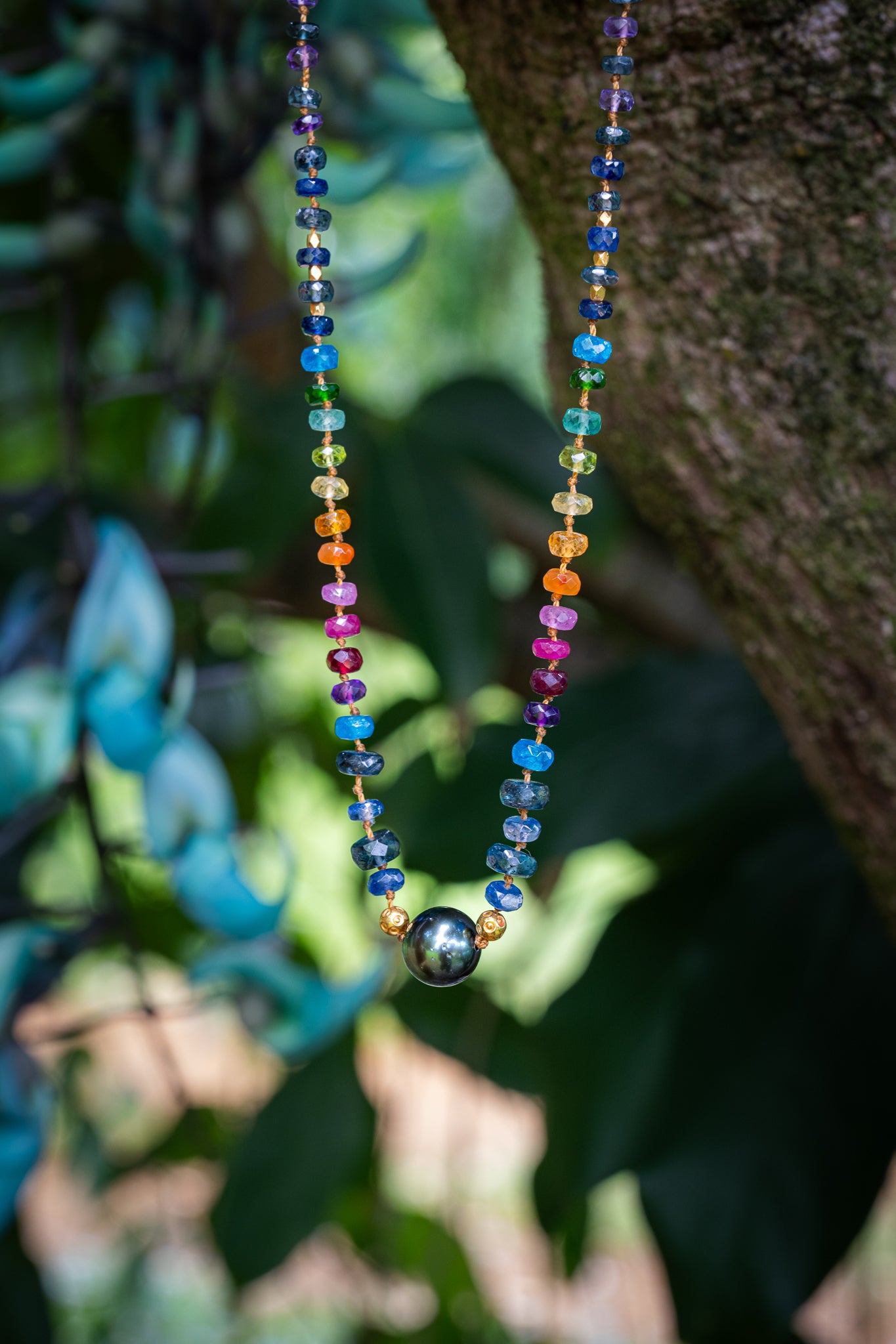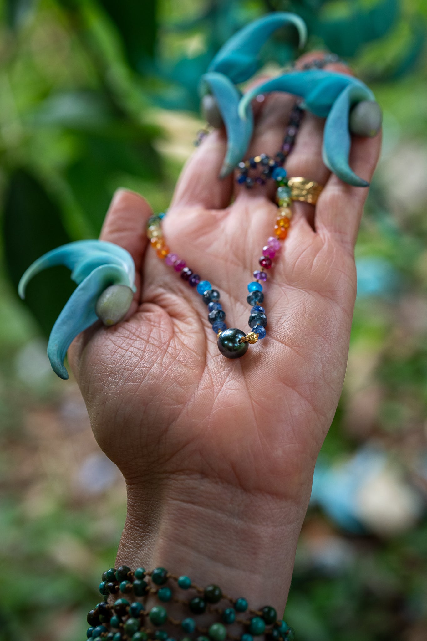 Saturated in the rainbow prism, this power piece features a regal Tahitian Pearl with handmade solid 18k gold beads, and an ocean inspired gemstone sequence with Kyanite to Emerald, enhancing depth of presence and mystical attunement.