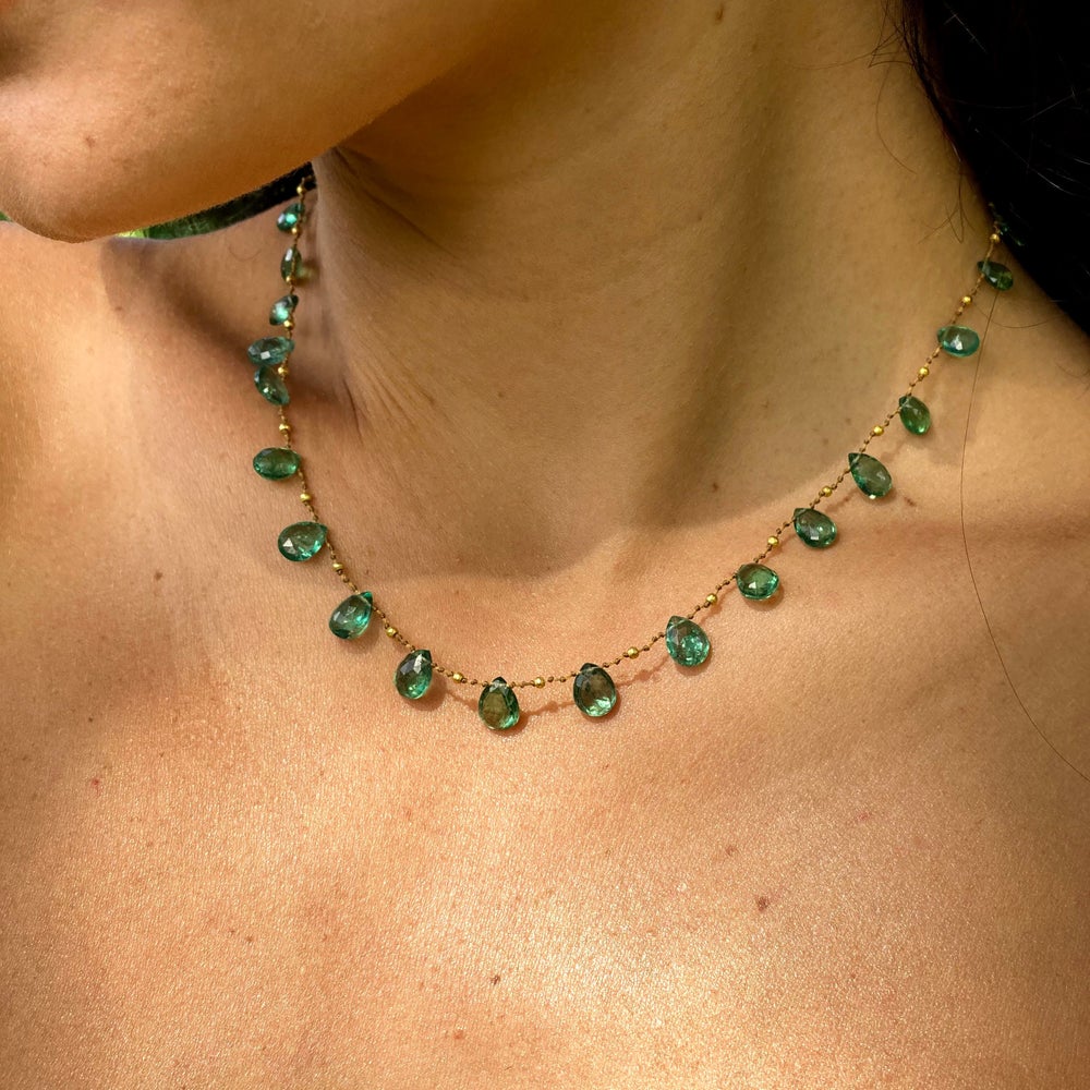 Bright, translucent, Sea Green Fluorite delicately spaced with handmade solid 18k gold beads