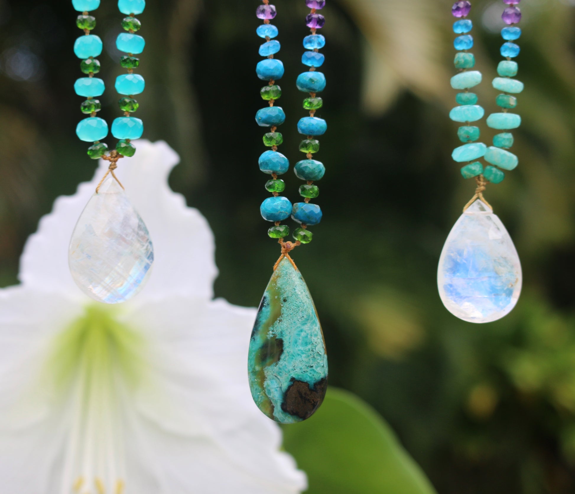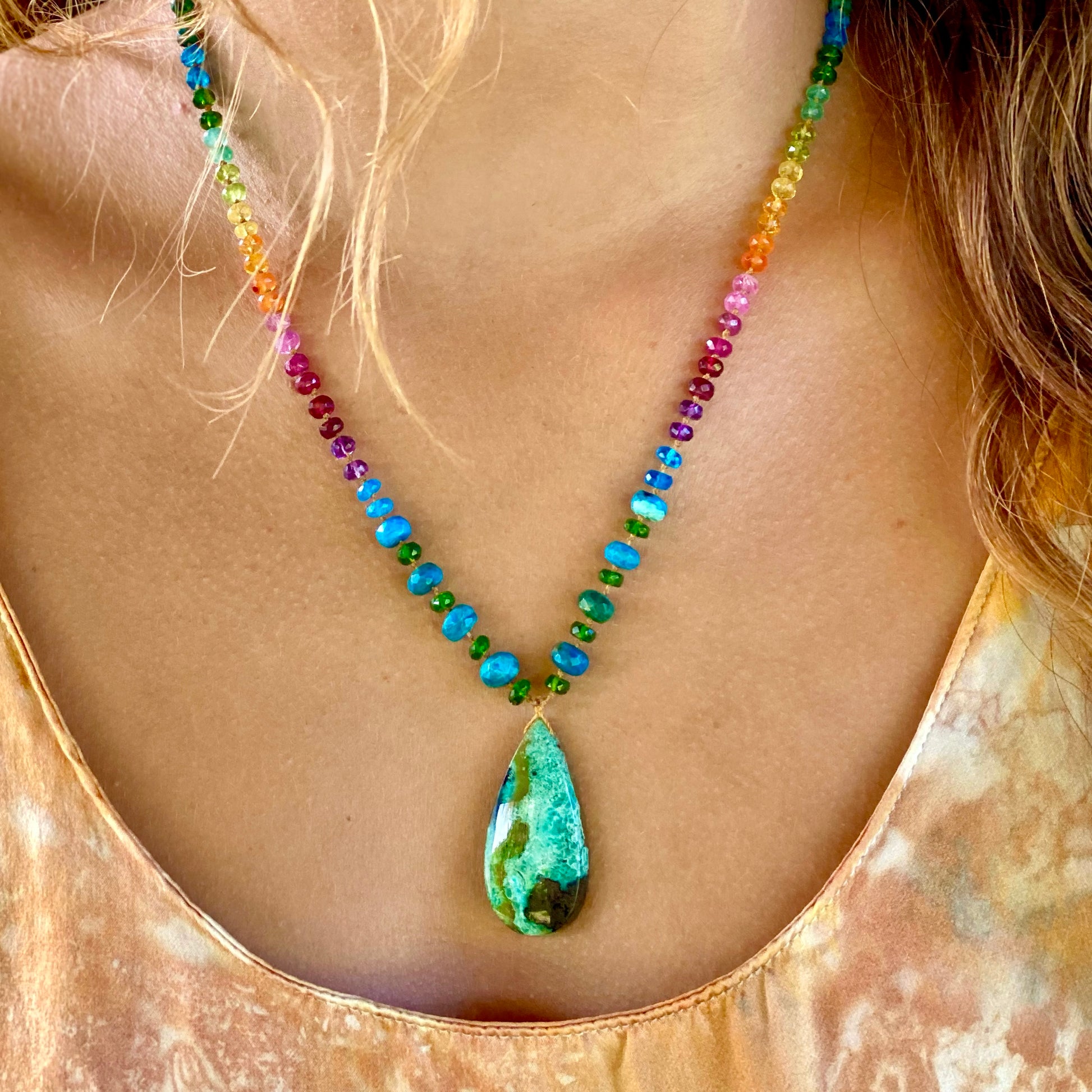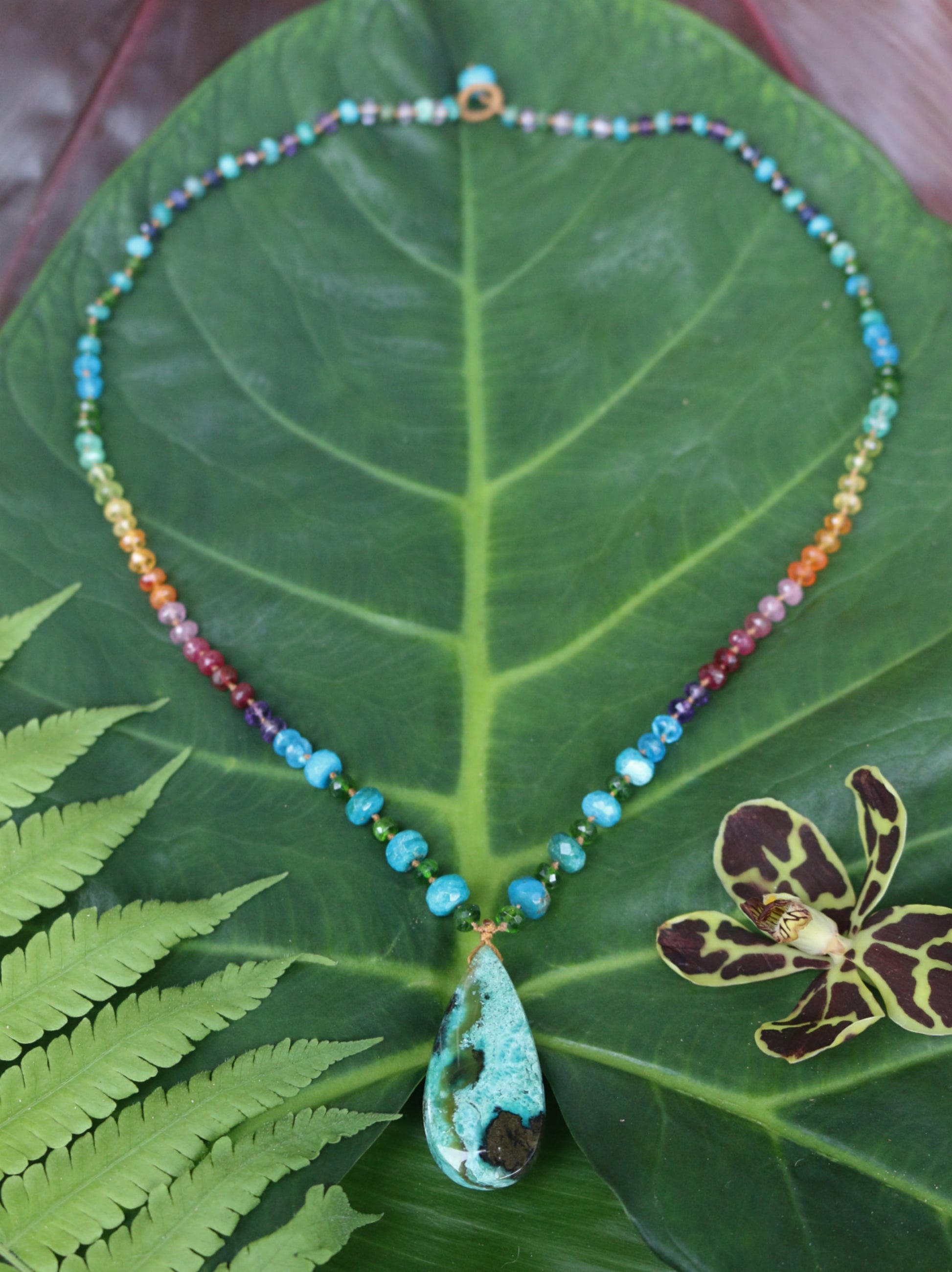 Inspired by the ethereal blessing of a rainbow as it breaks through the clouds in a show of light, the rainbow mana collection emanates an awe inspiring beauty that is food for the soul. Playing with the full light spectrum of color, these strands are saturated in rainbow hues featuring a substantial crystalline drop, making each a true power piece of resonant medicine. Like a deep base note, the rainbow mana collection brings depth, strengthening our inner vibration and heralding the abundance of our most radiant nature.