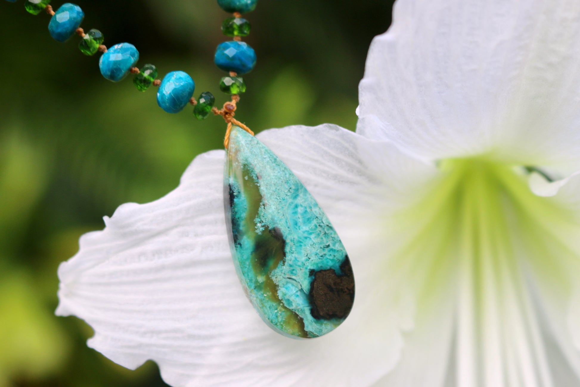 This green blue beauty is a form of chrysocolla naturally intwined with opal. Found in the Andes of Peru, the meandering ribbons of mineral deposits ensure that no two are alike. Its tranquil cleansing vibes help to keep the channel between heart and throat clear, support free-flowing ideas, reduce stress, and promote peaceful sleep.