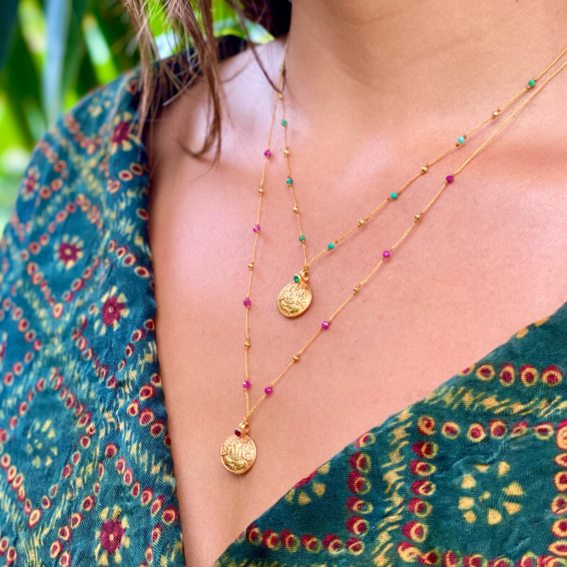 You can layer Alohi Drops with our Rainbow Leis, Malas or any of our other collections to highlight dynamic color contrast or chosen mineral emphasis. They are also lovely paired with our gold earring collection.