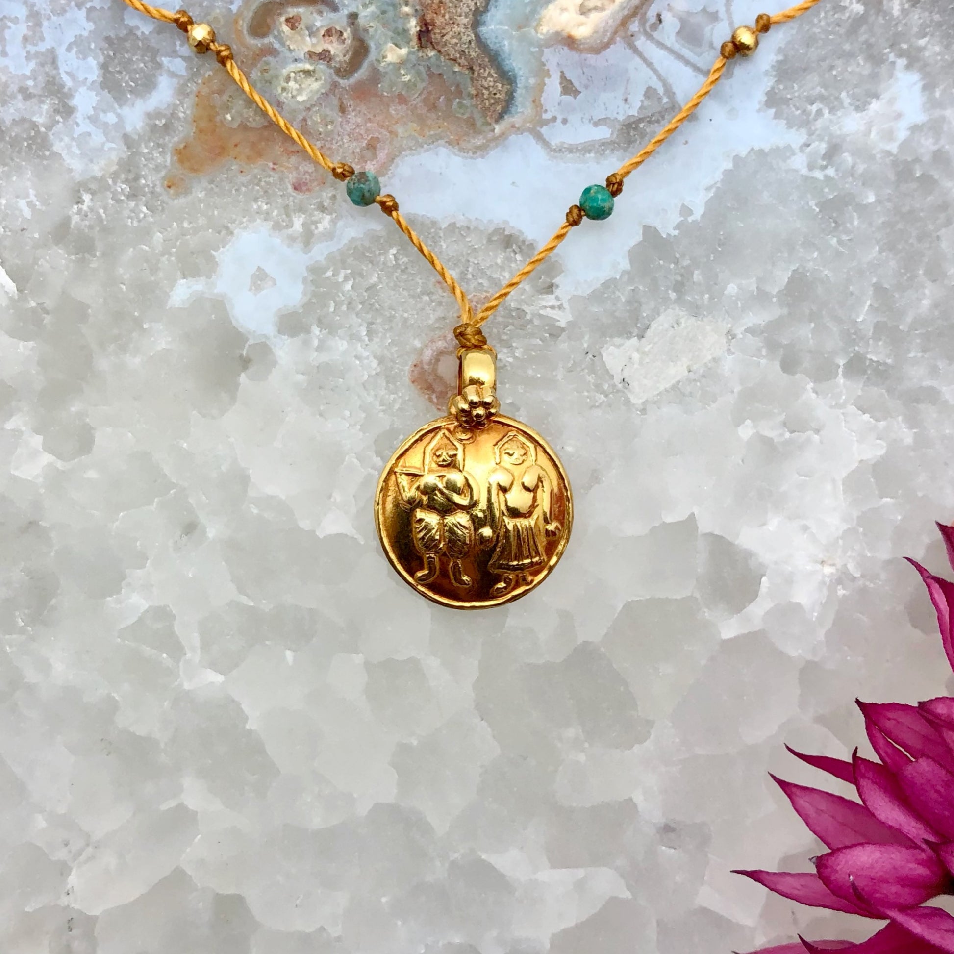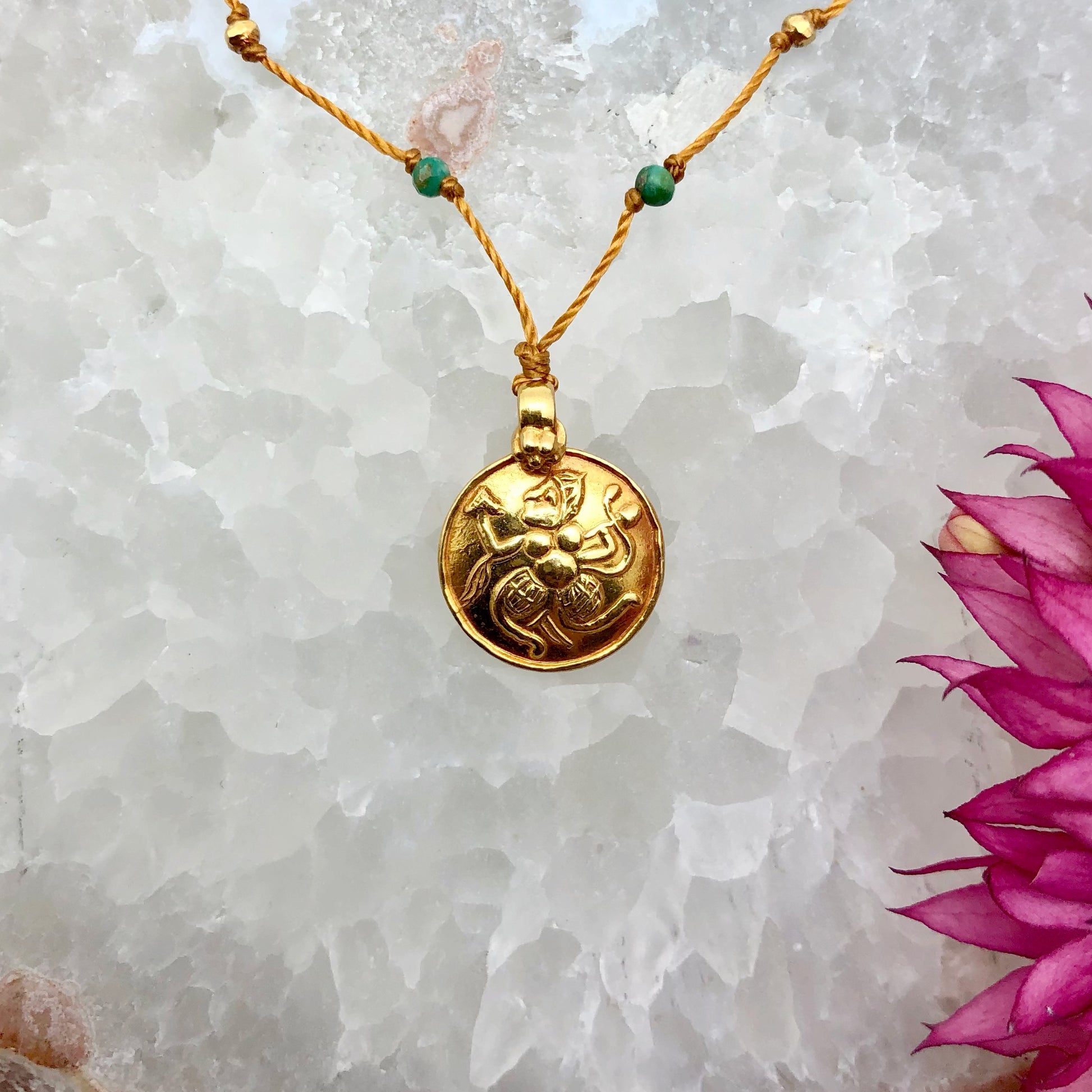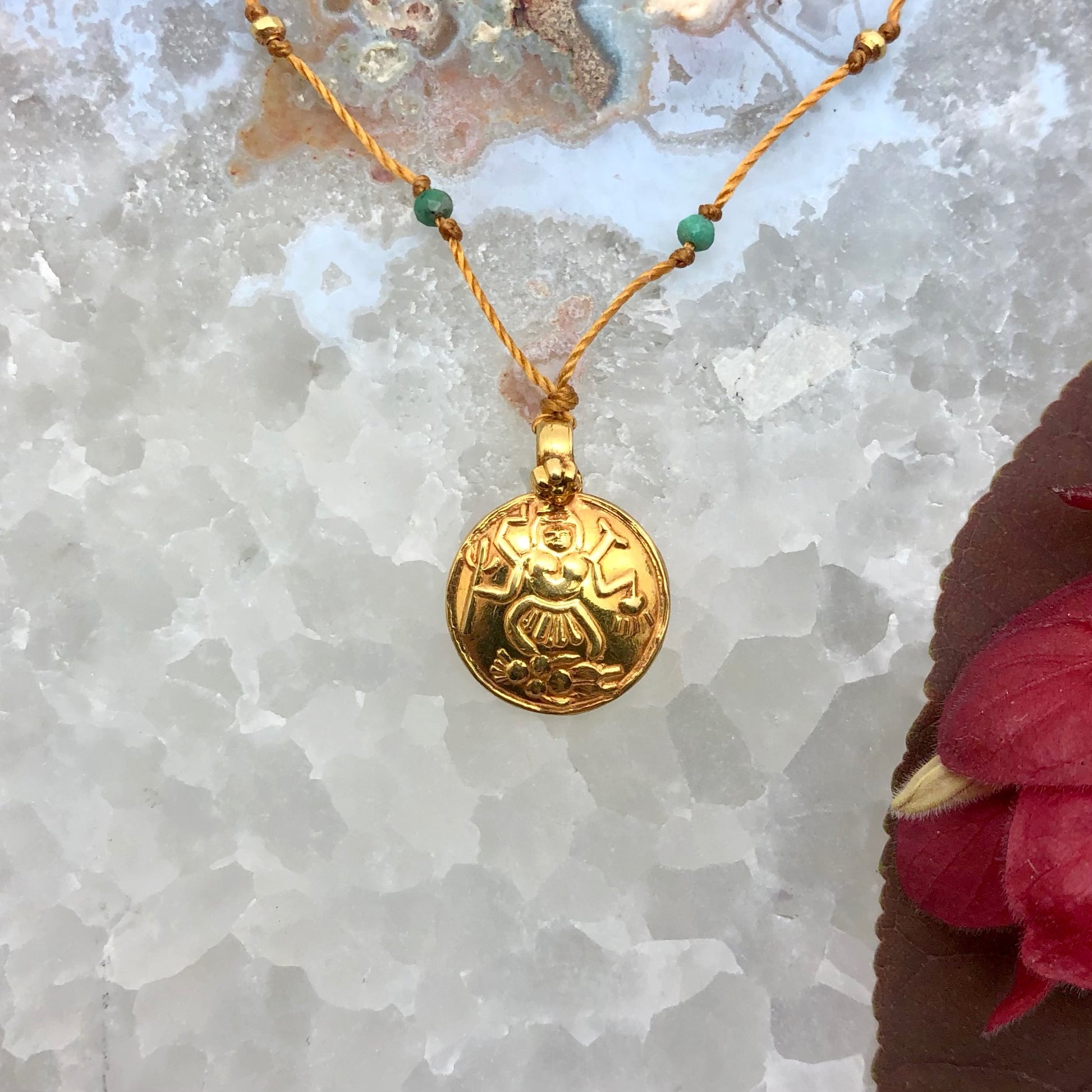 Paired with Emerald, this Ganesha charm may assist in renewal, growth, and peace-keeping. Ruled by the plant mercury, Emerald supports fruitful communication and mindfulness, especially in arenas of commitment, honor, and true love. Turquoise adds nuances of wisdom, protection, and healing.
