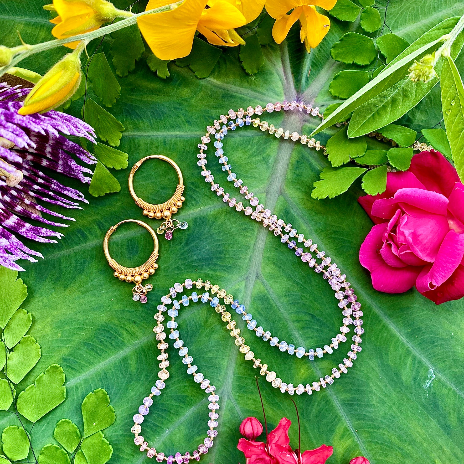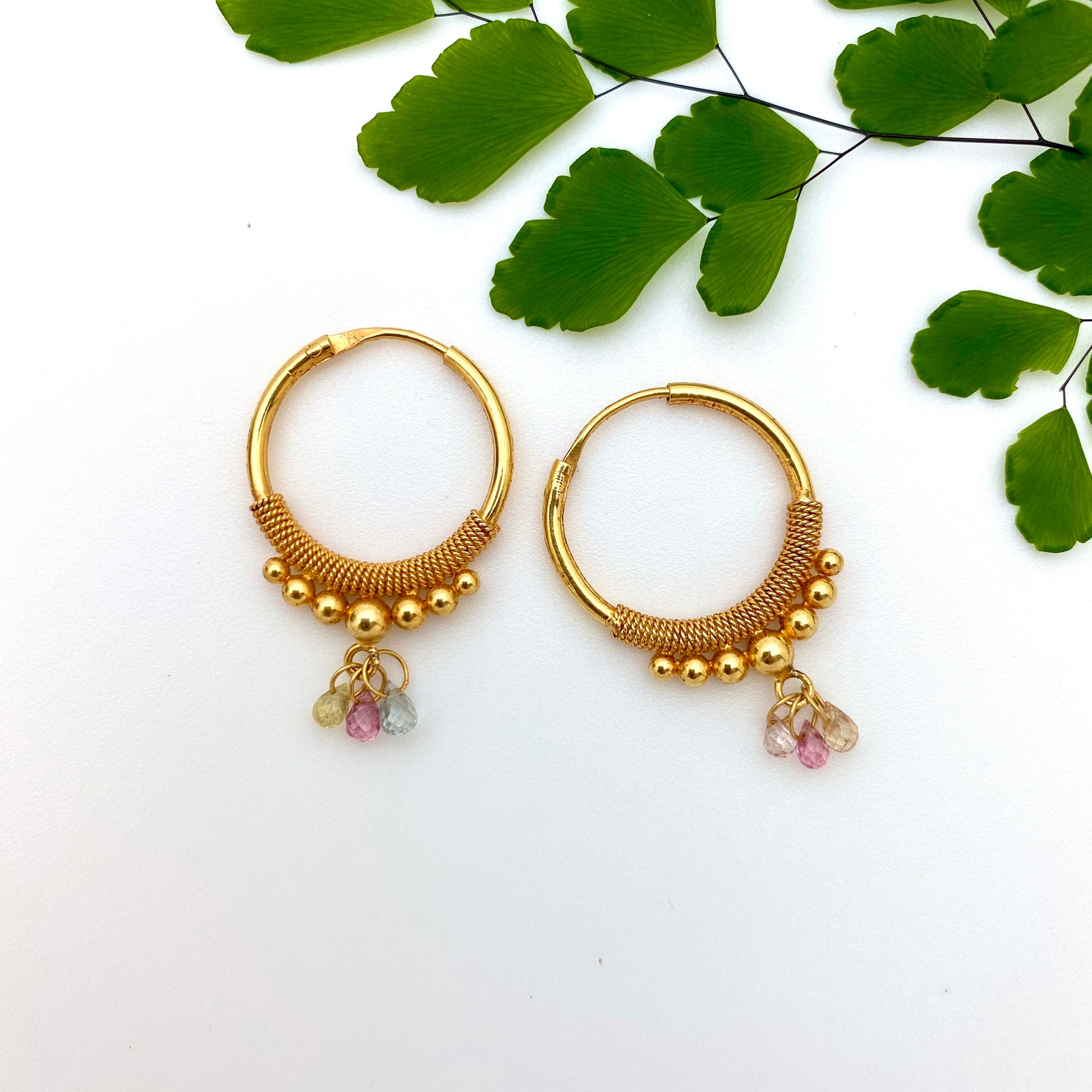 Golden Droplet Hoops with Pastel Sapphires, Medium (21MM)