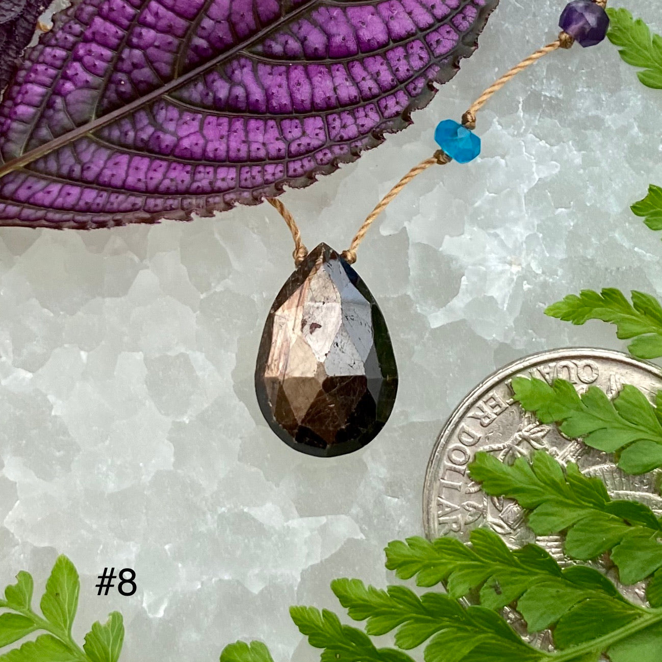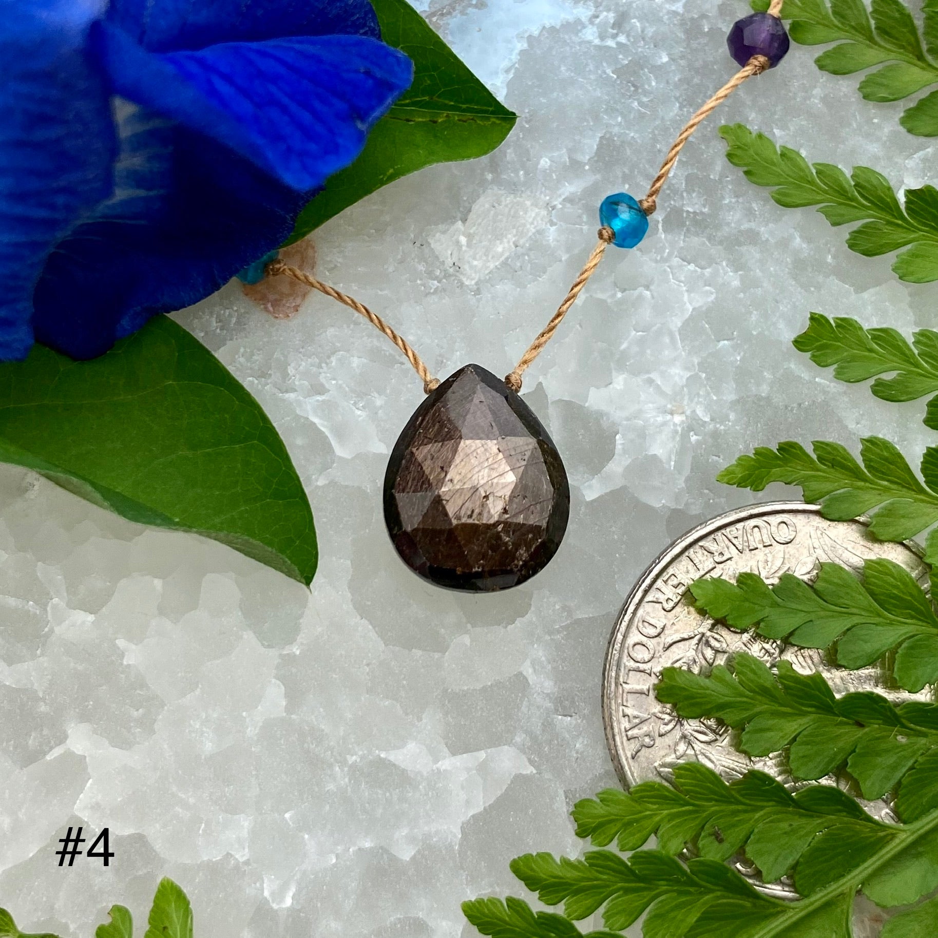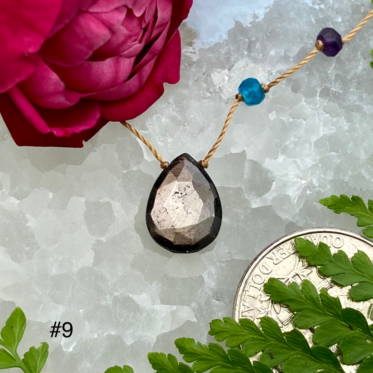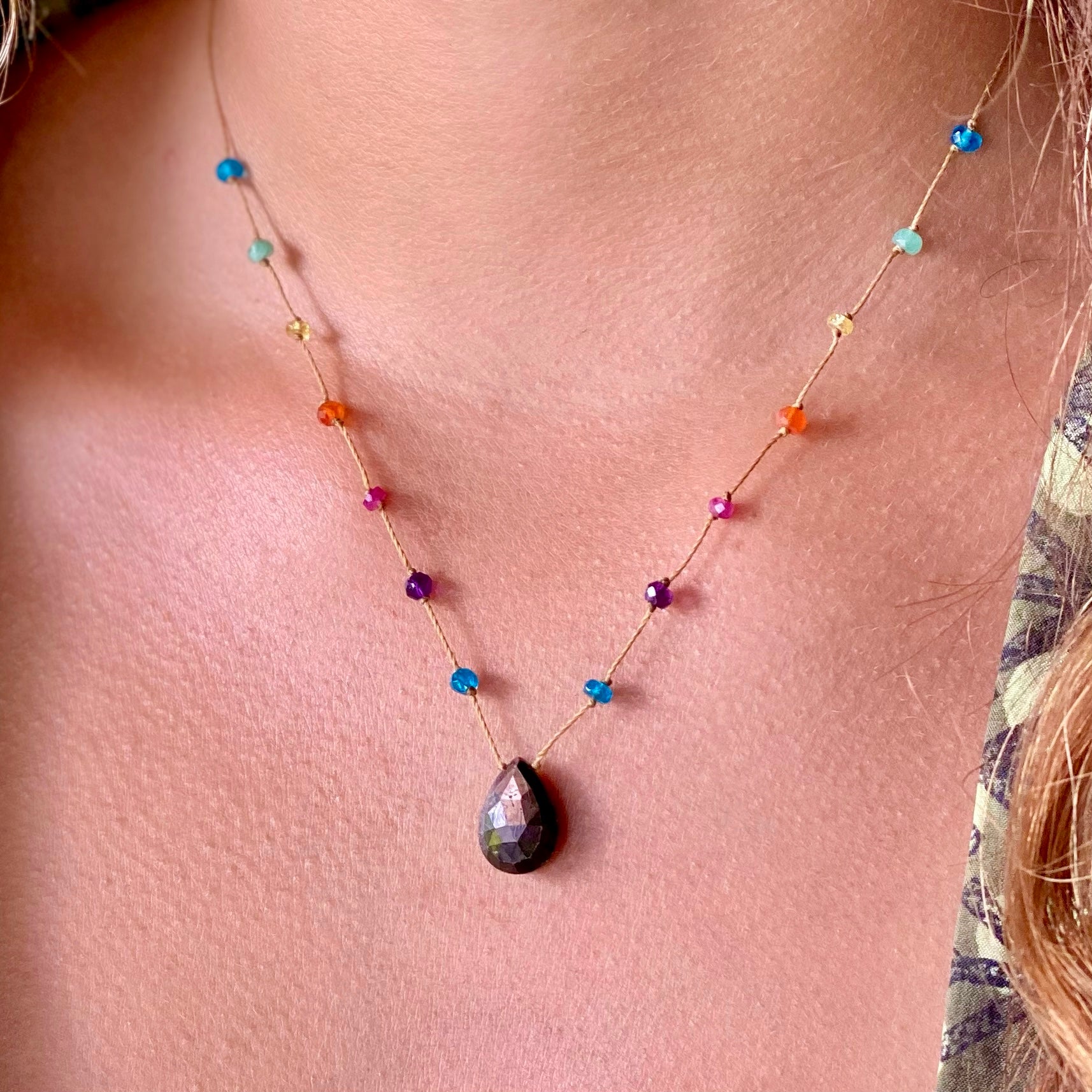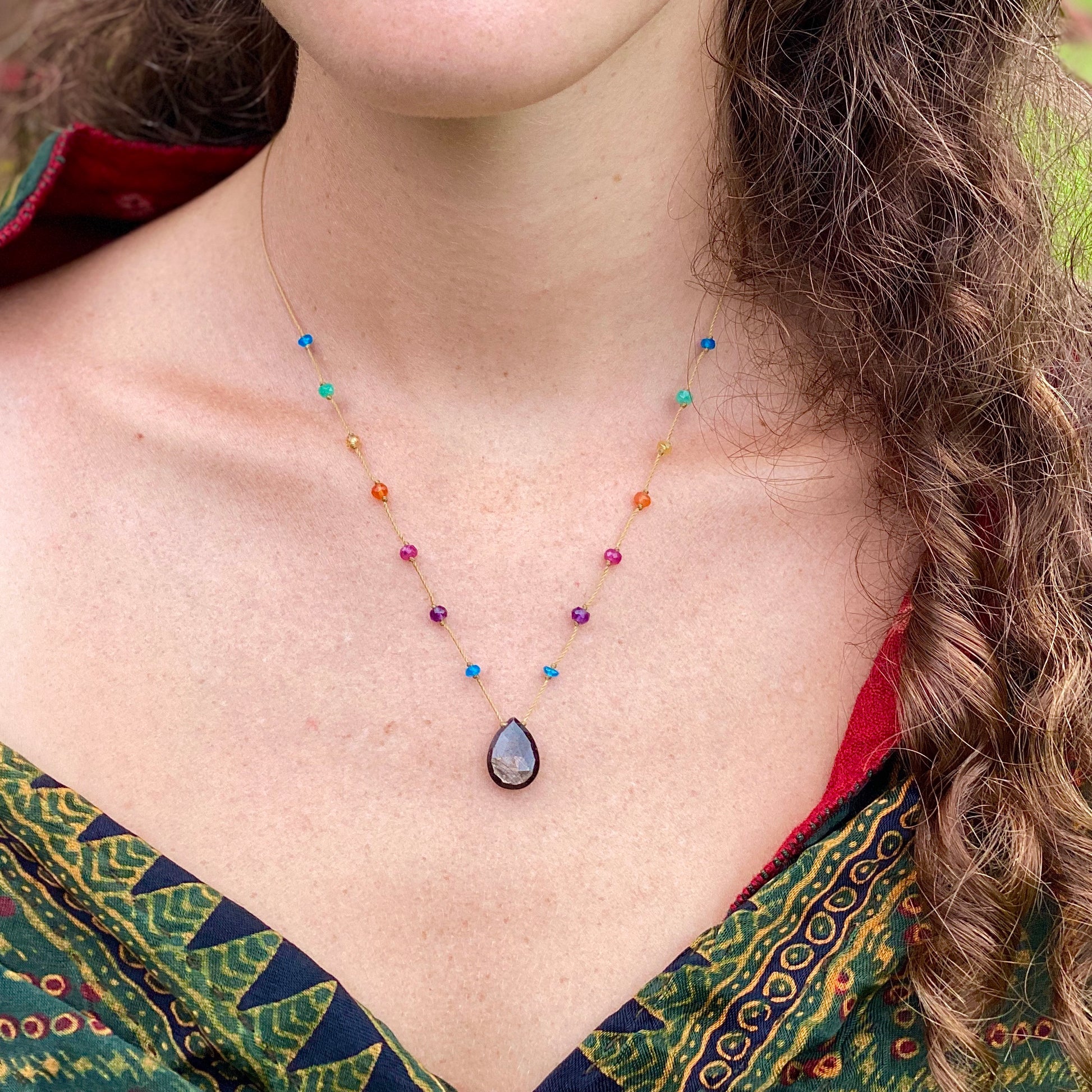 Perhaps the quintessential beginning of Rainbow Gems Kauai, our rainbow drops have been adorning people for over a decade. These delicate rainbow drops showcase the full light spectrum with carefully spaced individual gemstones, culminating in a featured crystalline drop. Just as rainbows herald new beginnings and luck these exquisite strands are the perfect place to begin your love affair with Amalia’s artwork. Many find that once they put on their rainbow drop they never take it off again, such is the nature of love. These strands are perfect for the minimalist at heart and make a striking impression stacked in a series with our other collections.
