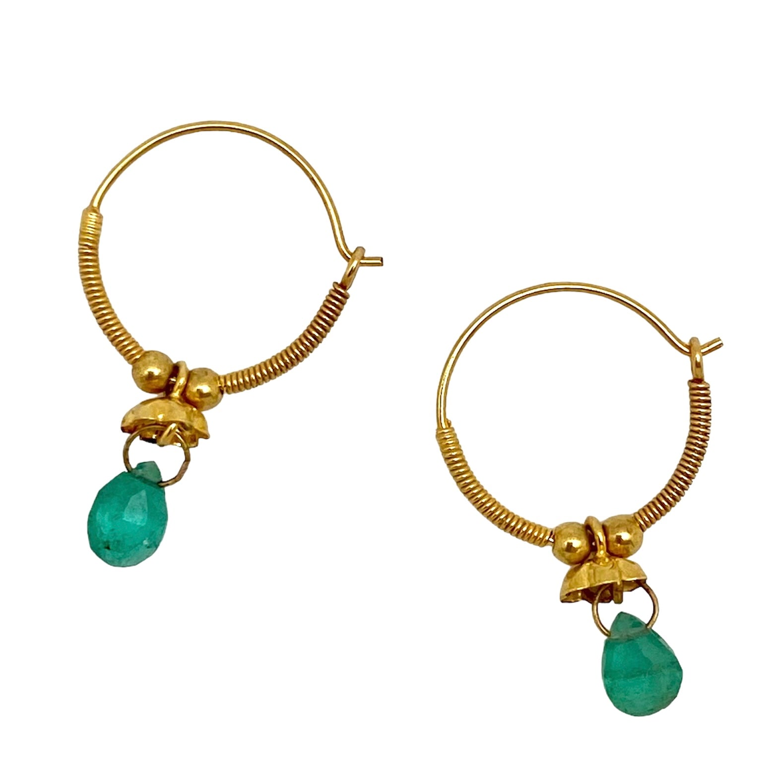 Traditionally handmade solid 18k yellow gold earrings with a stunning Emerald droplet.