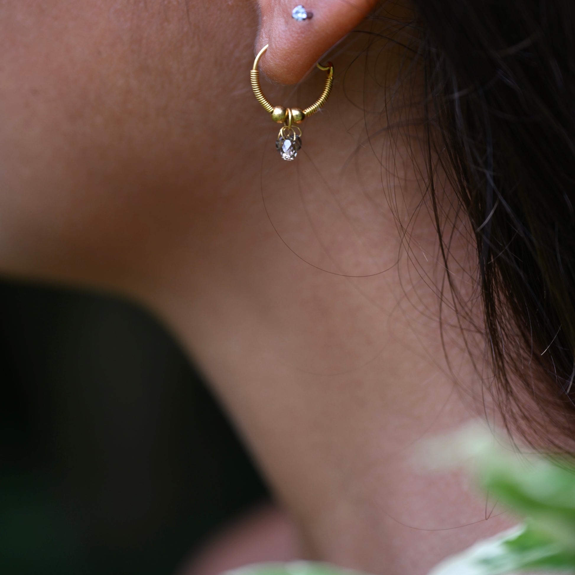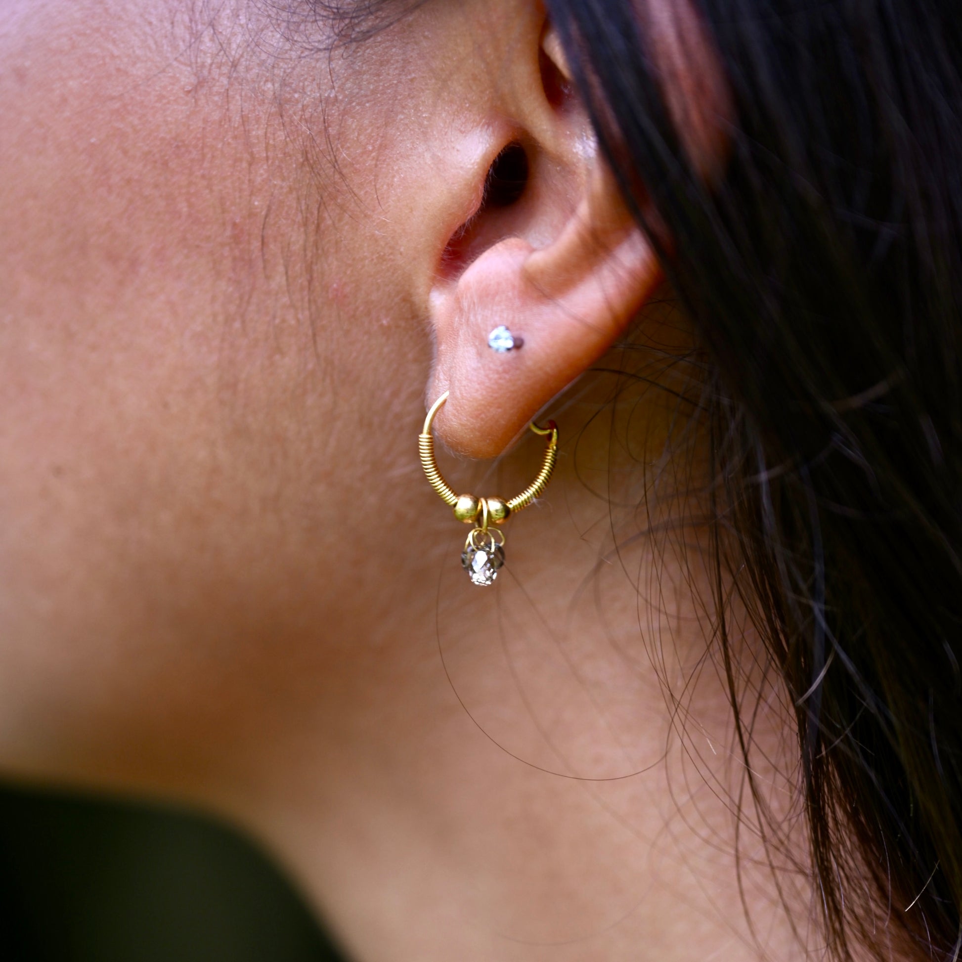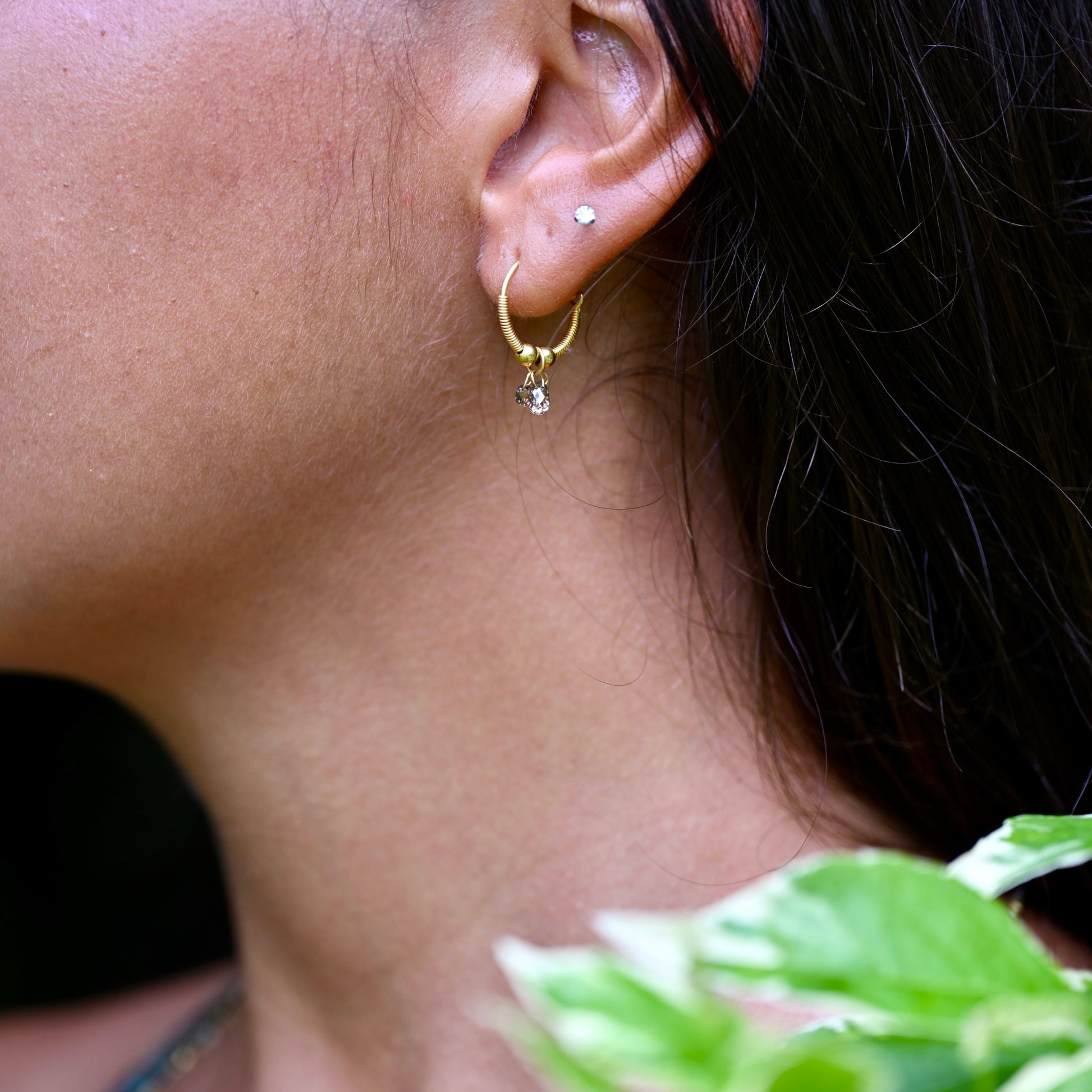 Traditionally handmade solid 18k yellow gold earrings with three natural Diamonds. Effortless earrings to add the perfect amount of twinkle, lending a bit of magic to any occasion.