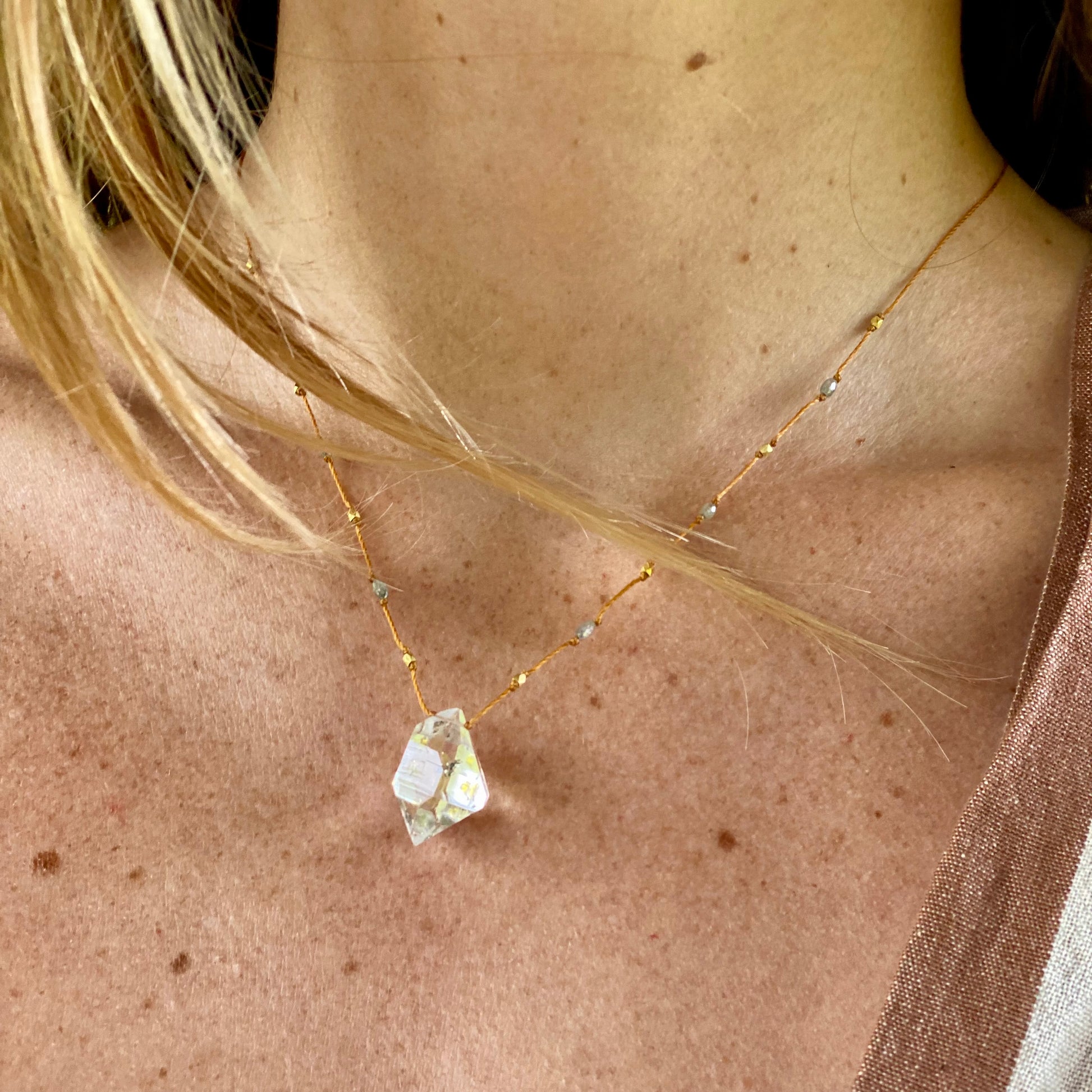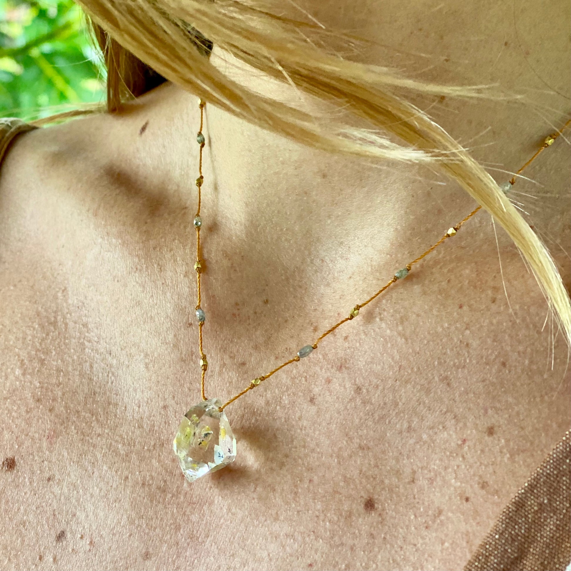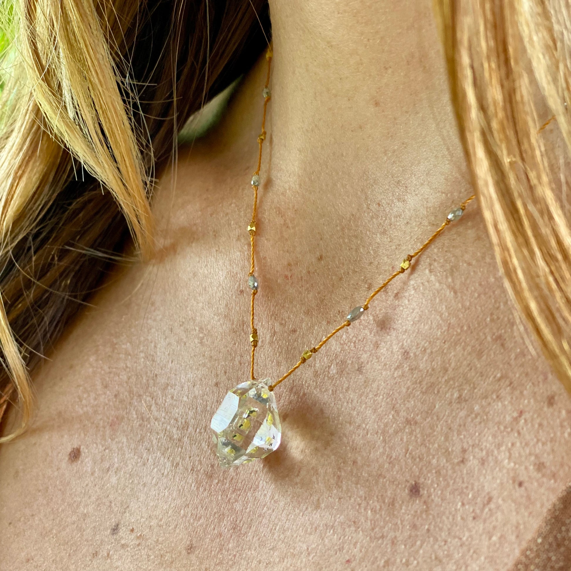 Rare, high energy Quartz with fluorescent golden oil trapped inside, highlighted with handmade solid 18k gold beads and natural Diamonds.