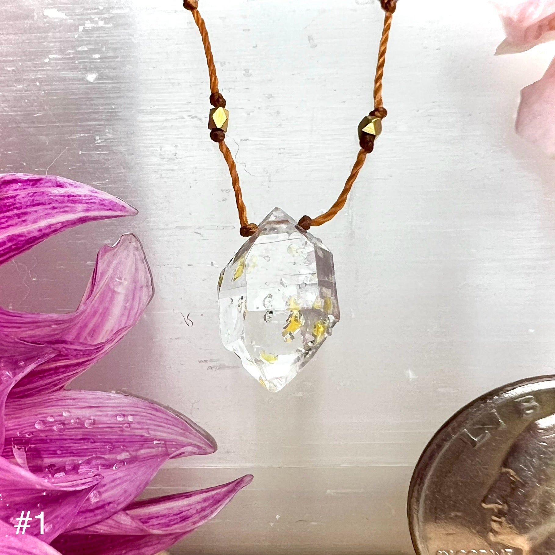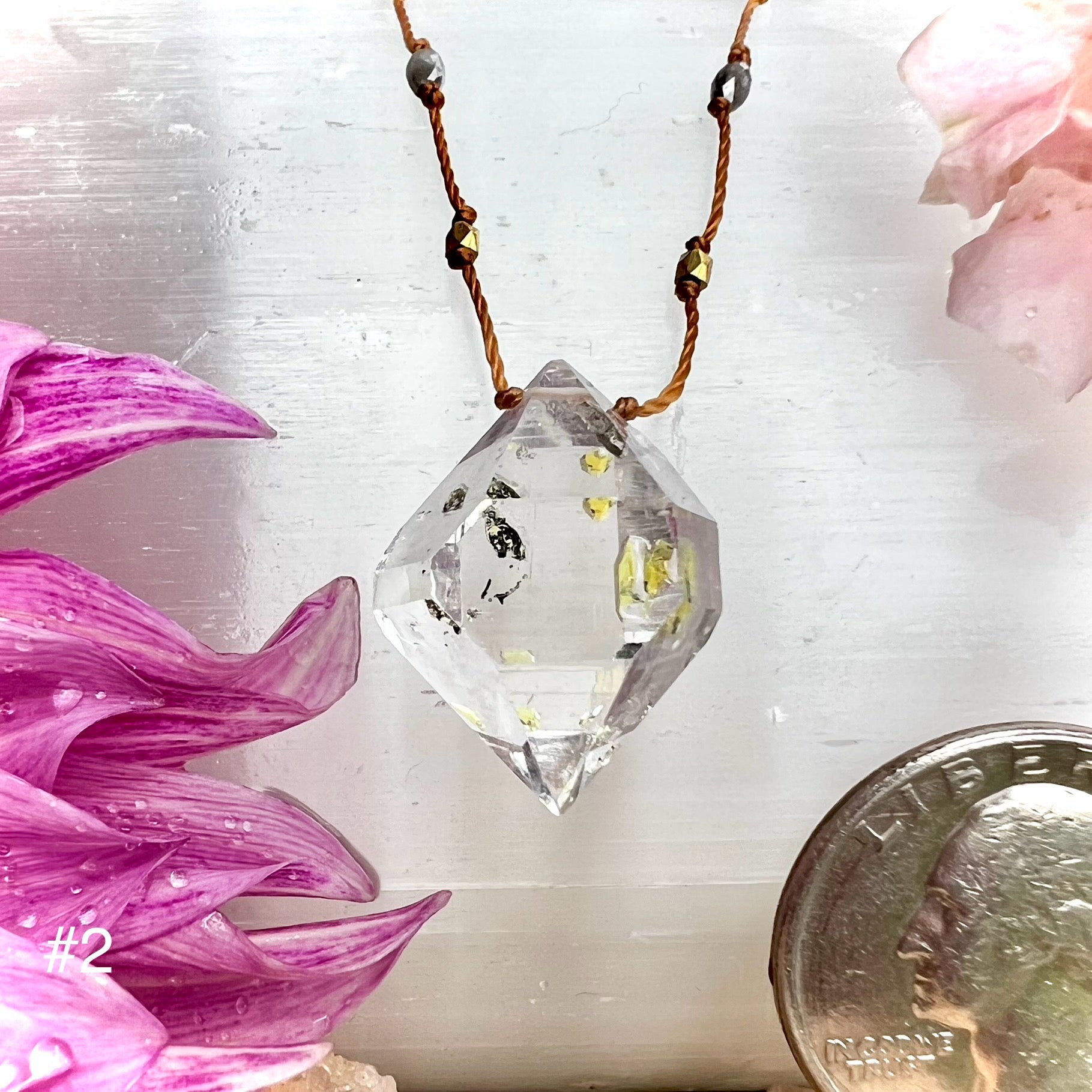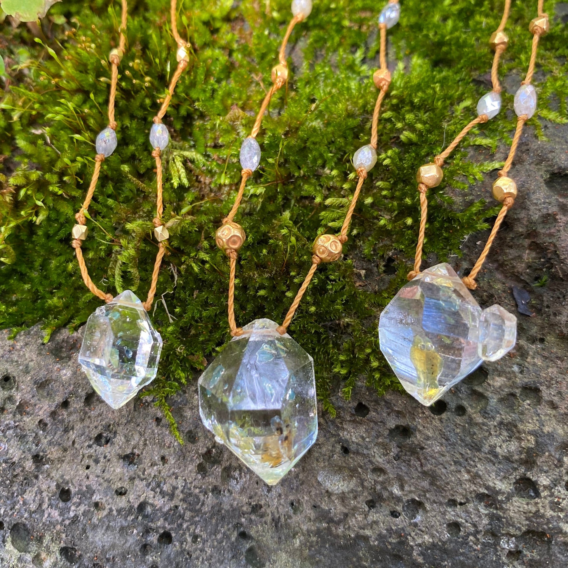 Rare, high energy Quartz with fluorescent golden oil trapped inside, highlighted with handmade solid 18k gold beads and natural Diamonds.