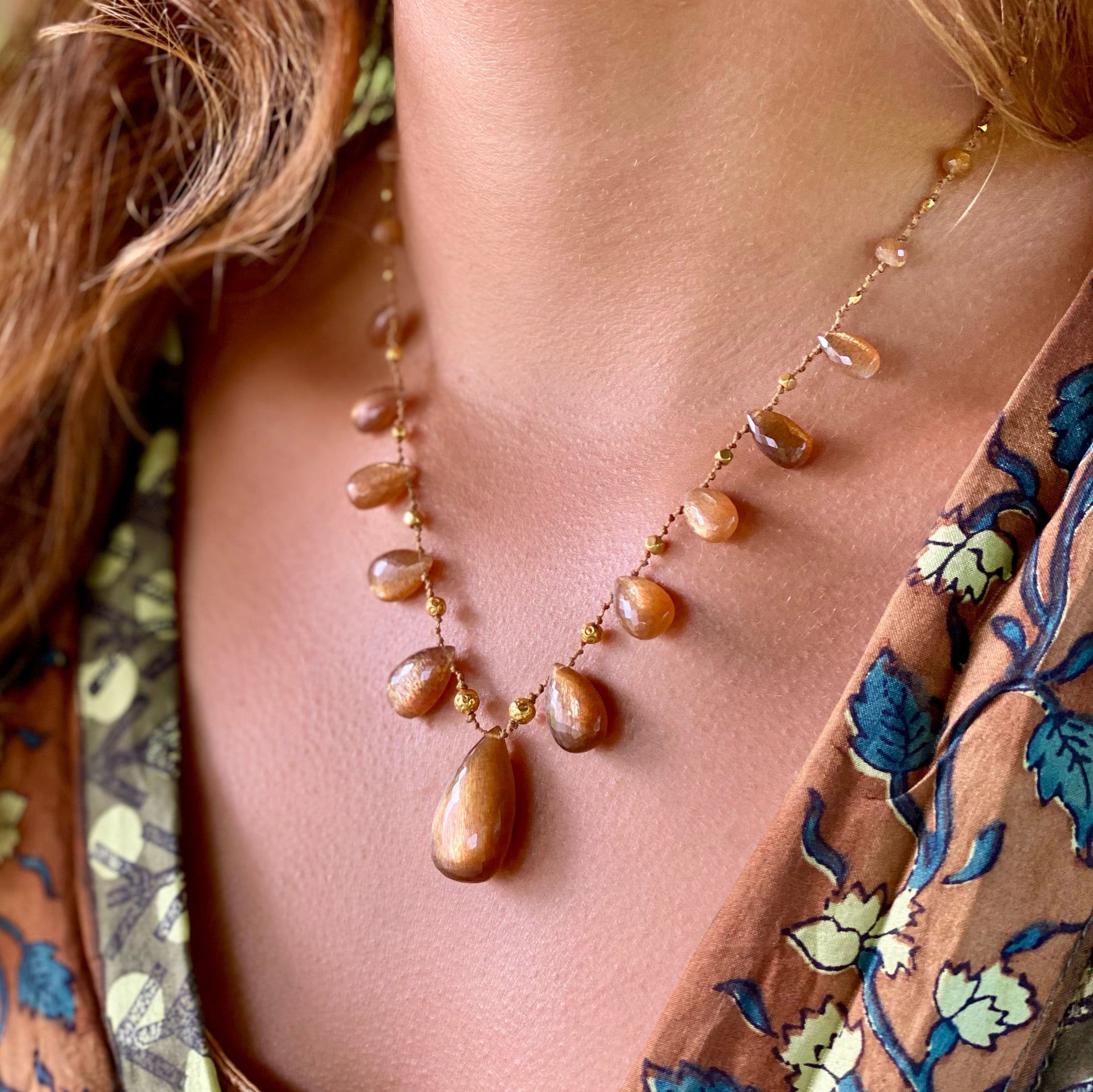 As if she swallowed the moon and set to living, these gorgeous Golden Moonstone drops carry the calm joy of assimilated wisdom and feminine embodiment. A stone of beginning anew, spiritual development, and nutritive introspection. Graduated gems are set between handmade solid 18k gold beads.