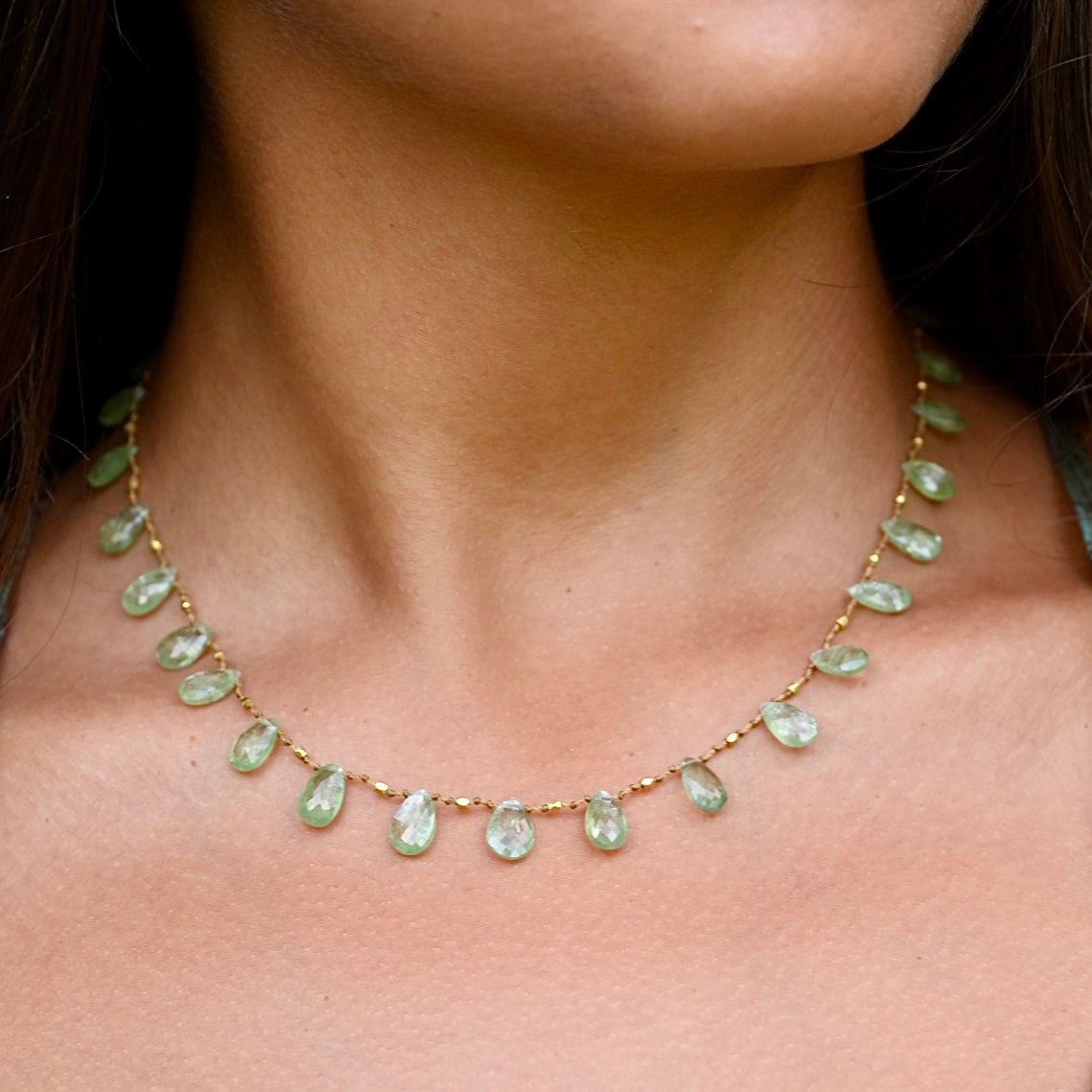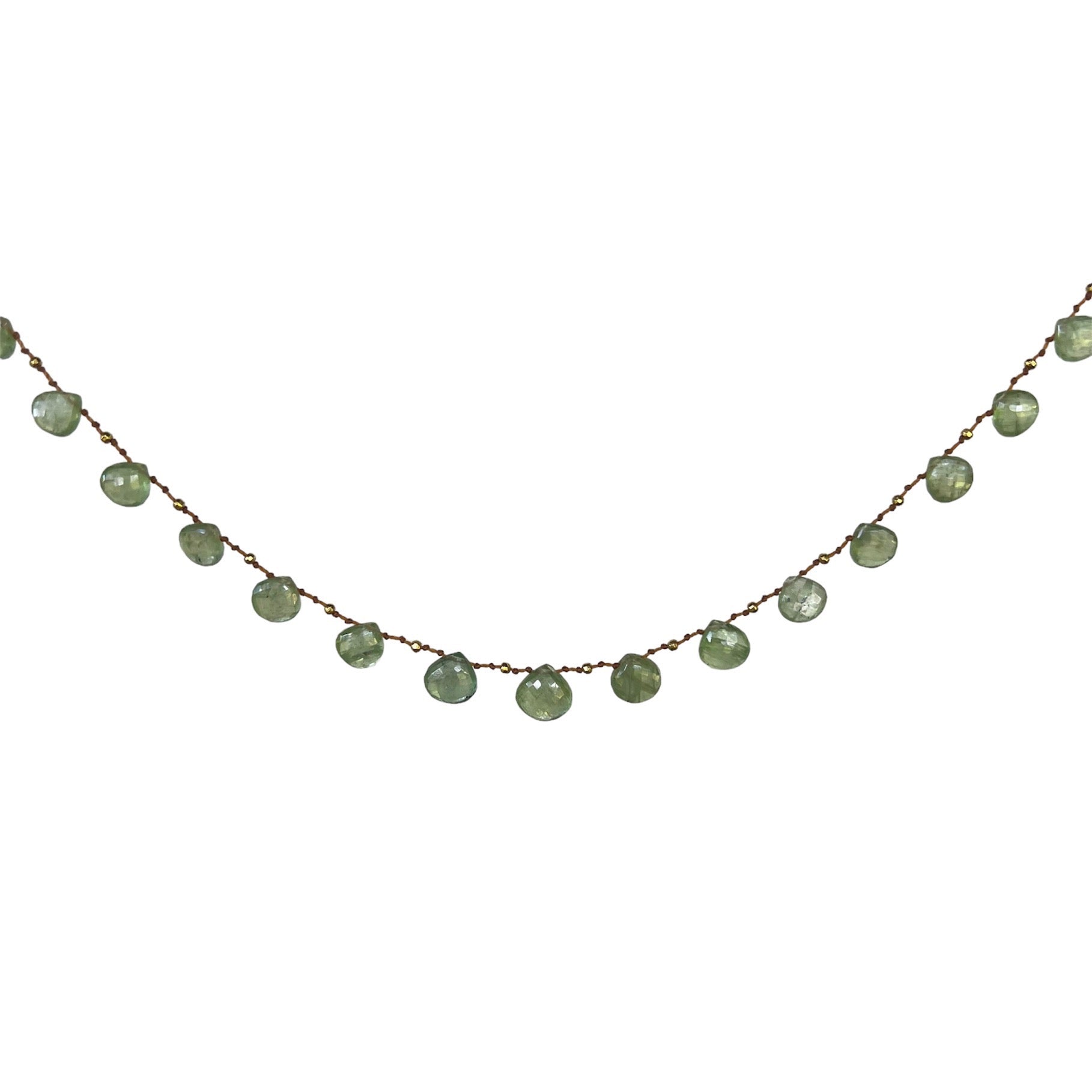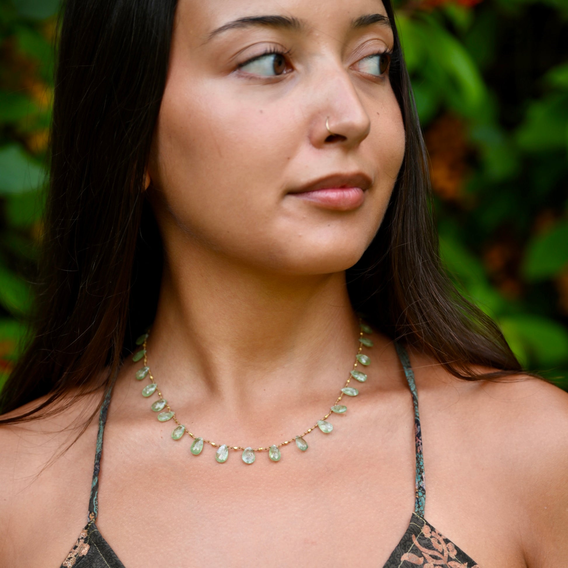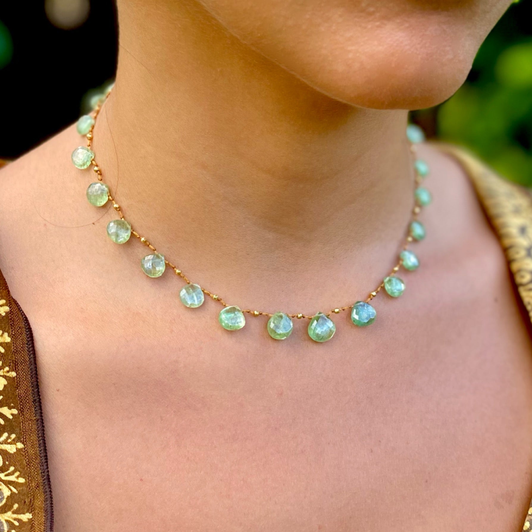 Gorgeous translucent Green Kyanites delicately spaced with handmade solid 18k gold beads