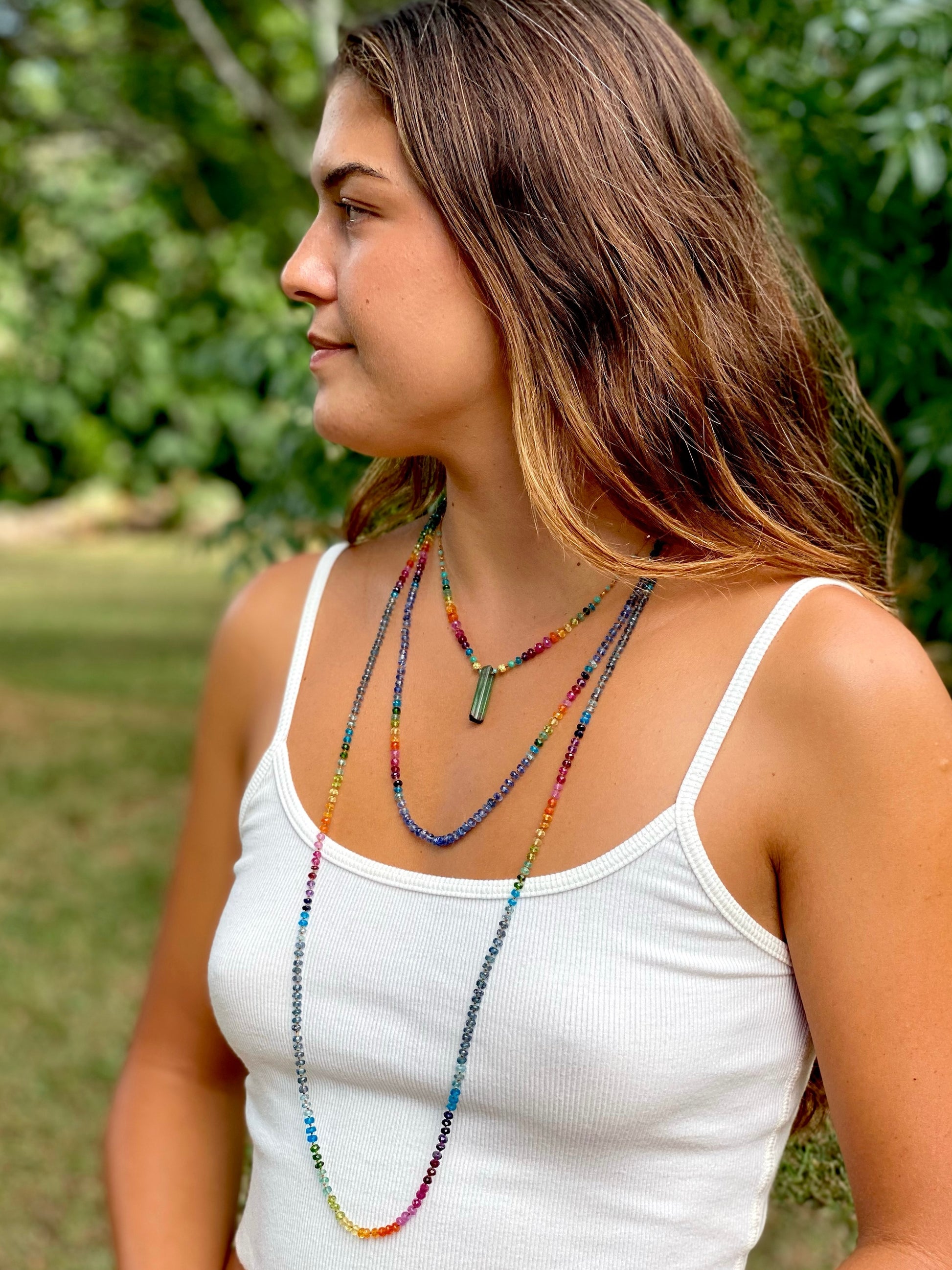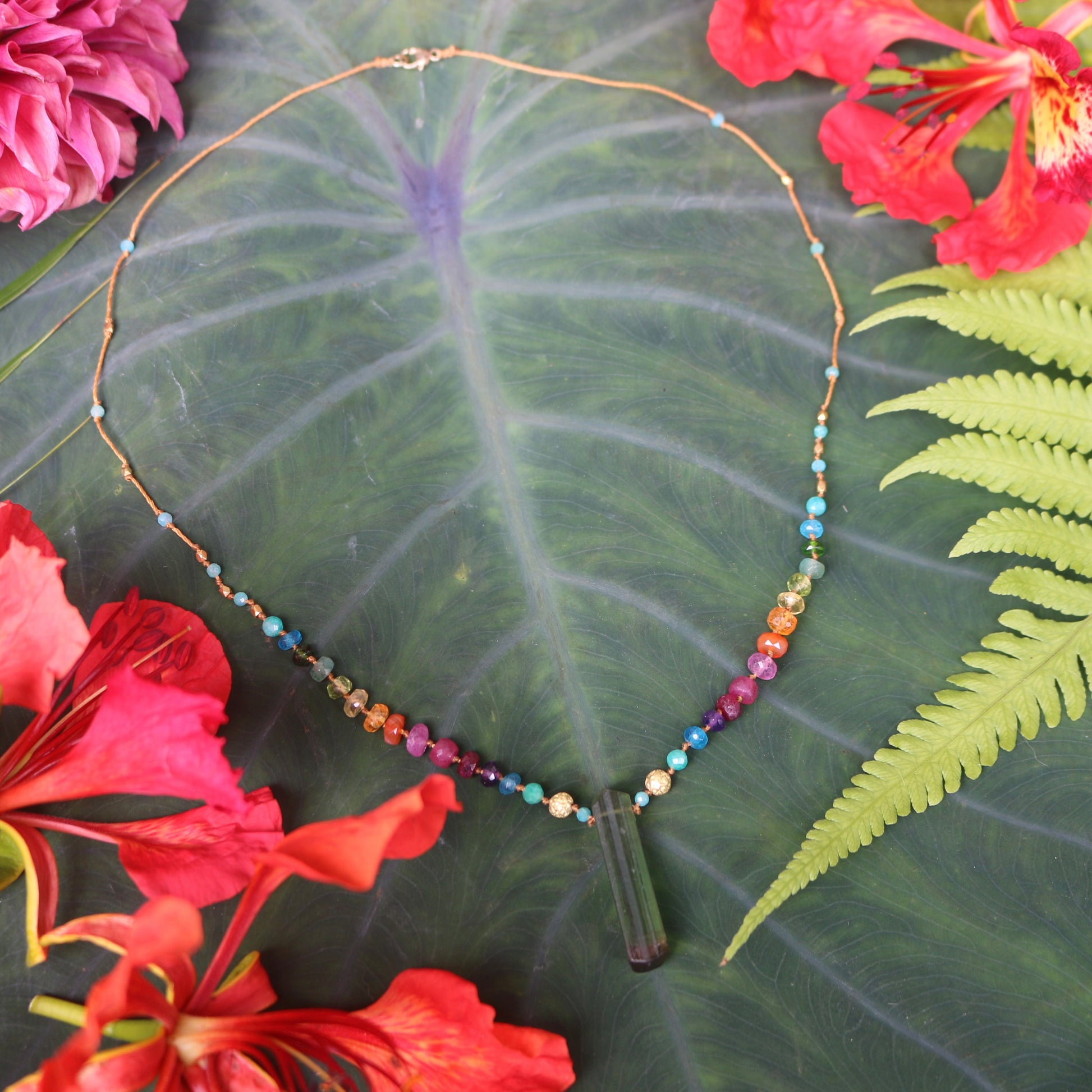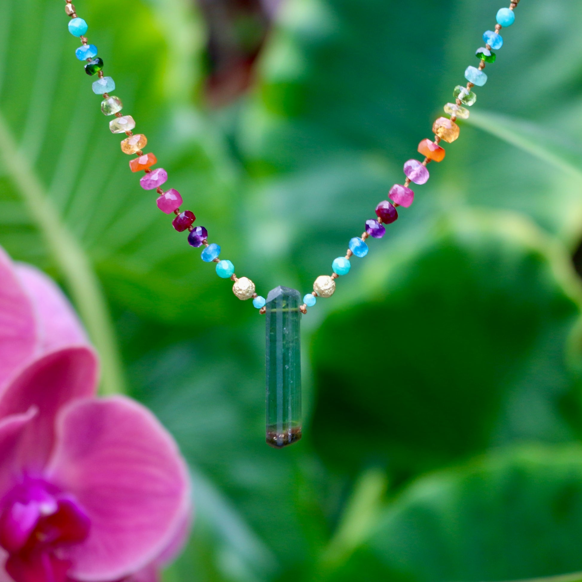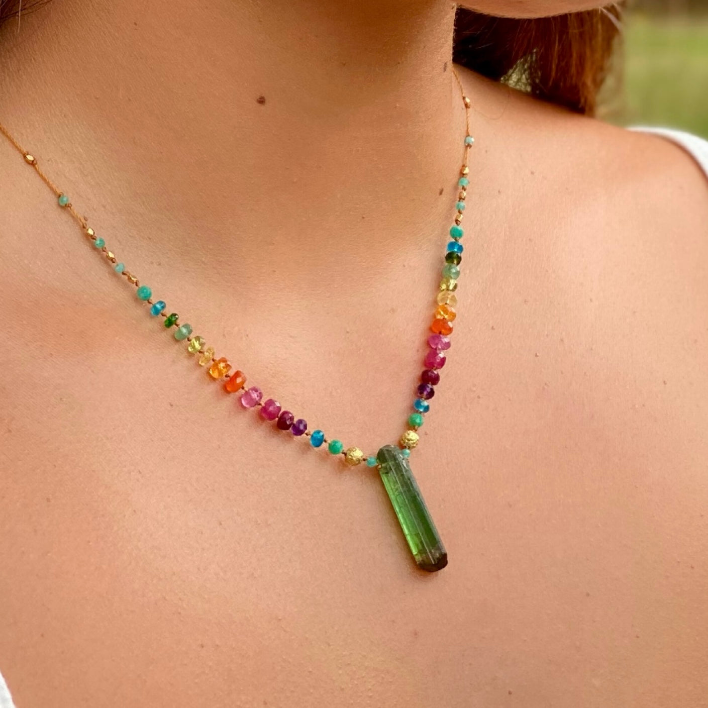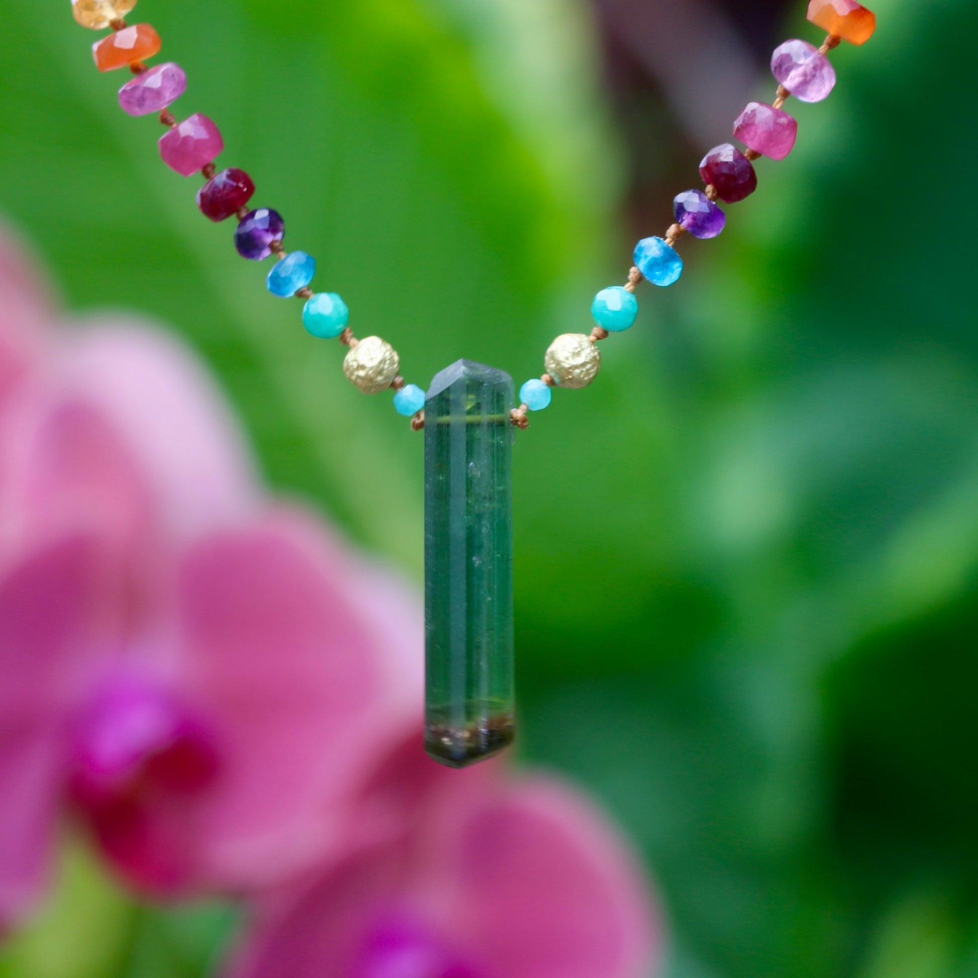 Saturated in the rainbow prism, this power piece features a captivating Green Tourmaline adorned with handmade solid 18k gold beads and an Amazonite transition, inspiring compassion, love, regeneration, and balance.