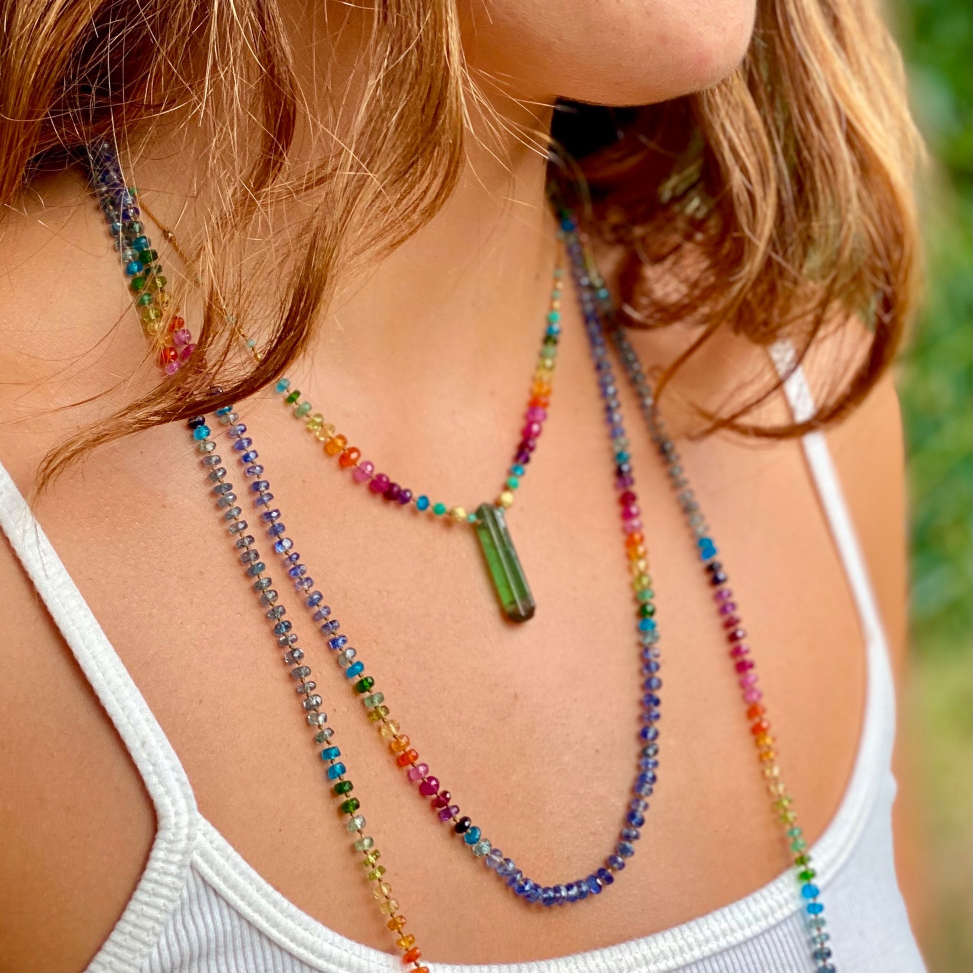 Inspired by the ethereal blessing of a rainbow as it breaks through the clouds in a show of light, the rainbow mana collection emanates an awe inspiring beauty that is food for the soul. Playing with the full light spectrum of color, these strands are saturated in rainbow hues featuring a substantial crystalline drop, making each a true power piece of resonant medicine. Like a deep base note, the rainbow mana collection brings depth, strengthening our inner vibration and heralding the abundance of our most radiant nature.