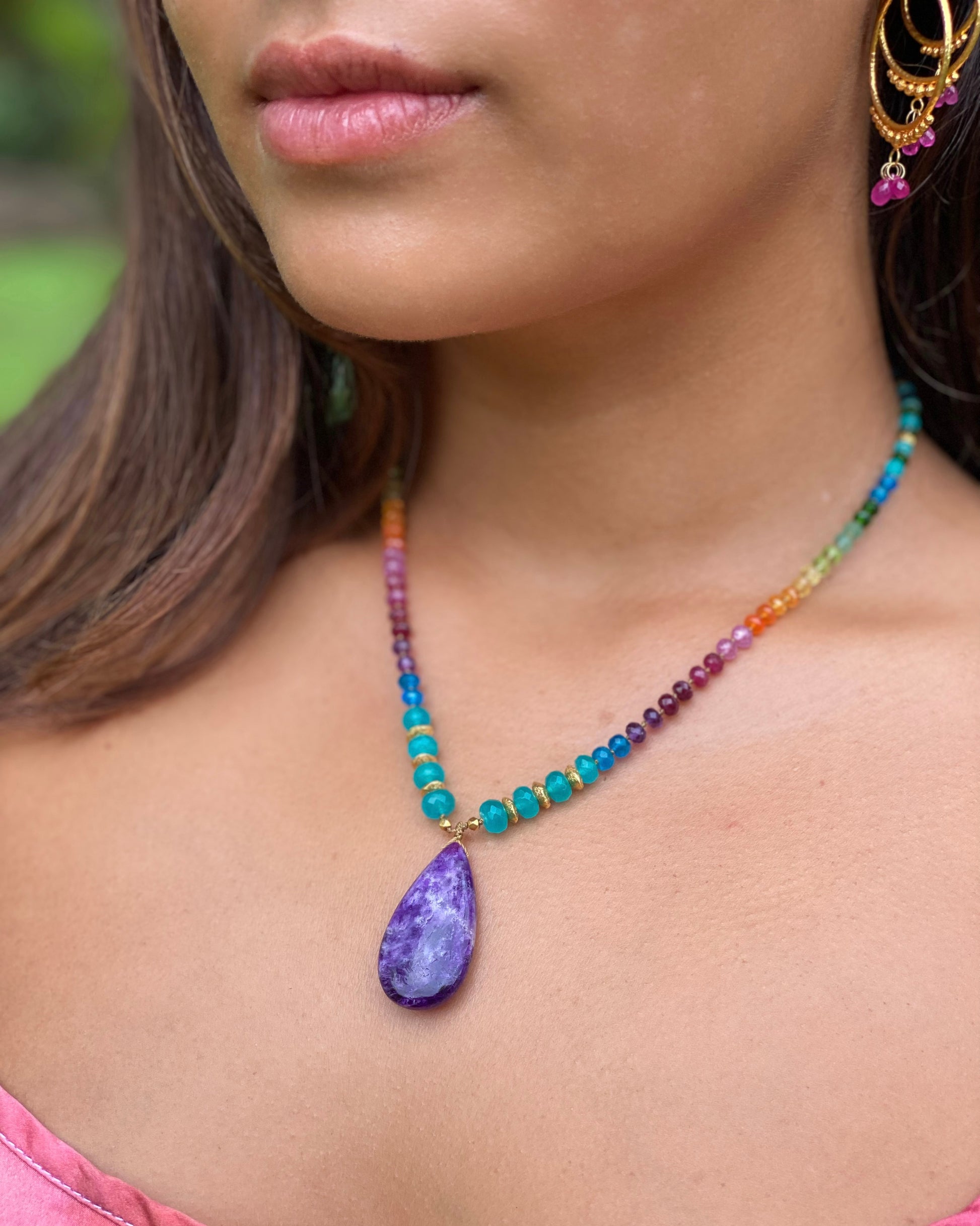 Inspired by the ethereal blessing of a rainbow as it breaks through the clouds in a show of light, the rainbow mana collection emanates an awe inspiring beauty that is food for the soul. Playing with the full light spectrum of color, these strands are saturated in rainbow hues featuring a substantial crystalline drop, making each a true power piece of resonant medicine. Like a deep base note, the rainbow mana collection brings depth, strengthening our inner vibration and heralding the abundance of our most radiant nature.