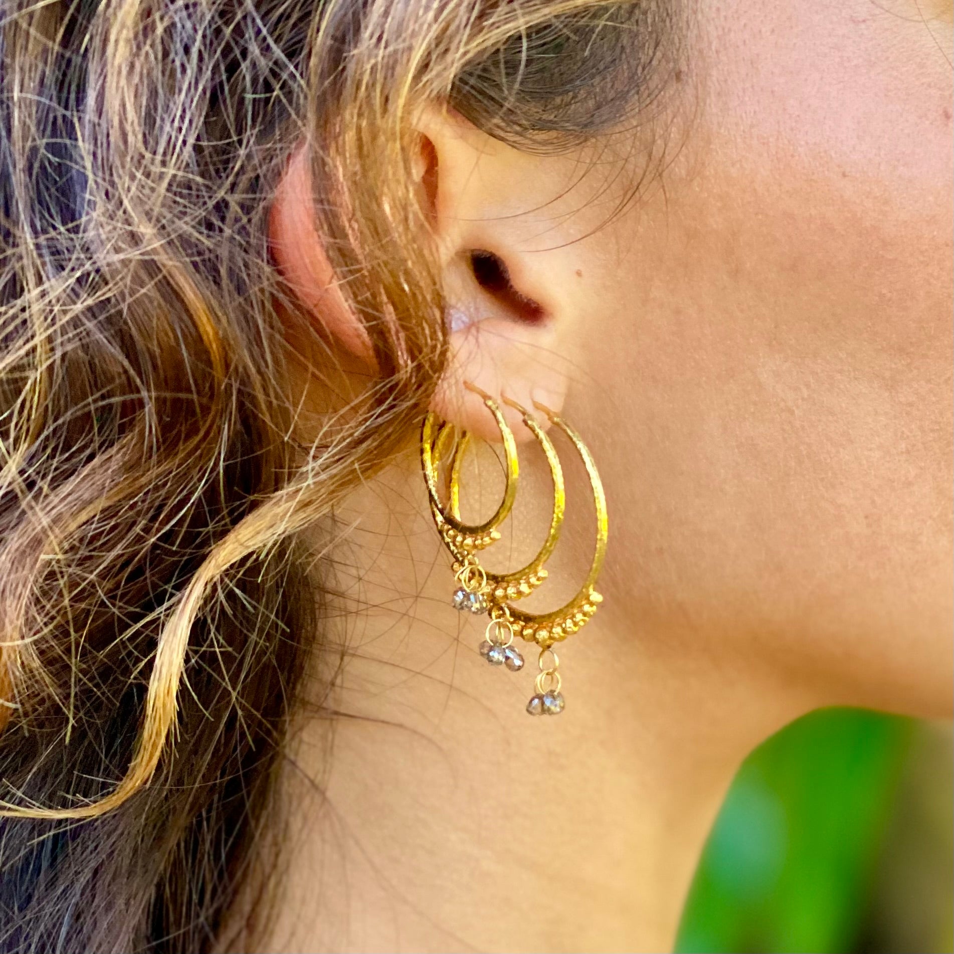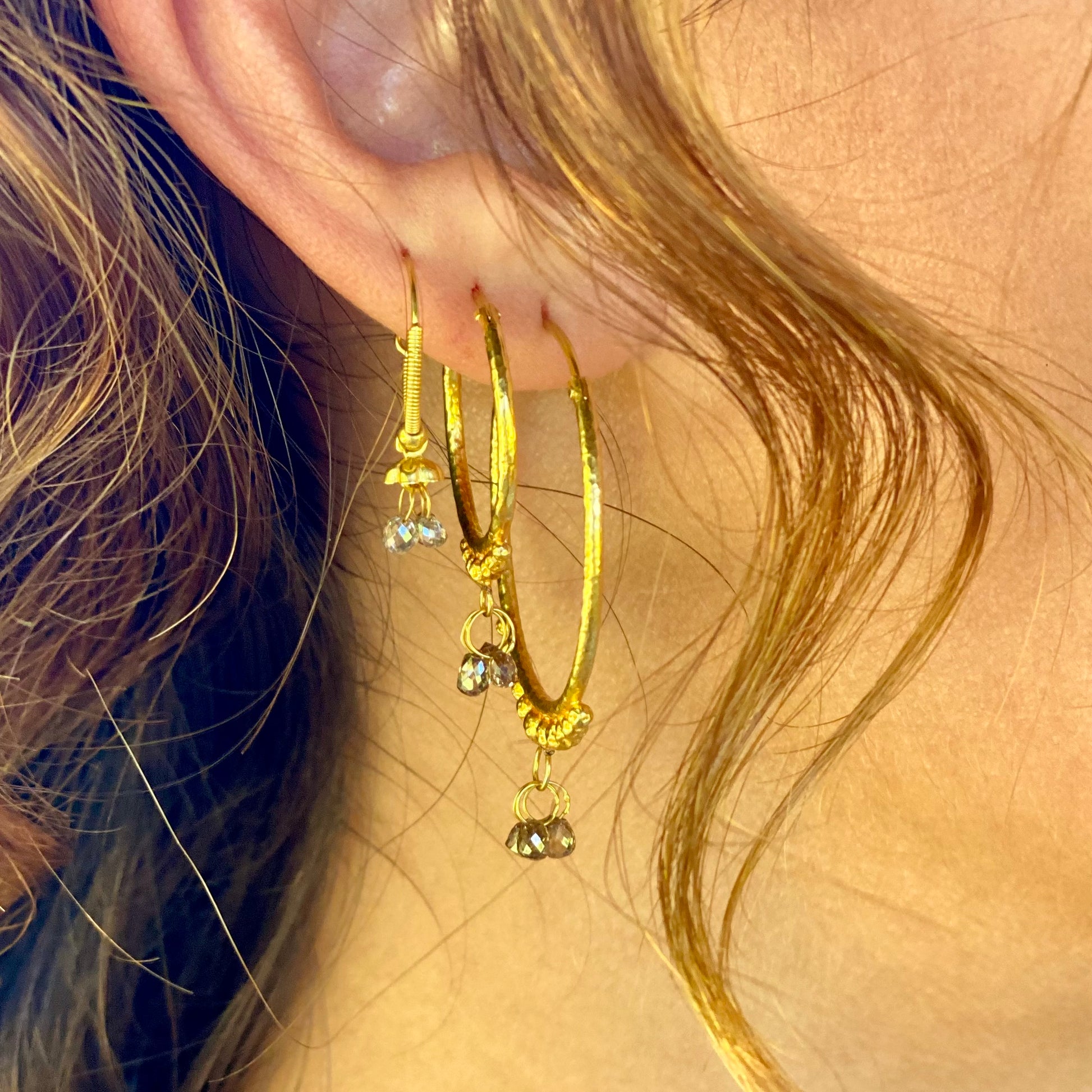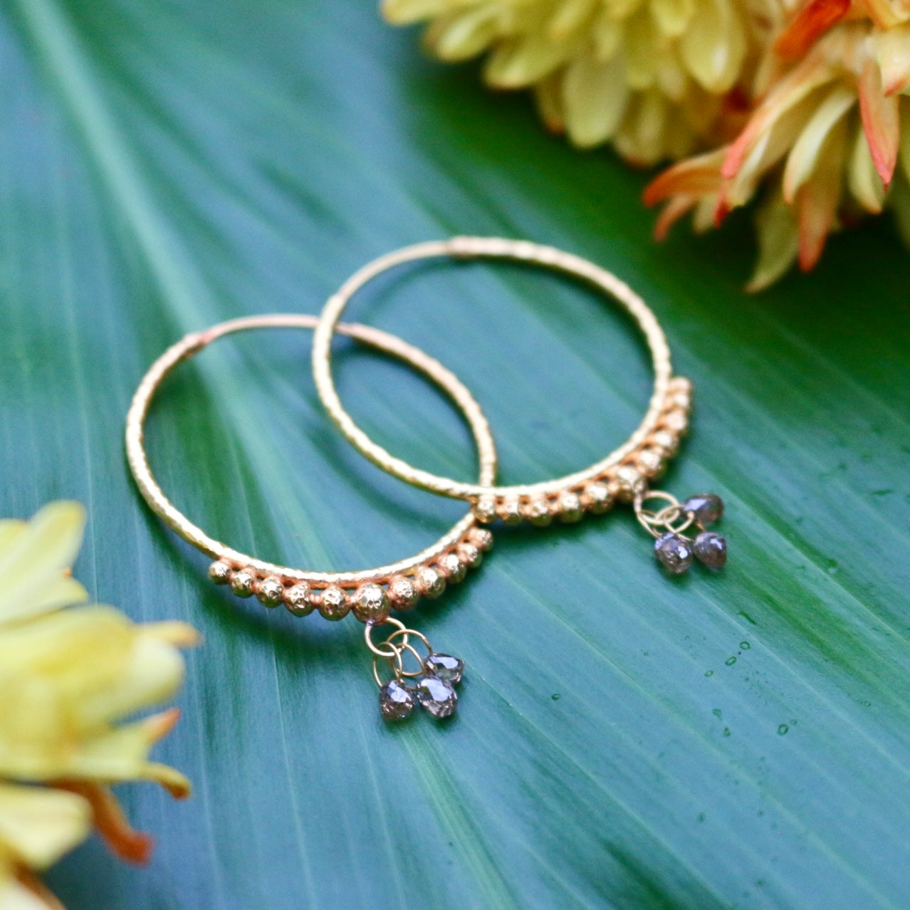 Hand-Hammered Golden Droplet Hoops with Dark Diamonds