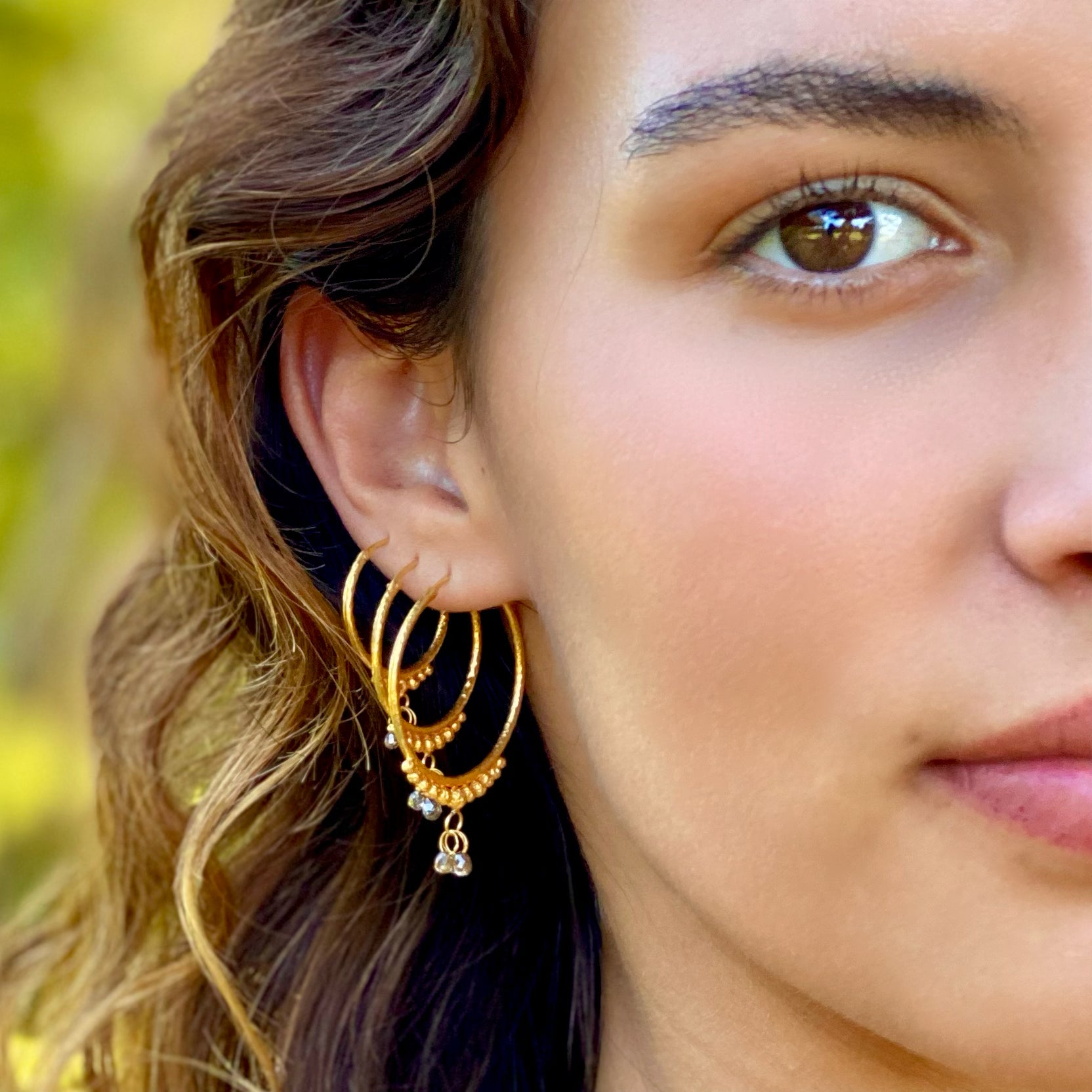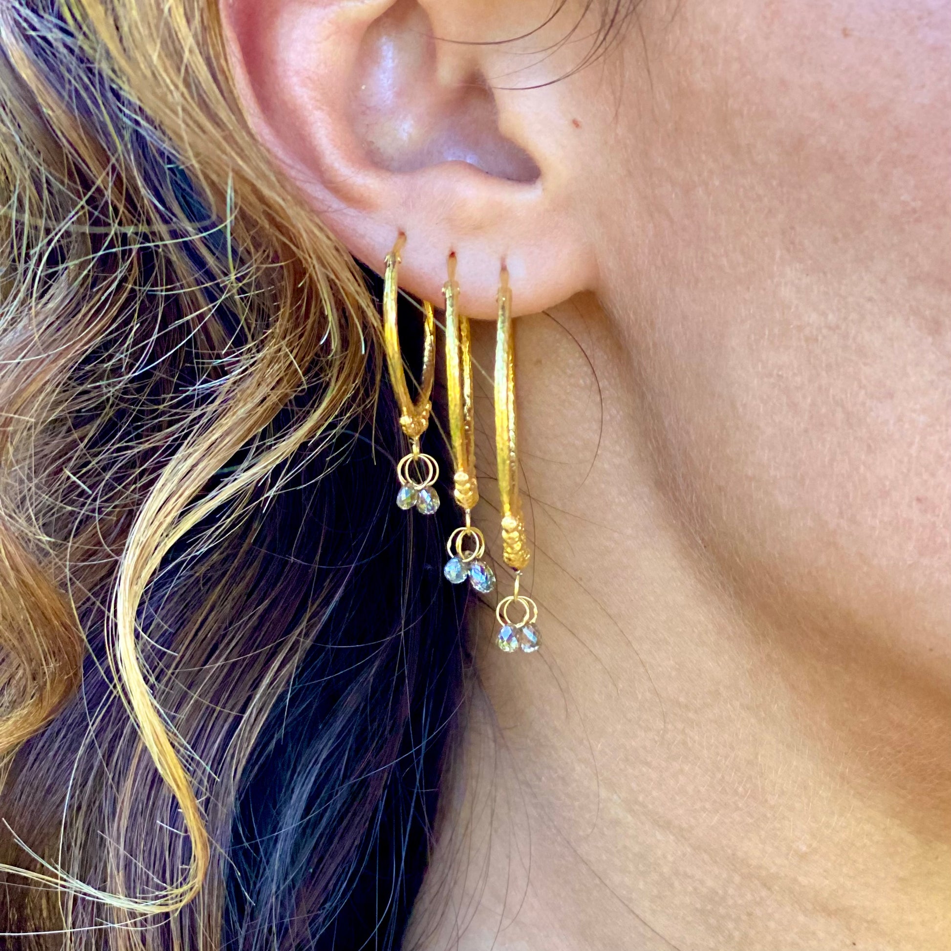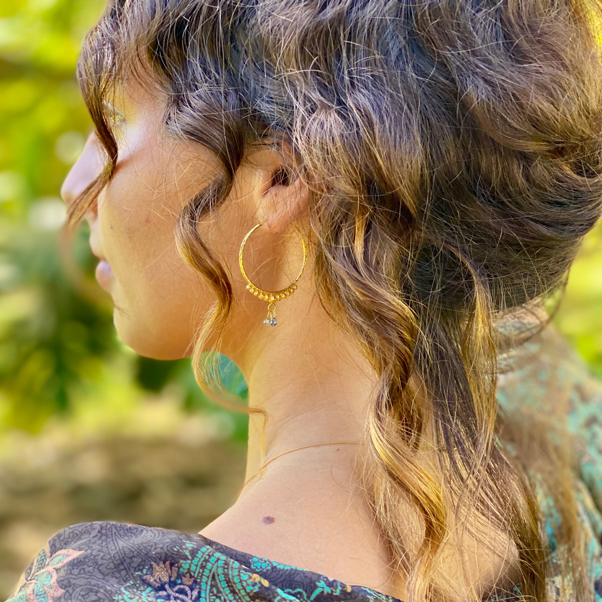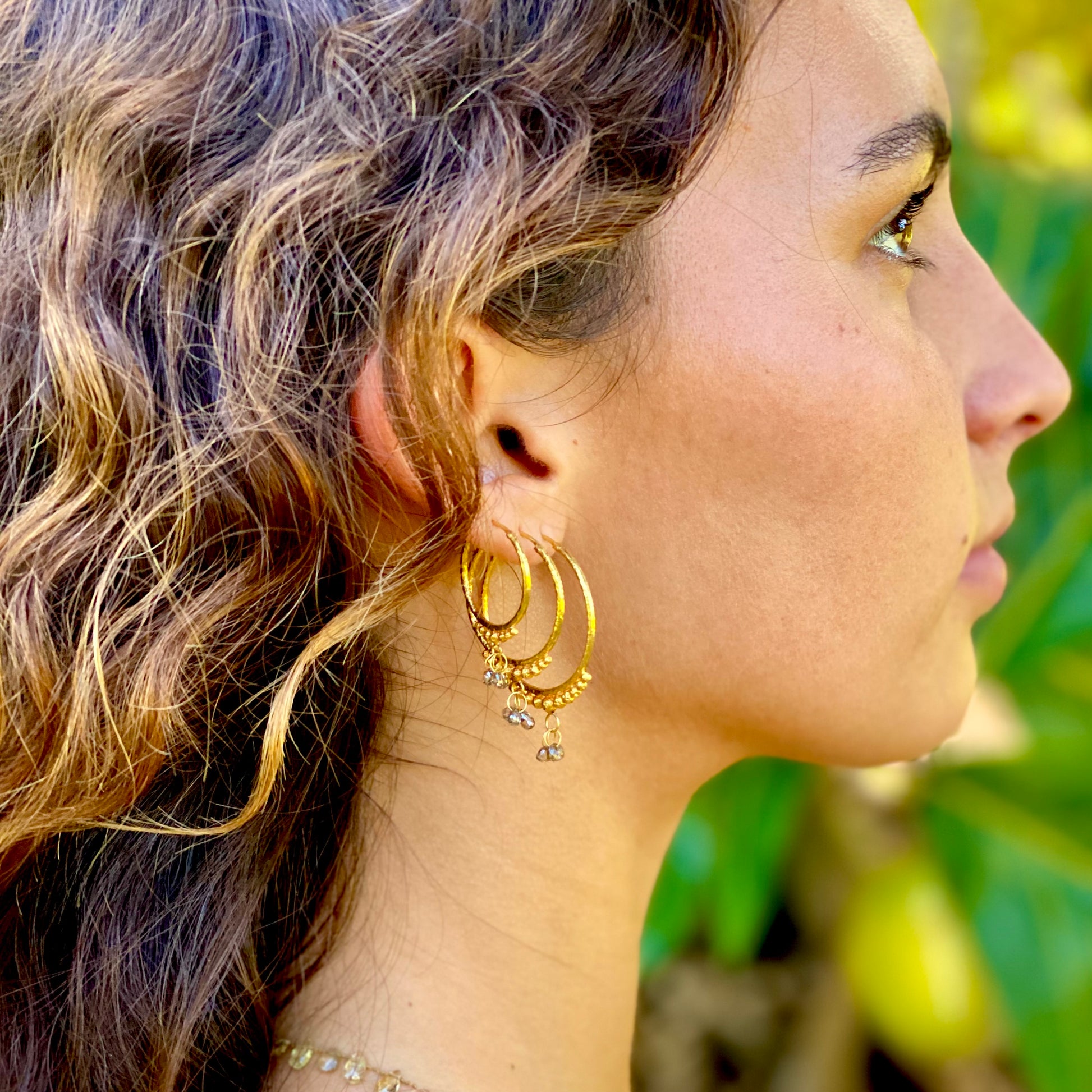 Hand-Hammered Golden Droplet Hoops with Dark Diamonds